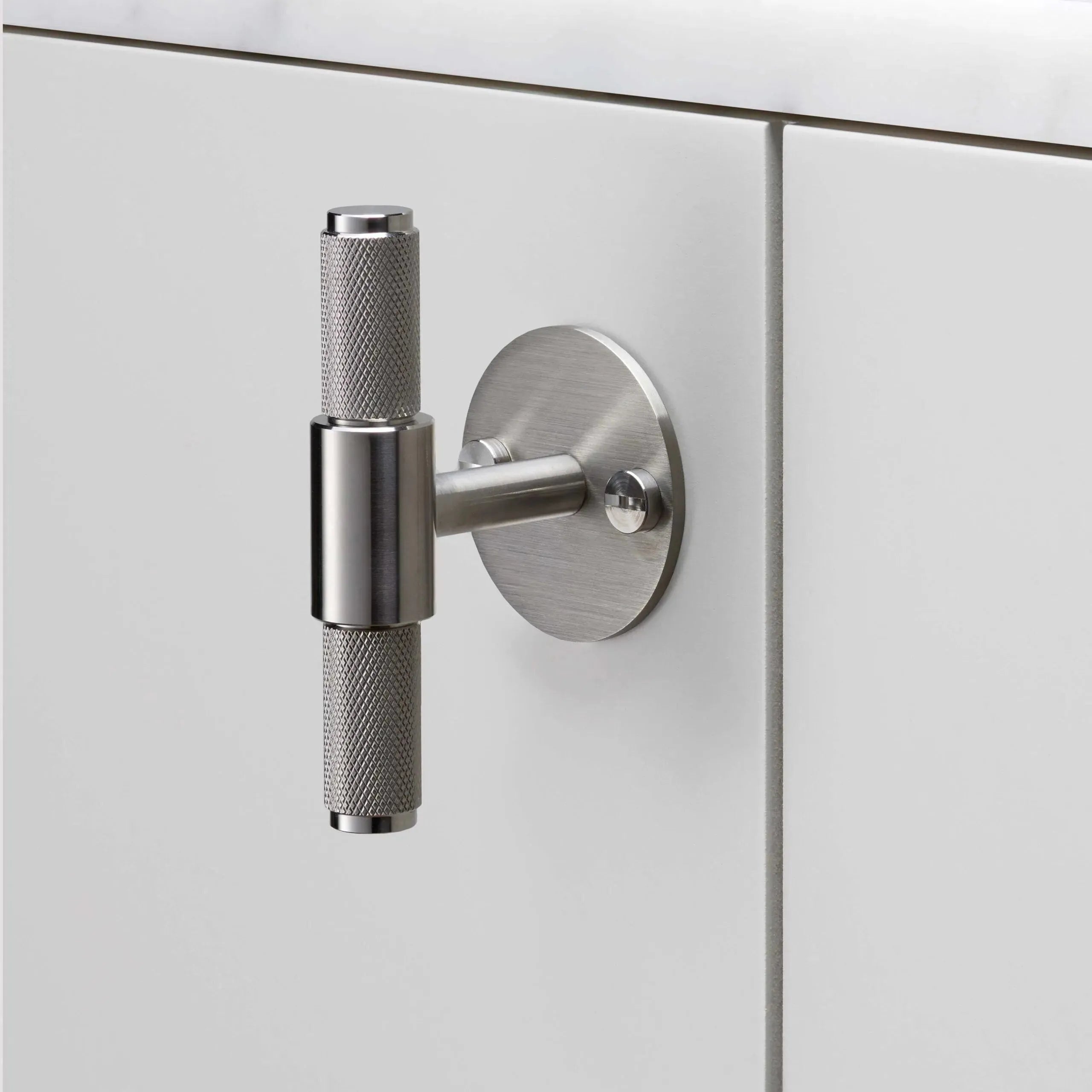 A T-bar made from solid black anodised metal. This T-bar features our signature, diamond-cut, cross-knurl pattern. It comes complete with a solid, black metal, circular backplate and is fixed with black coin screws.