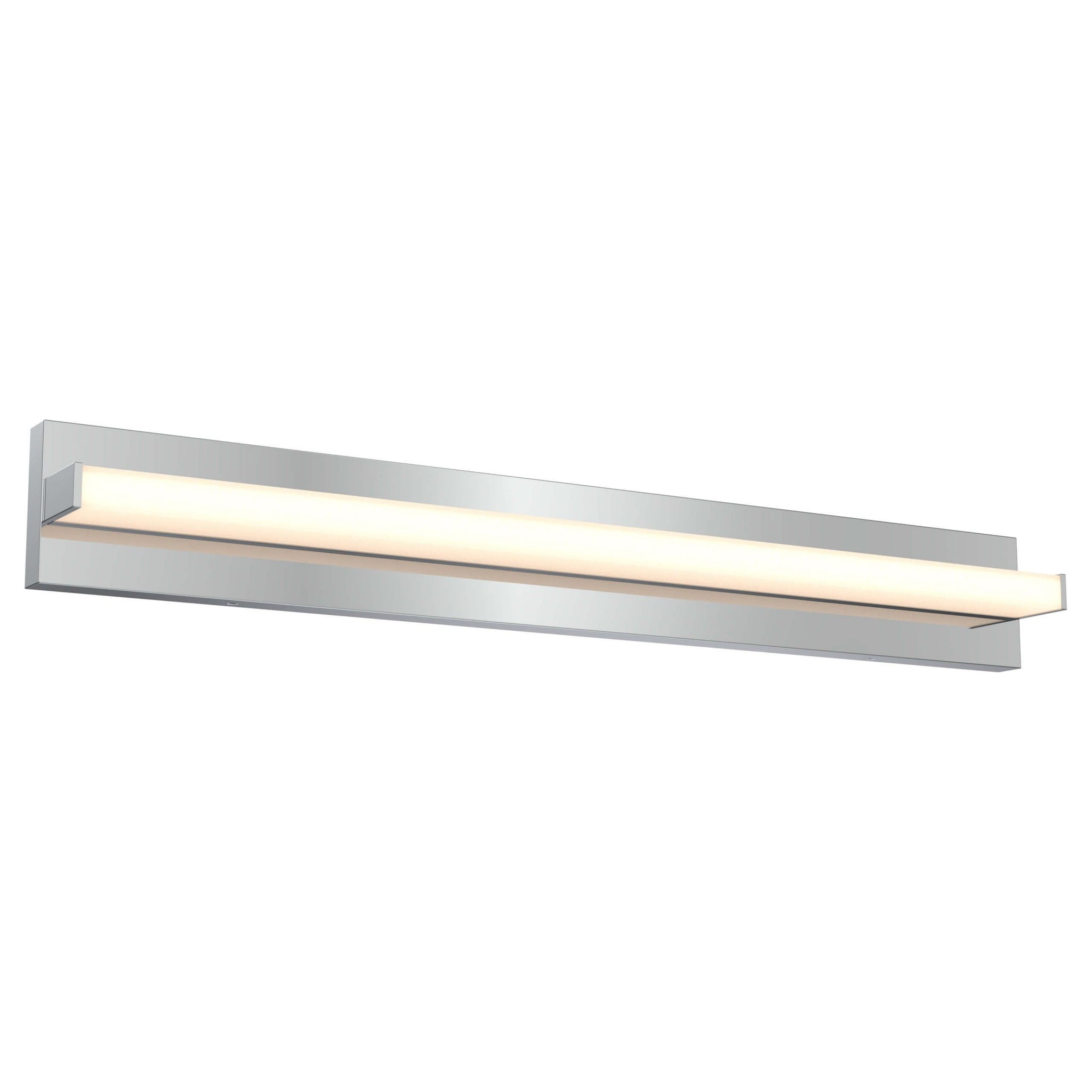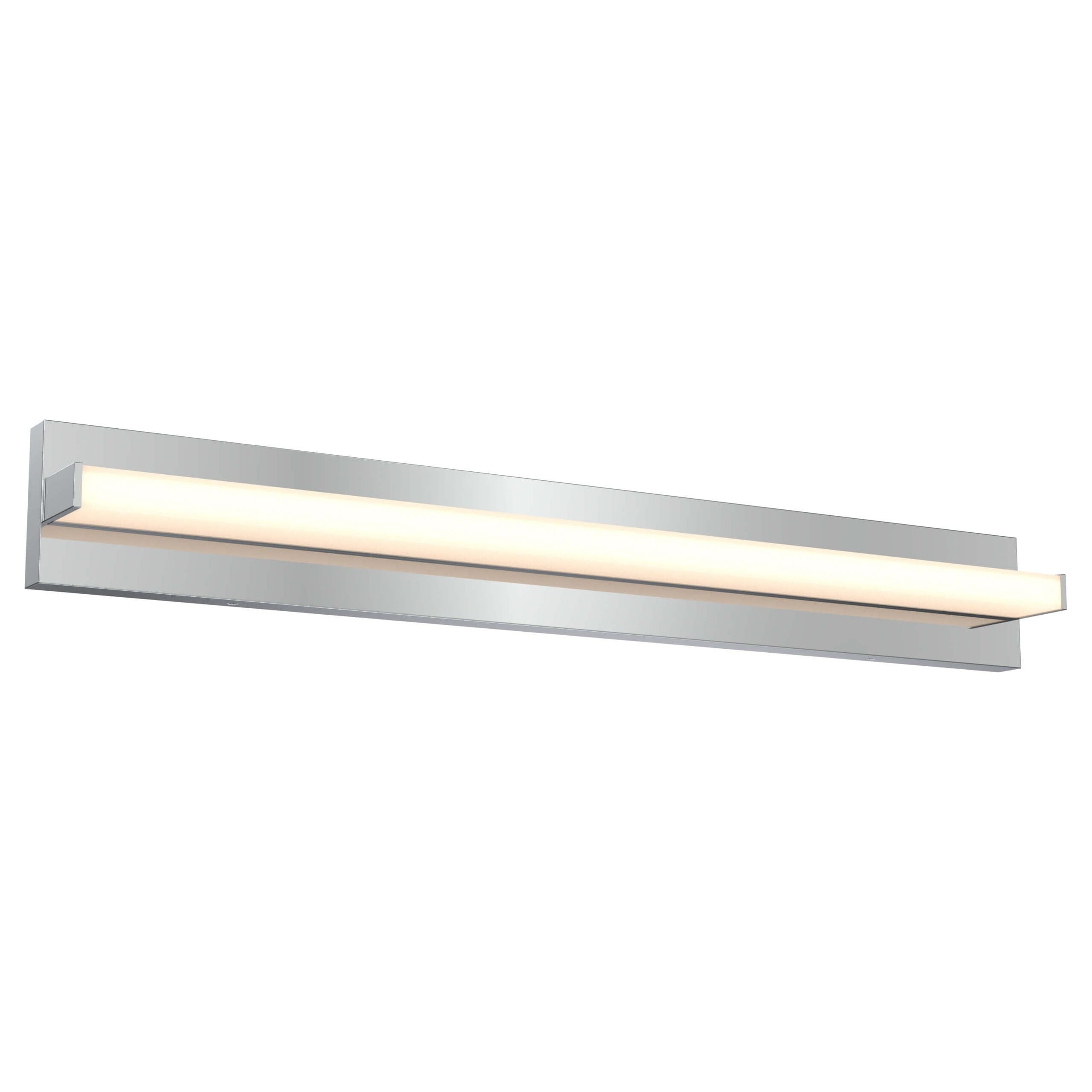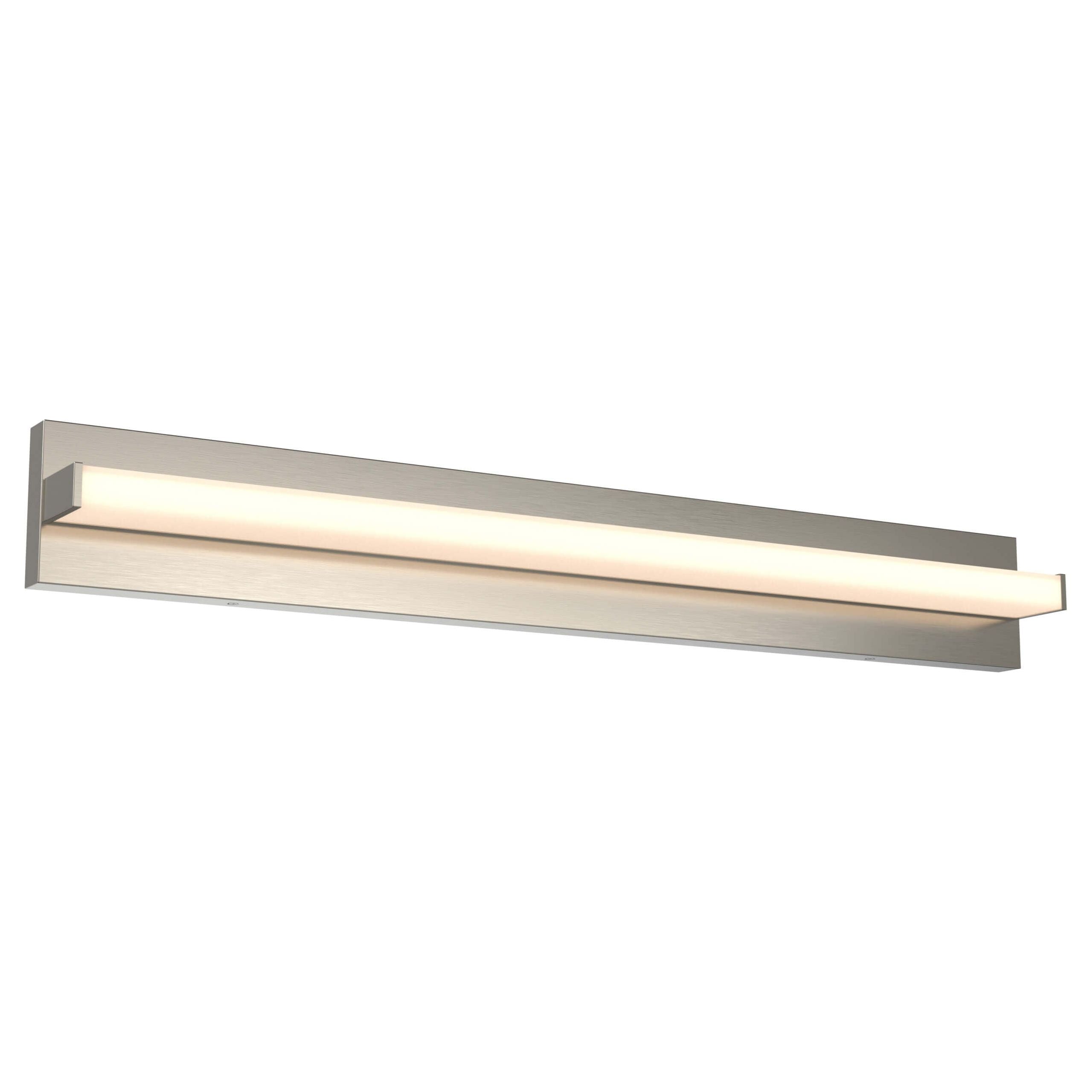 A sleek, high-quality LED vanity light with direct illumination, made from sturdy aluminum. Its streamlined linear design provides even, versatile lighting, perfect for modern spaces. The fixture can be offset from the electrical box by up to 9 1/2 inches to the left or right, allowing for easy alignment with existing elements such as a sink or mirror.