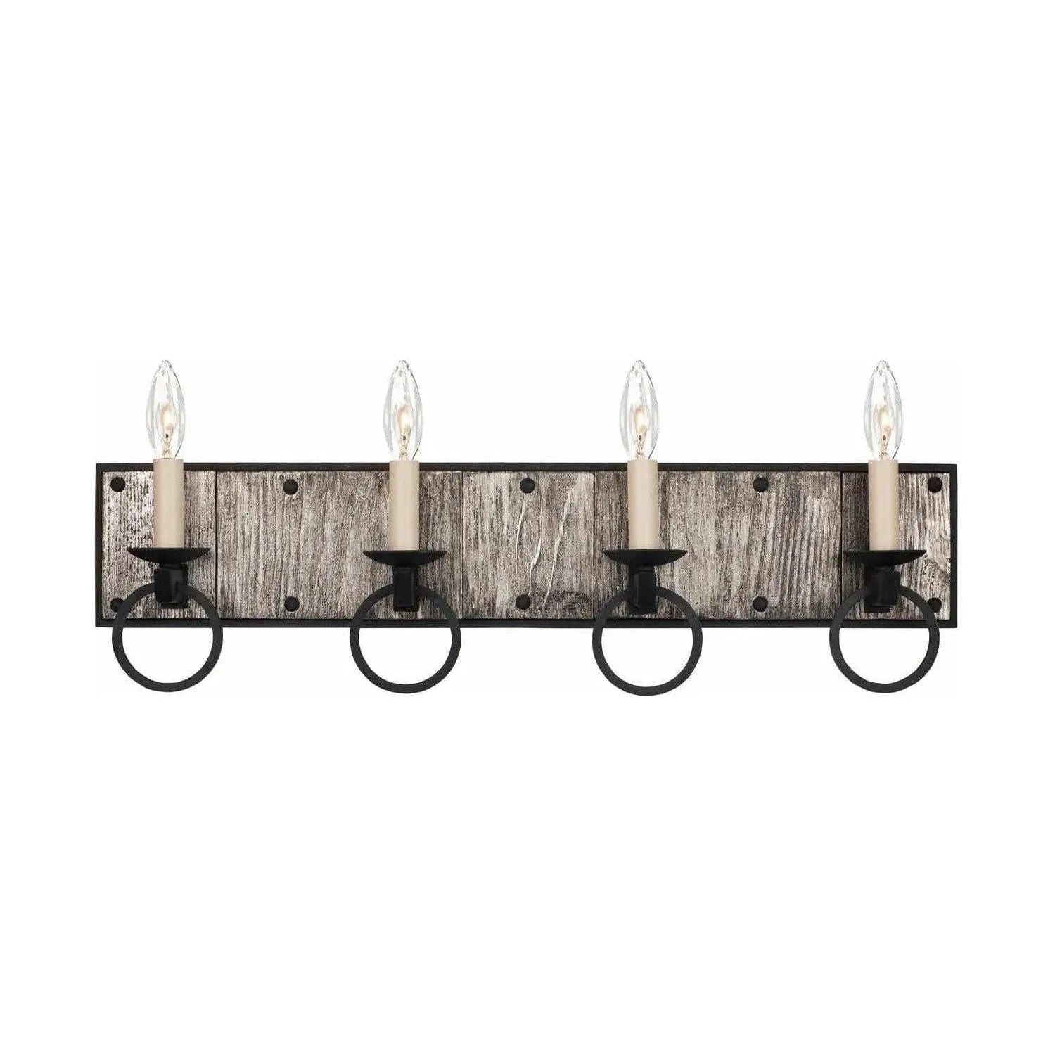 Modern Farmhouse inspired design with Black Iron ring and rivet hardware detail and finish featuring Burnt Silver Wood accents.