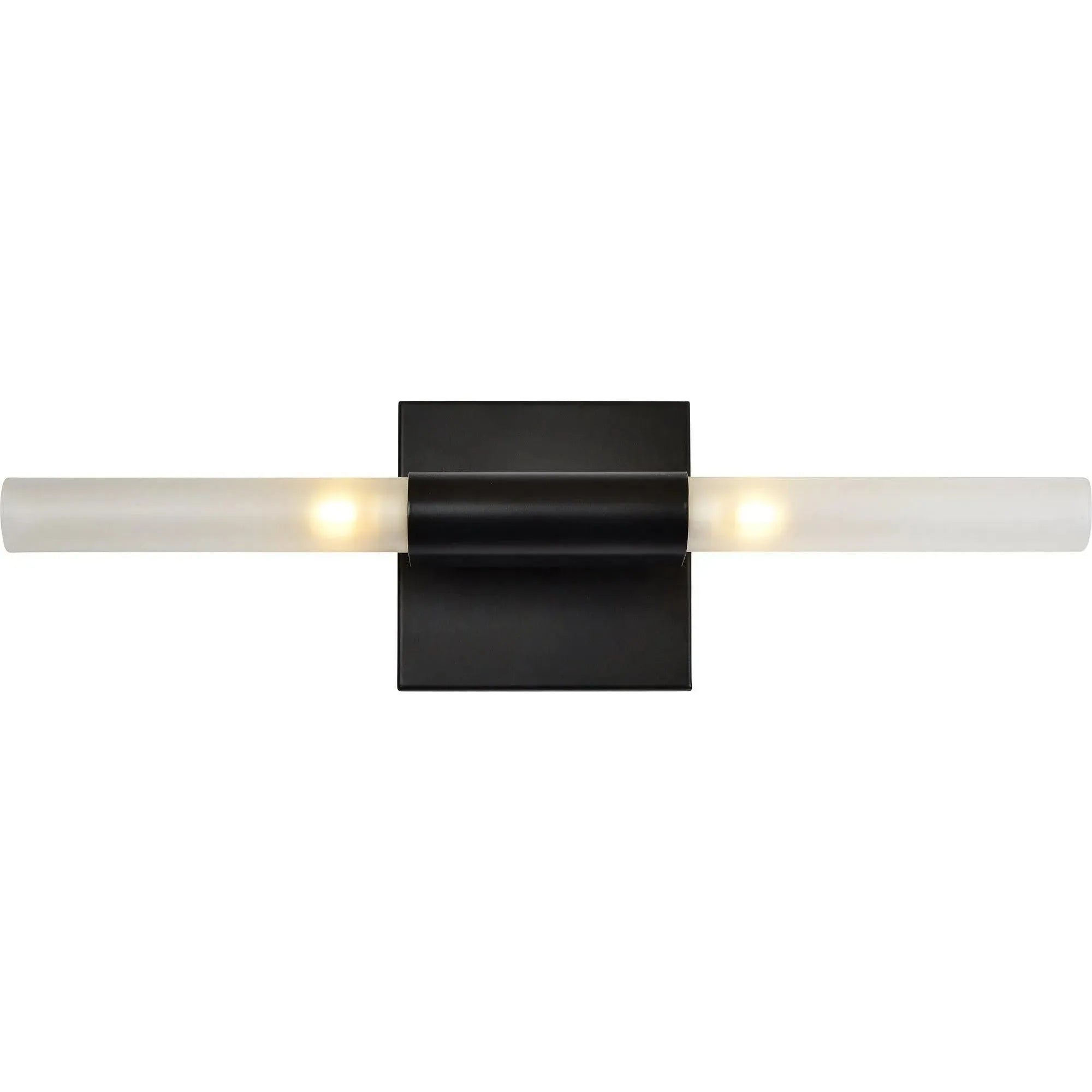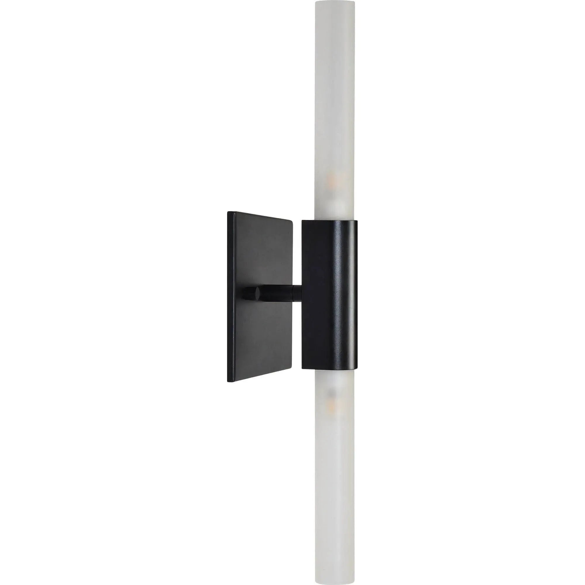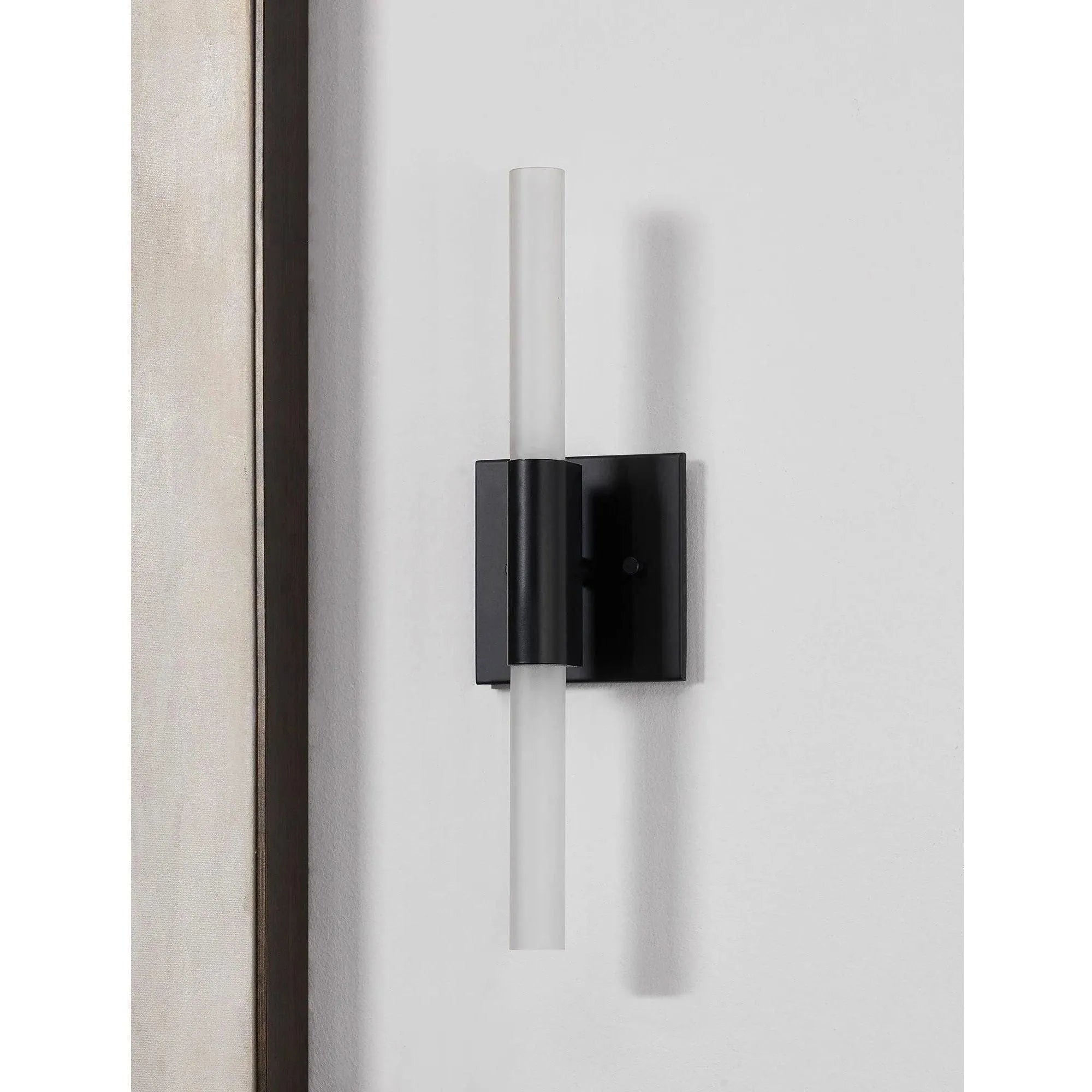 A narrow space in the home is filled with style and light with this sconce. The matte black painted iron structure lends itself well to the industrial interior, as the smooth angles feel fitting within a contemporary design as well. The etched white tubular glass has a soft quality when unlit and displays a warm glow when lit.