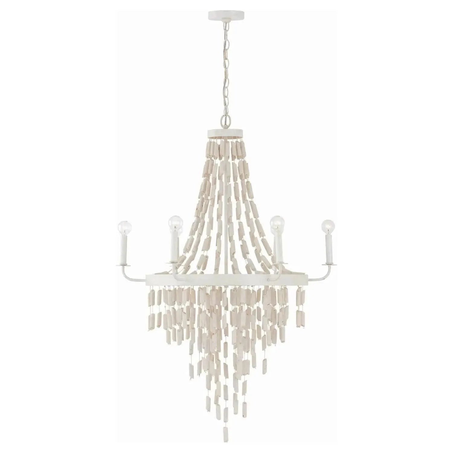 The Carissa 8-Light Chandelier fuses nature and artisan craft into a statement lighting piece. Cascading strands of white-washed eucalyptus wood are hand-finished with an Organic White paint, creating a luminous centerpiece that feels both earthy and refined. Each natural wood element is drilled and threaded onto white cotton rope, delivering texture, movement, and a warm, inviting glow.