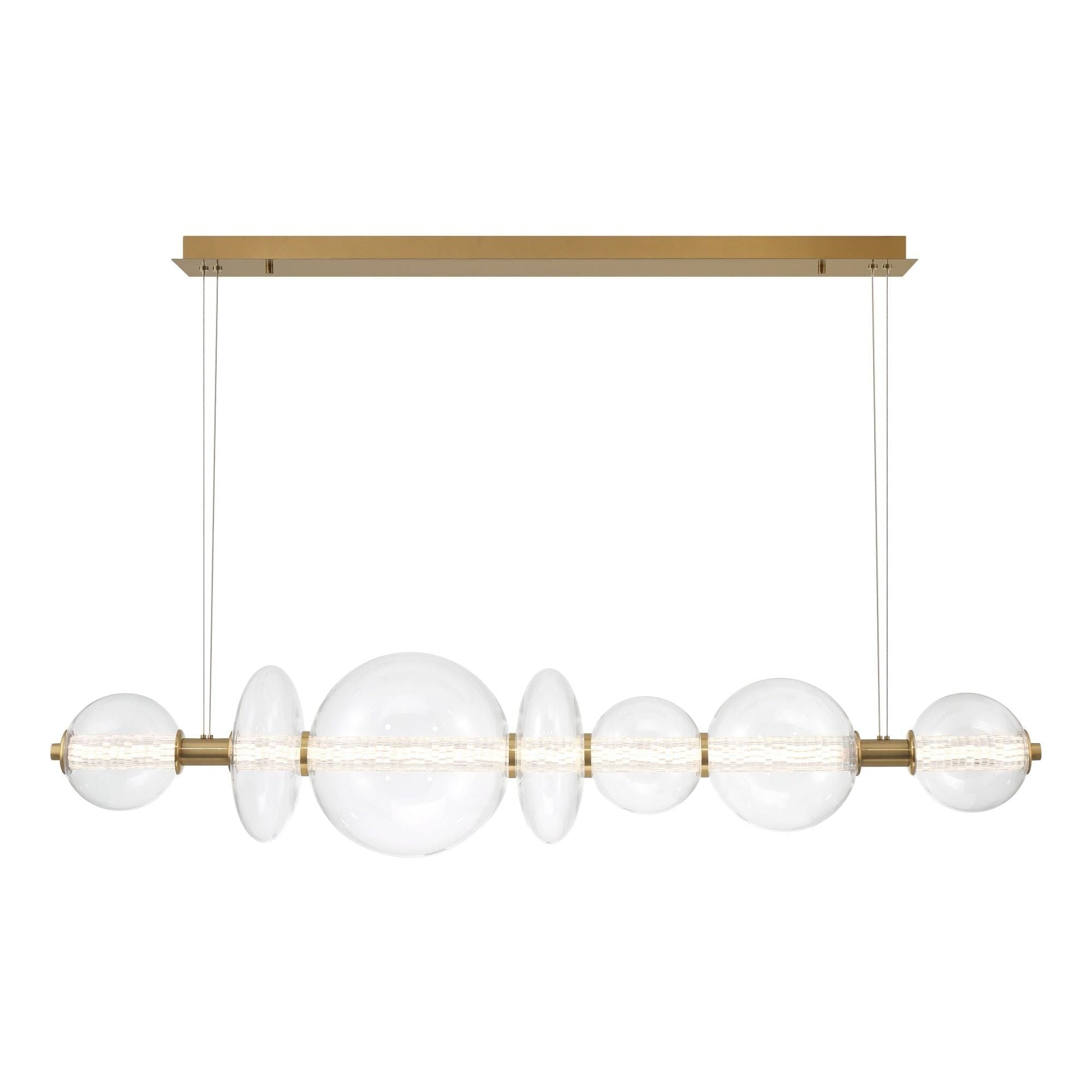 Atomo LED Chandelier by Eurofase — a sculptural, linear statement that fuses precise engineering with artful geometry. Clear glass globes and disc accents appear to float along a slender metal rod, creating a refined focal point for dining rooms, kitchen islands, or gallery-style interiors.