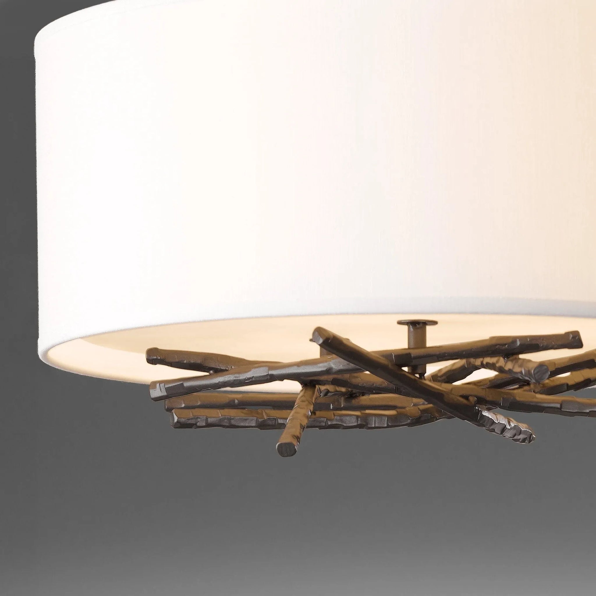 Sylvan meets steel with multi-faceted "twigs" forged from red-hot round bar stock hammered for texture and shape by our Vermont artisans. The twigs create the illusion of supporting the round drum shade that the sculpture hangs beneath.