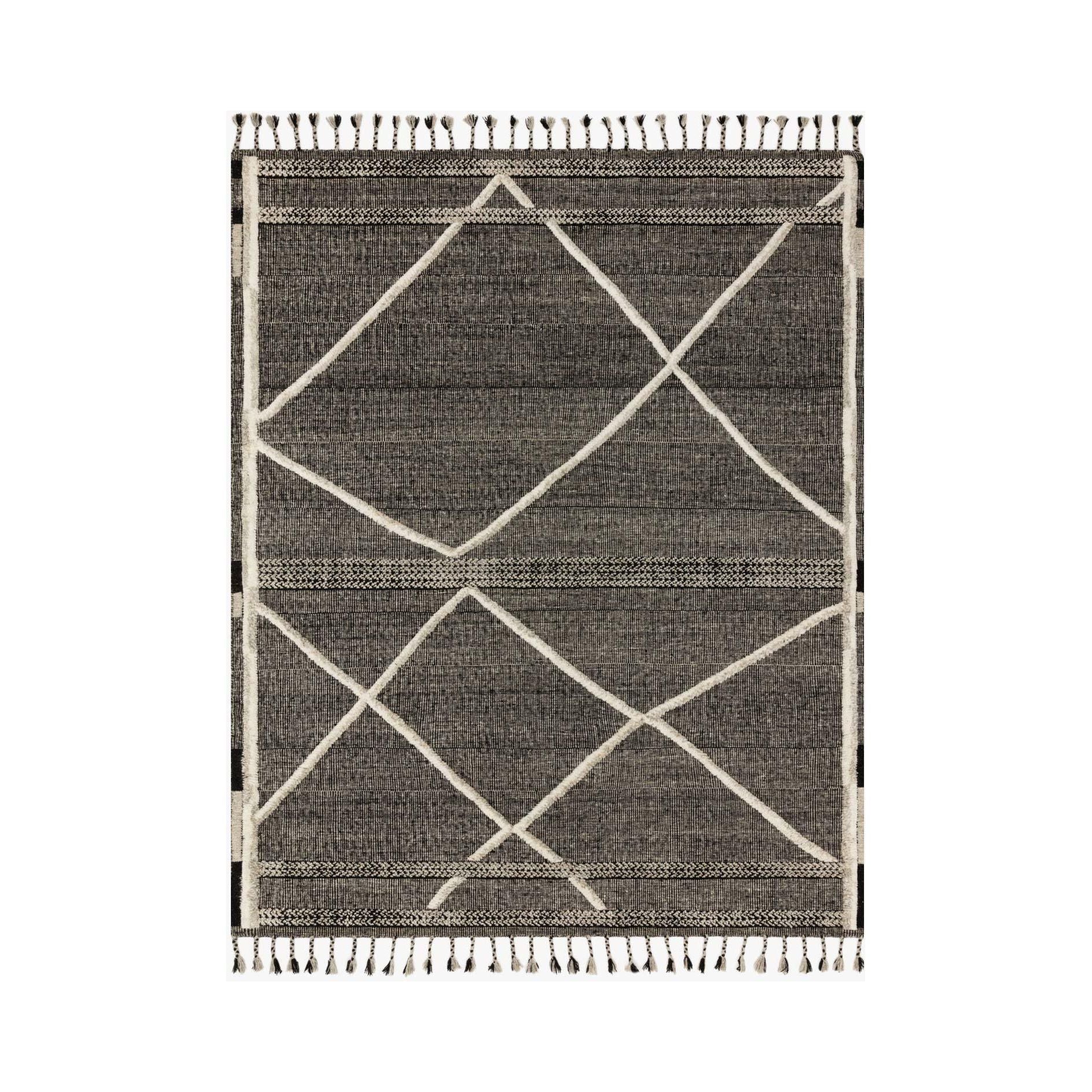 Iman Ima 02 Beige Charcoal rug, a modern interpretation of traditional Moroccan design. Hand-knotted with a luxurious 100% wool pile by expert artisans in India, each rug in the Iman Collection showcases intricate linear and braided patterns that result in unique tonal variations. To add a touch of whimsy, every design is adorned with playful fringe for a stylish finish.
