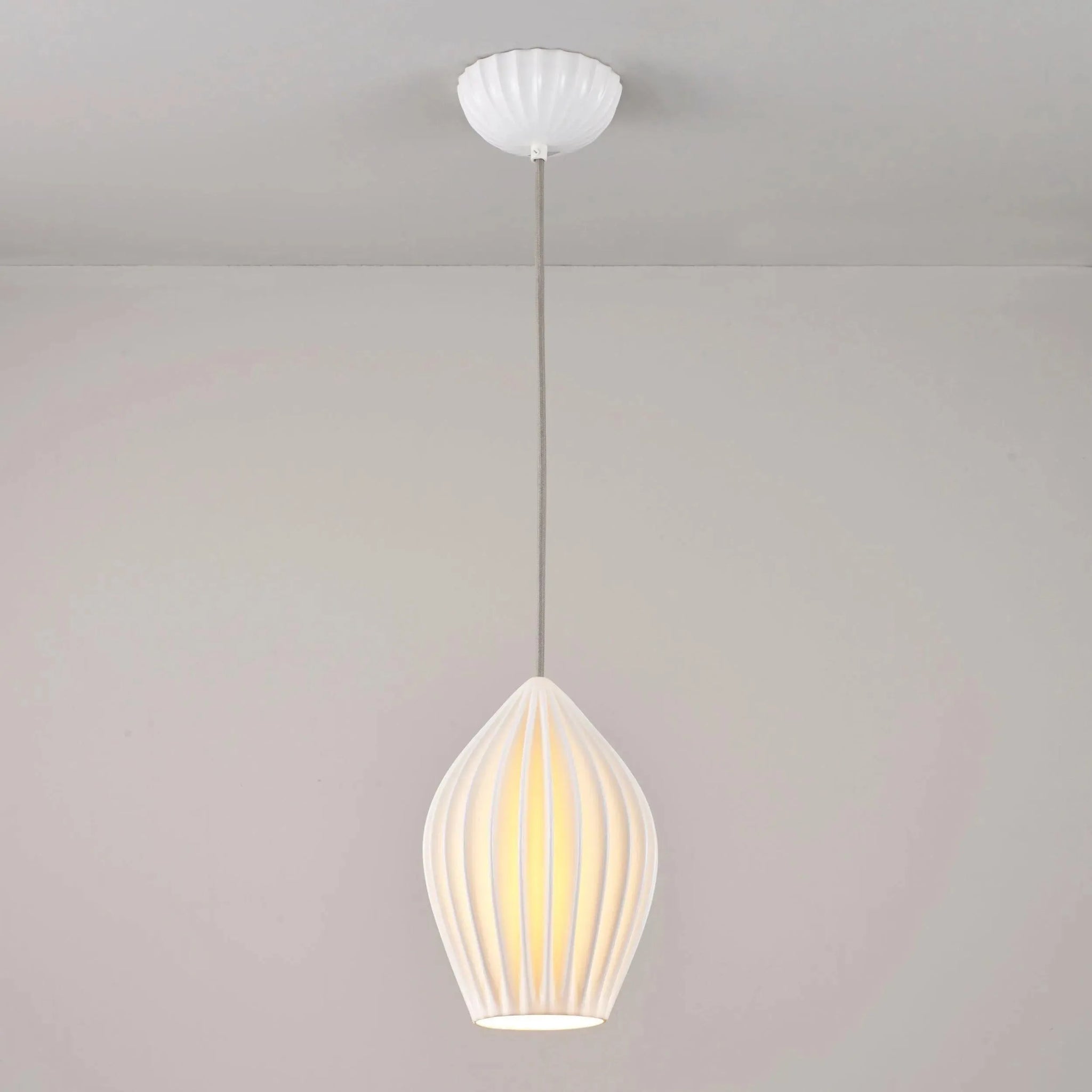The Fin is an eye-catching pendant light, with a bone china shade that has been moulded in to beautiful organic shapes, creating dramatic light and shade when lit. Available in three sizes, the lights are complemented by a unique matching bone china ceiling rose and our trademark cotton braided cable.