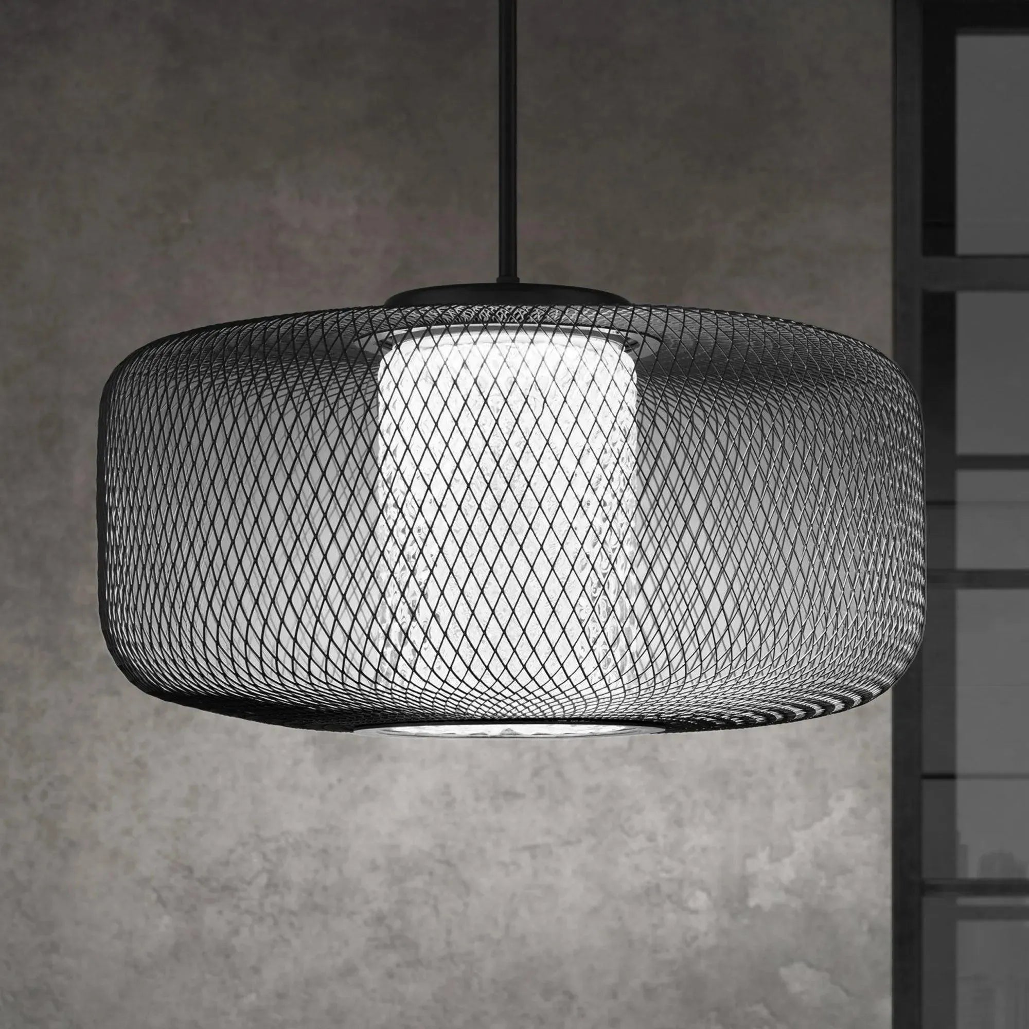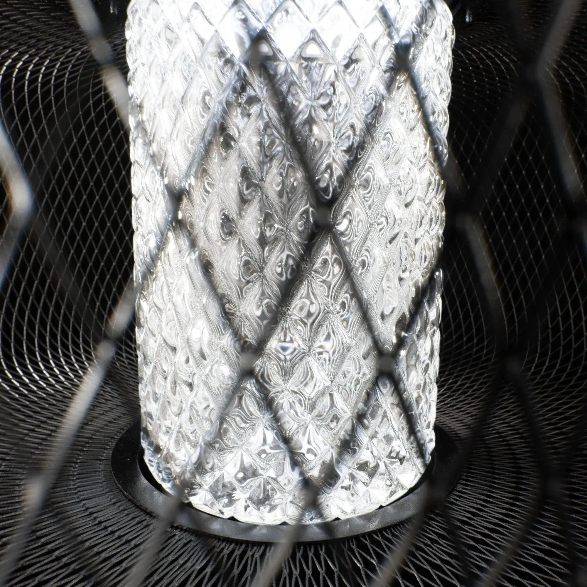 The crossroads of contemporary luxe design and midcentury modern. Enriched with a textured and layered look. The patterned aged brass thread diffuser suggests movement when viewed from different vantages. Unique in style, this generous form envelops a glowing handcut crystal diffuser.