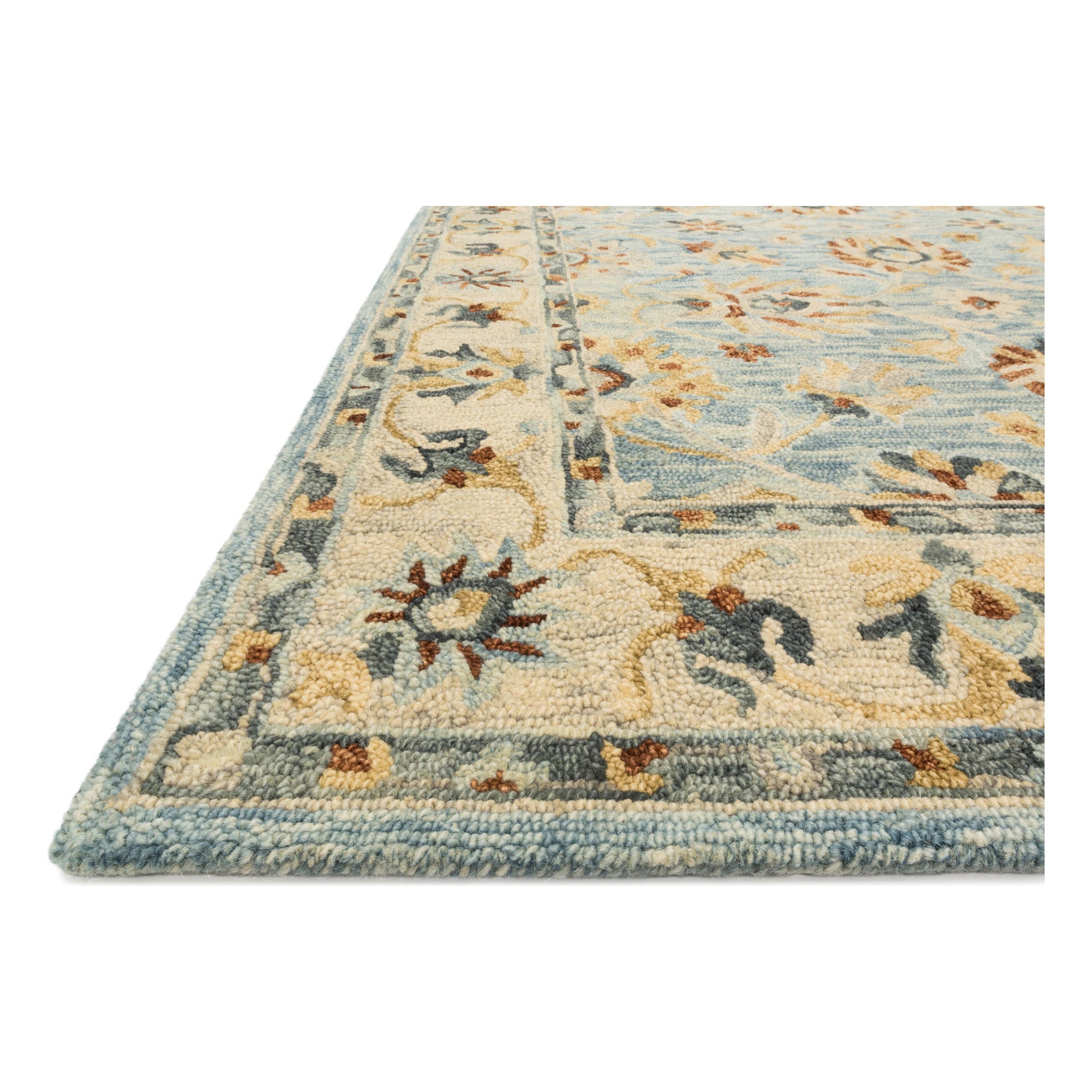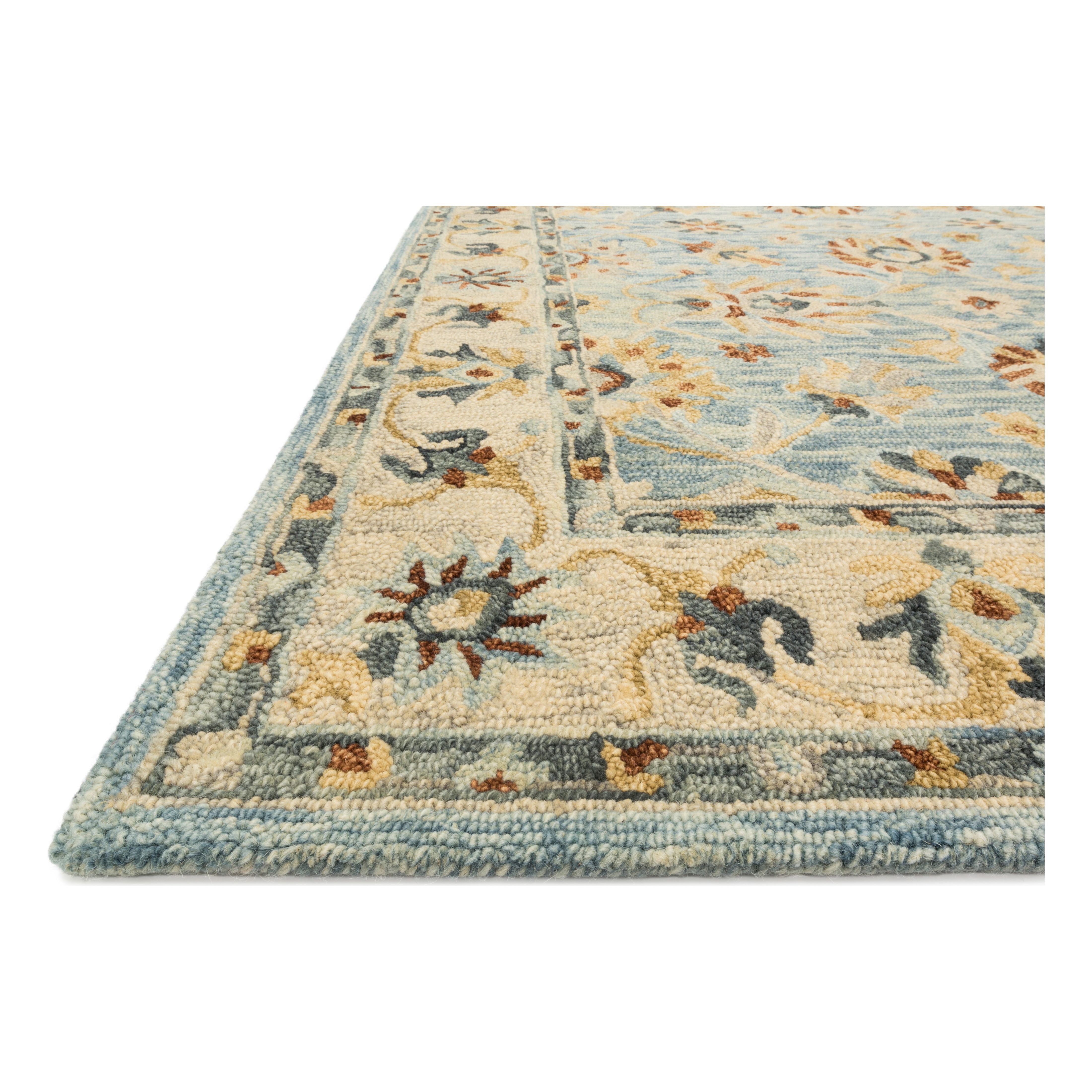 exquisite Victoria Vk 18 Lt Blue Natural rug from our Victoria Collection. Crafted with a blend of traditional patterns, textures, and soothing colors, this rug is a perfect addition to modern homes. Made from 100% wool and finely hooked, each design in the Victoria series features a unique looped texture that enhances its elegance and charm.