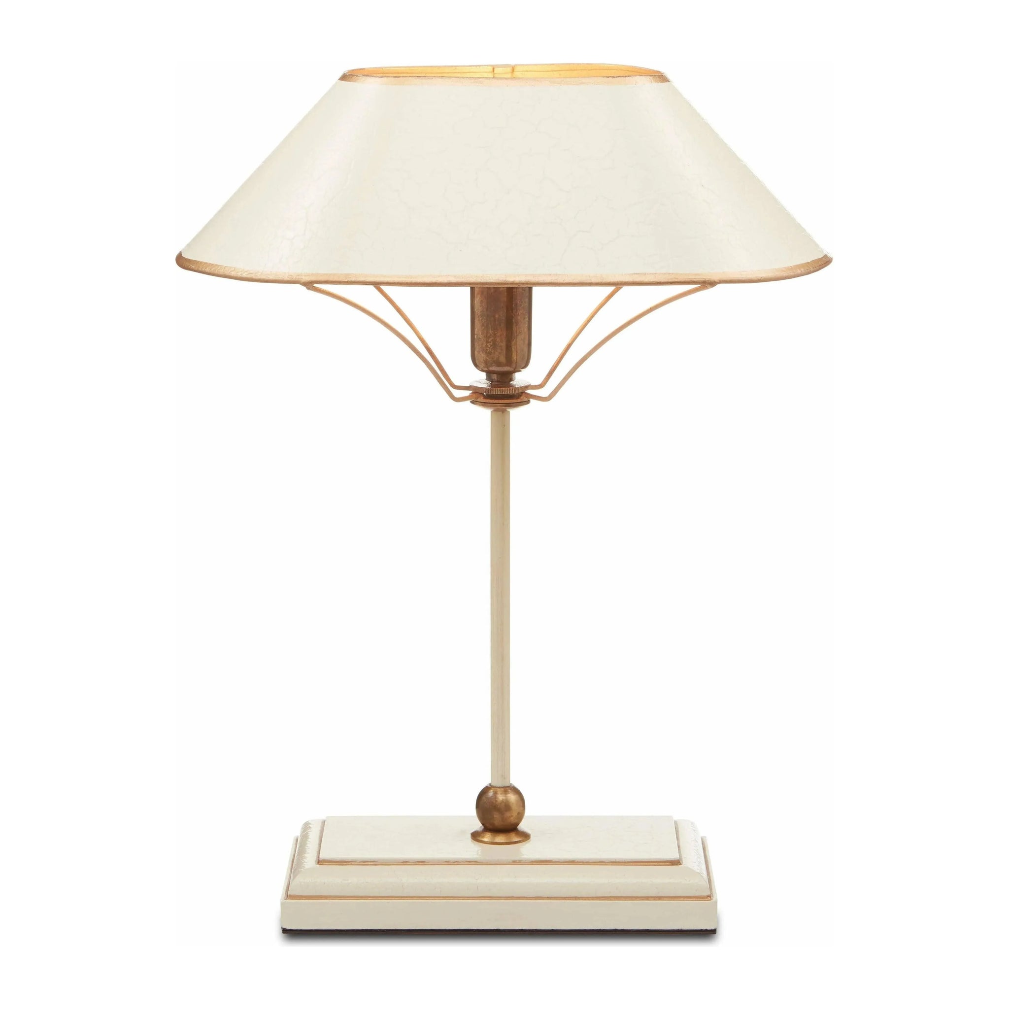 The Daphne Table Lamp looks as if it is made of one material in three distinctive finishes but the base is made of wood while the other elements on the ivory table lamp are made of wrought iron and brass in antique brass and gold finishes. The shape of the oval shade with its painted trim is a design detail worth noting.