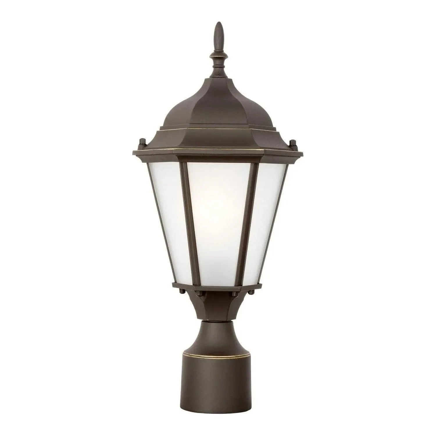 The Sea Gull Collection Bakersville one light outdoor post top in black enhances the beauty of your property, makes your home safer and more secure, and increases the number of pleasurable hours you spend outdoors. Bakersville outdoor lighting fixtures from Sea Gull Collection are made to complement a wide range of architectural styles. Each light is crafted from high quality, durable steel and aluminum to provide you sensible style that lasts. The large, 1-light outdoor wall lantern is offered in Heirloom Bronze with Satin Etched glass or Clear Beveled glass. The remaining assortment of wall lanterns in three sizes and a Flush mount ceiling fixture are offered in a Black Powder coat finish with Satin Etched glass (with ENERGY-STAR-qualified LED lamping options) or Clear Beveled glass (which can easily convert to LED by purchasing LED replacement lamps sold separately).