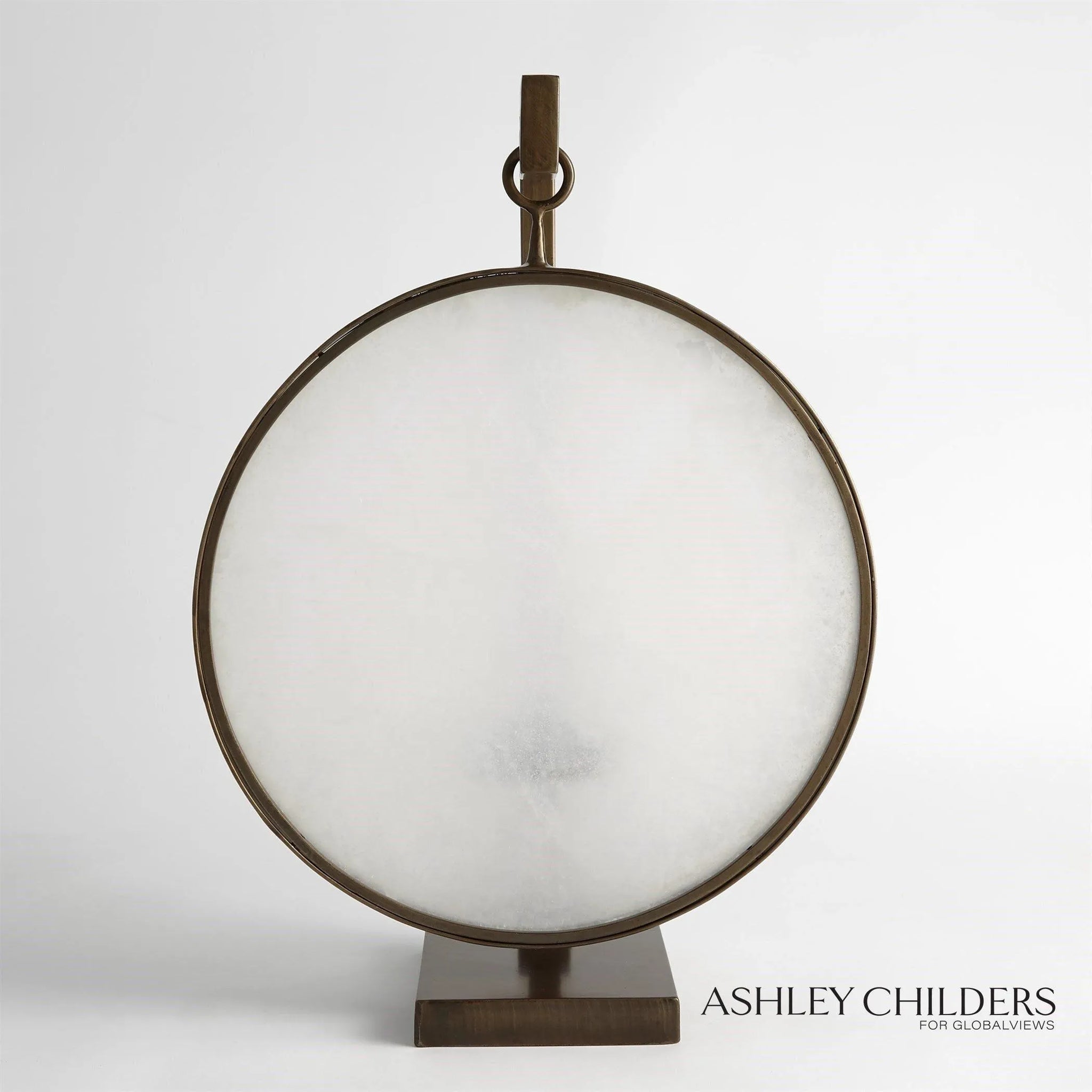 Anya Table Stand by Global Views is a sculptural accent that reads like modern hardware for luxury décor—an arresting circular form framed in a warm bronze ring, perched on a low rectangular base. The piece is designed to anchor curated interiors with quiet authority, balancing artful geometry and functional presence.