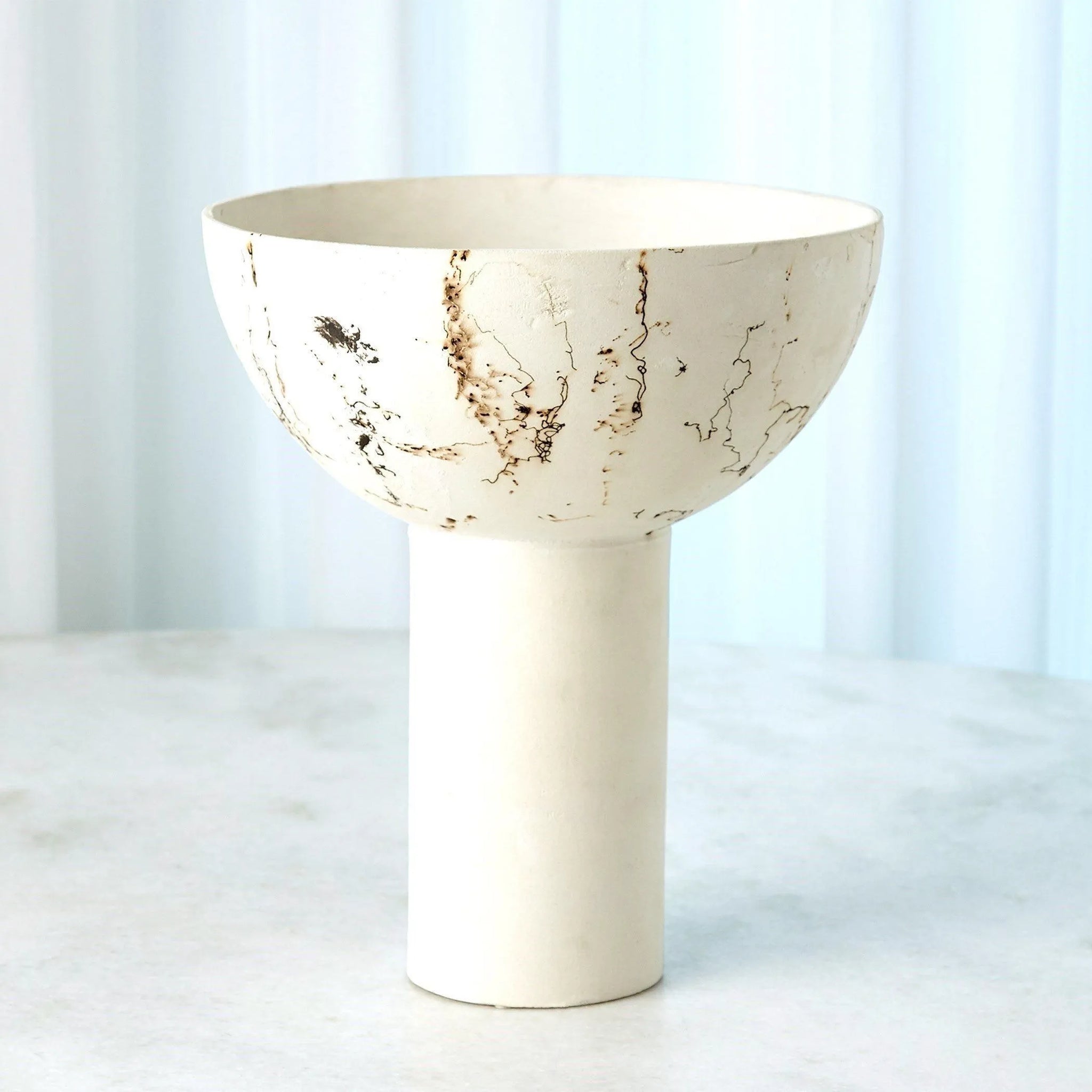 Artisan Horsehair Tall Bowl by Global Views is a sculptural, modern décor piece that reads as architecture for the tabletop. The tall, columnar base lifts a wide, hand-formed bowl whose matte, ivory surface is punctuated by organic carbon lines — the distinctive marks of the horsehair firing technique.