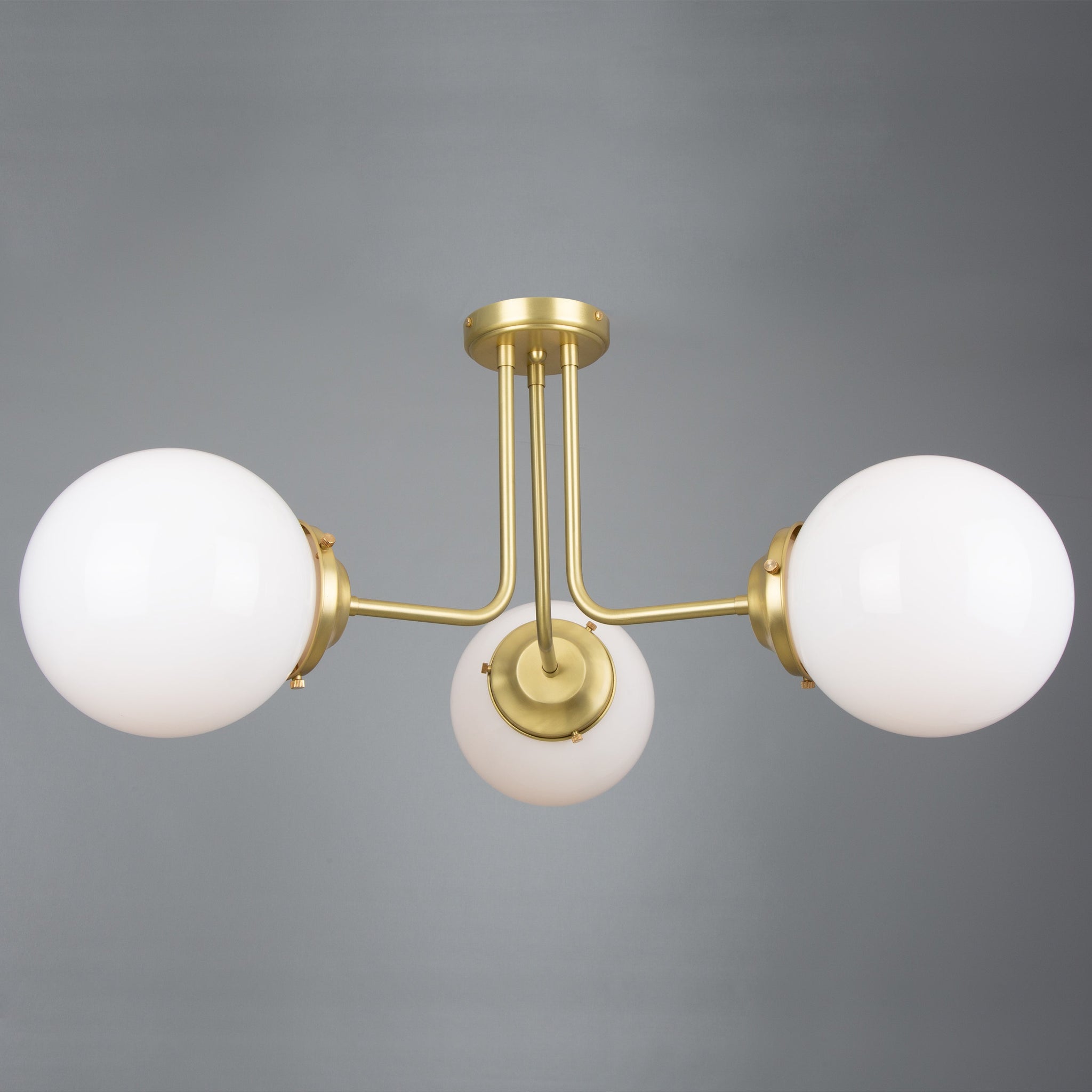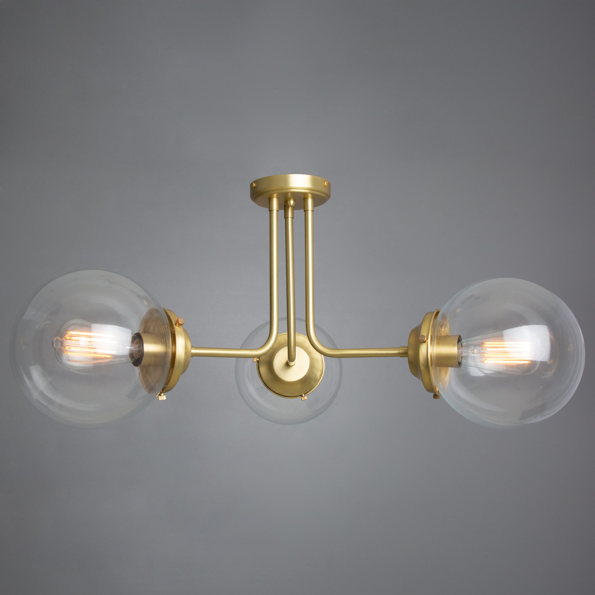 Hayes Ceiling Flush from Mullan Lighting pairs minimalist form with refined materials to deliver a sculptural, low-profile designer lighting solution. The three-arm flush mount features slender brass stems, precision-machined fittings and clear blown glass globes that expose the bulb—an intentional choice for layered, atmospheric illumination.