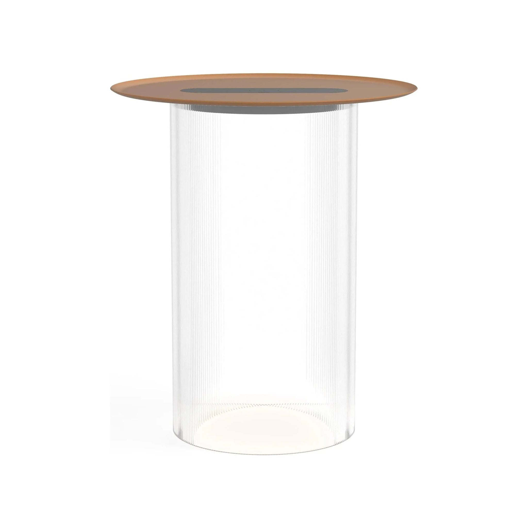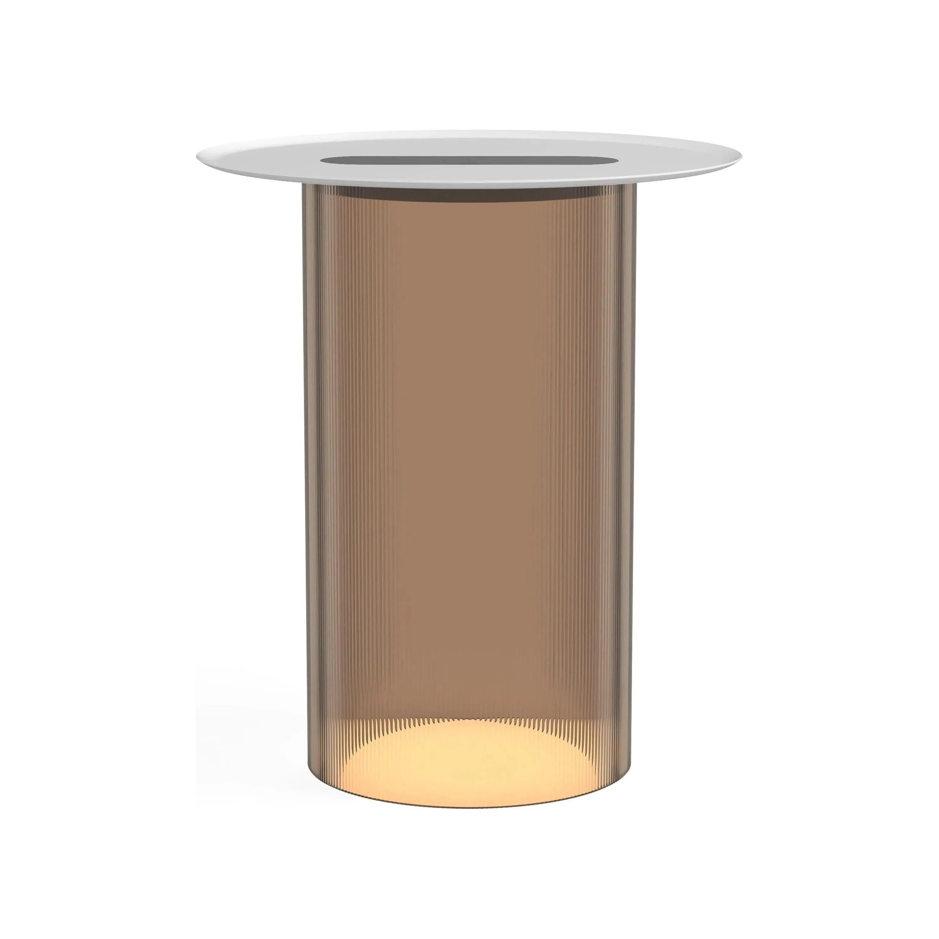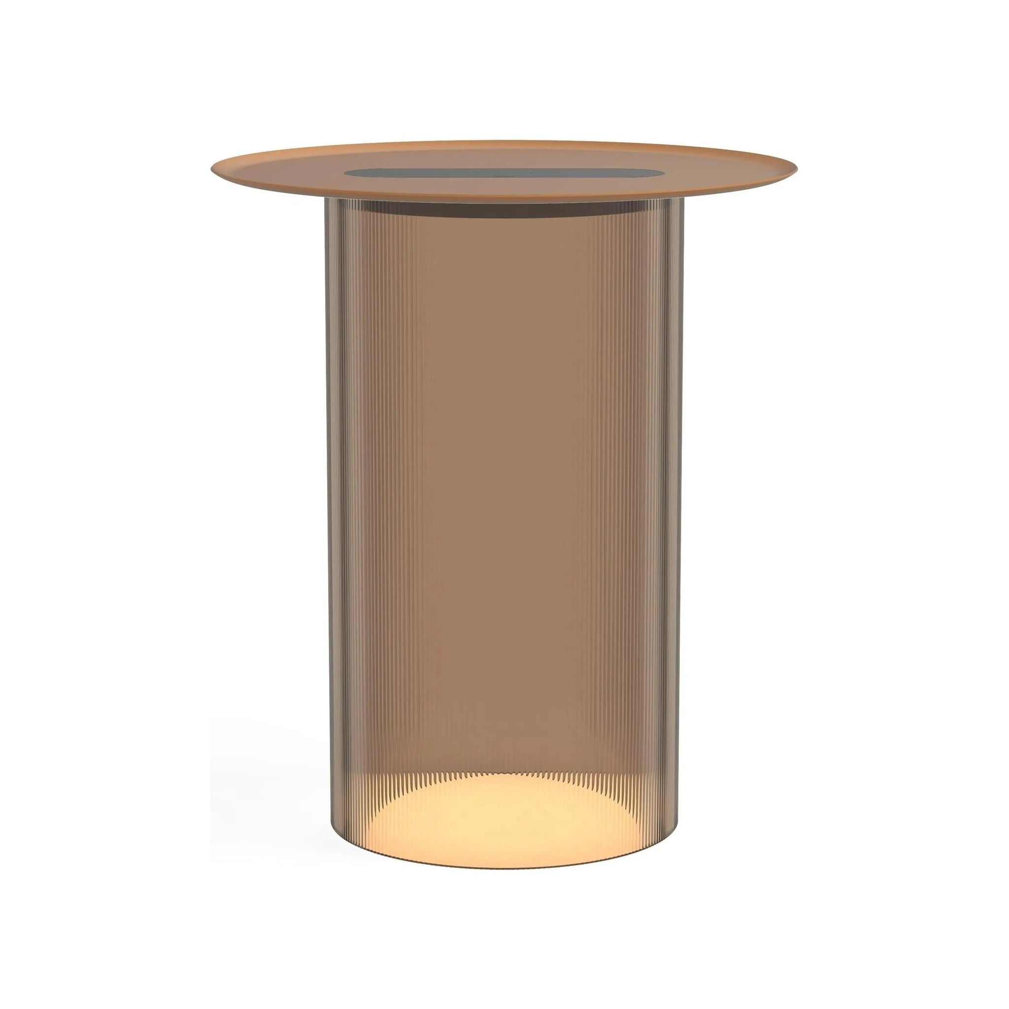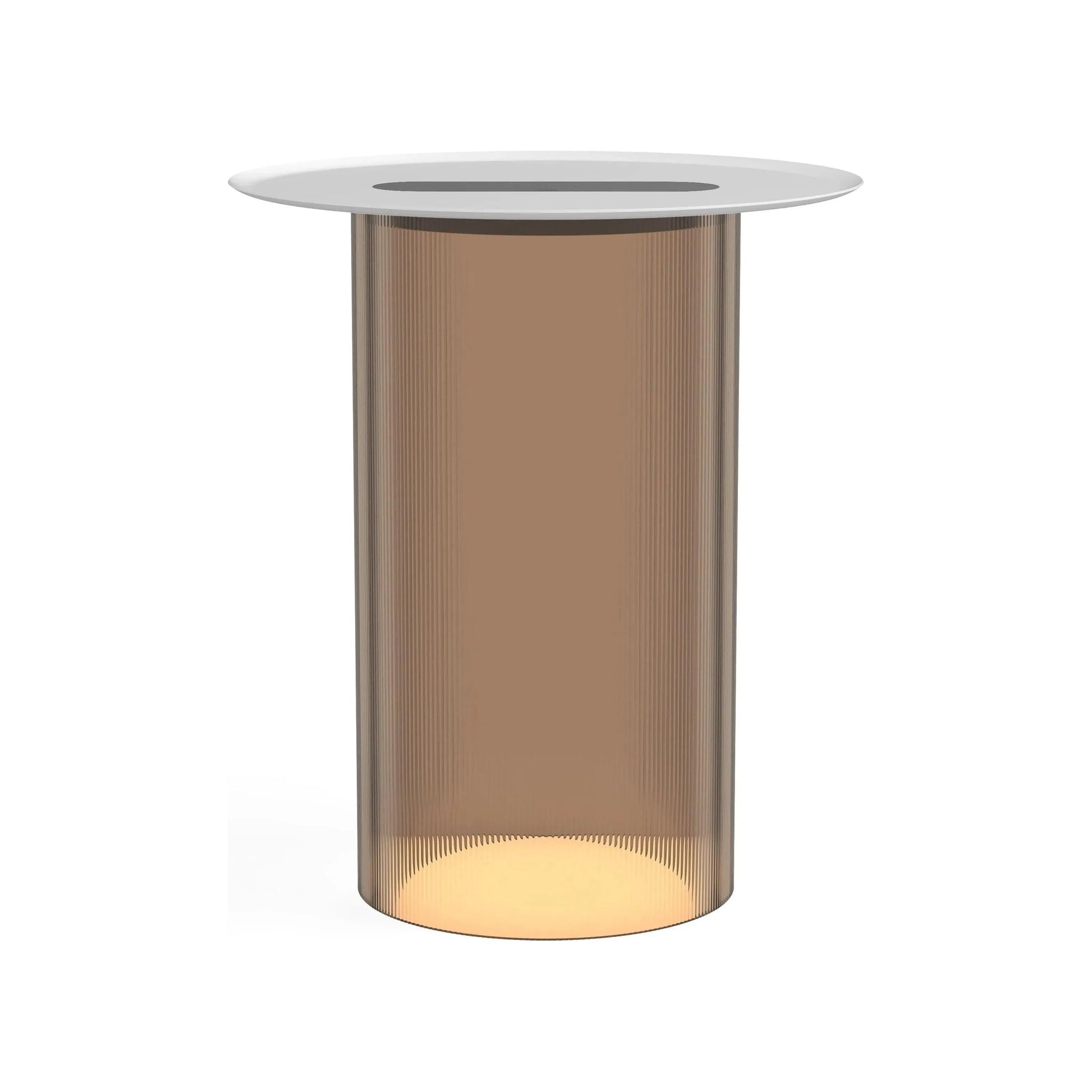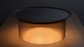 Carousel blurs the line between ambiance and utility combining a low setting wireless charging tray surface for your mobile devices with warm, glare-free illumination. It's low profile LED light module is discreetly concealed below its mating tray and suspended atop a transparent fluted acrylic cylinder diffuser that radiates mesmerizing light patterns onto the table surface below. Perfectly suited for desktop or bedside use, Carousel embodies a uniquely hybrid perspective on what a personal light can be. The base diffuser is offered in both clear and bronze tint and can be paired with a spun steel tray in matte white, terracotta, and black finishes.