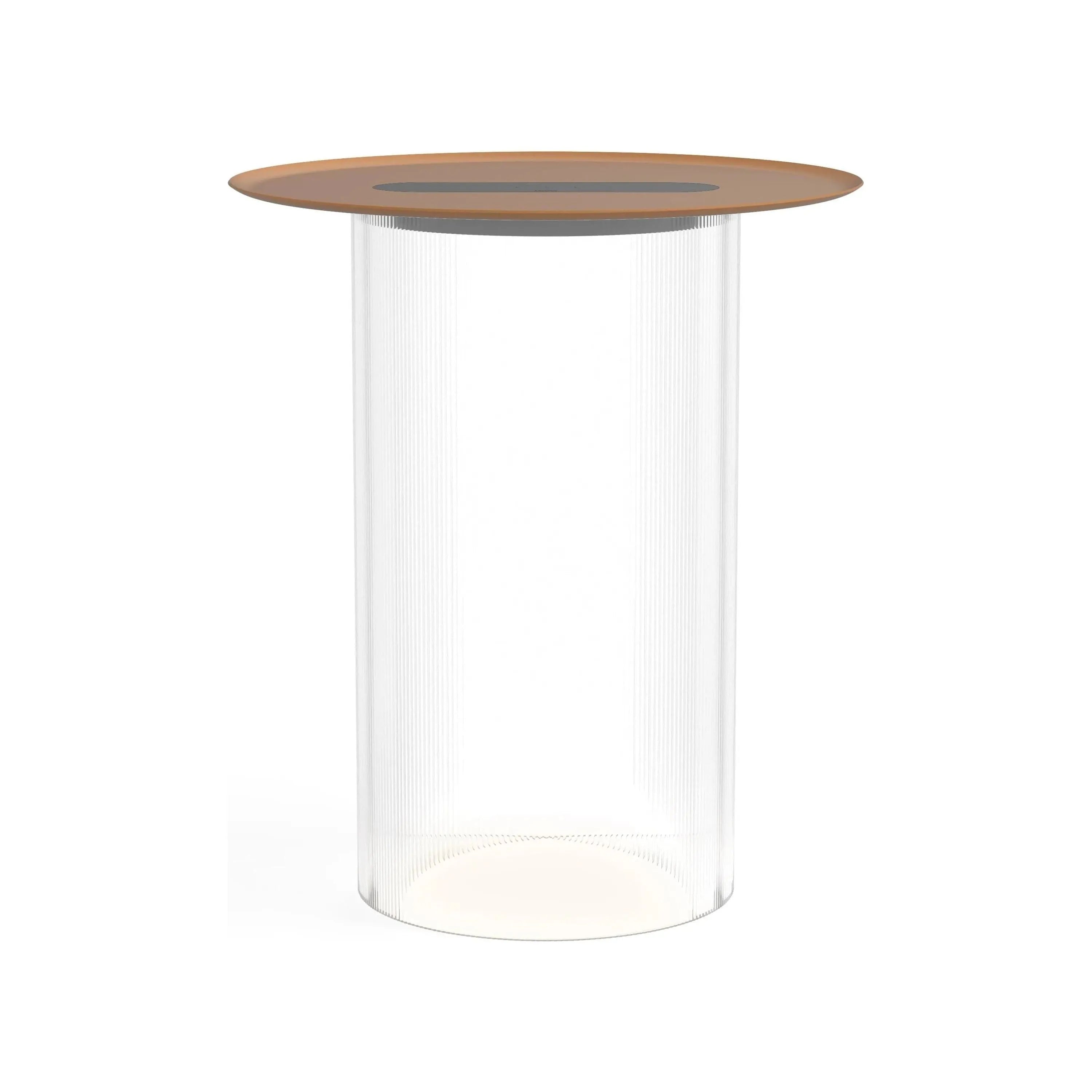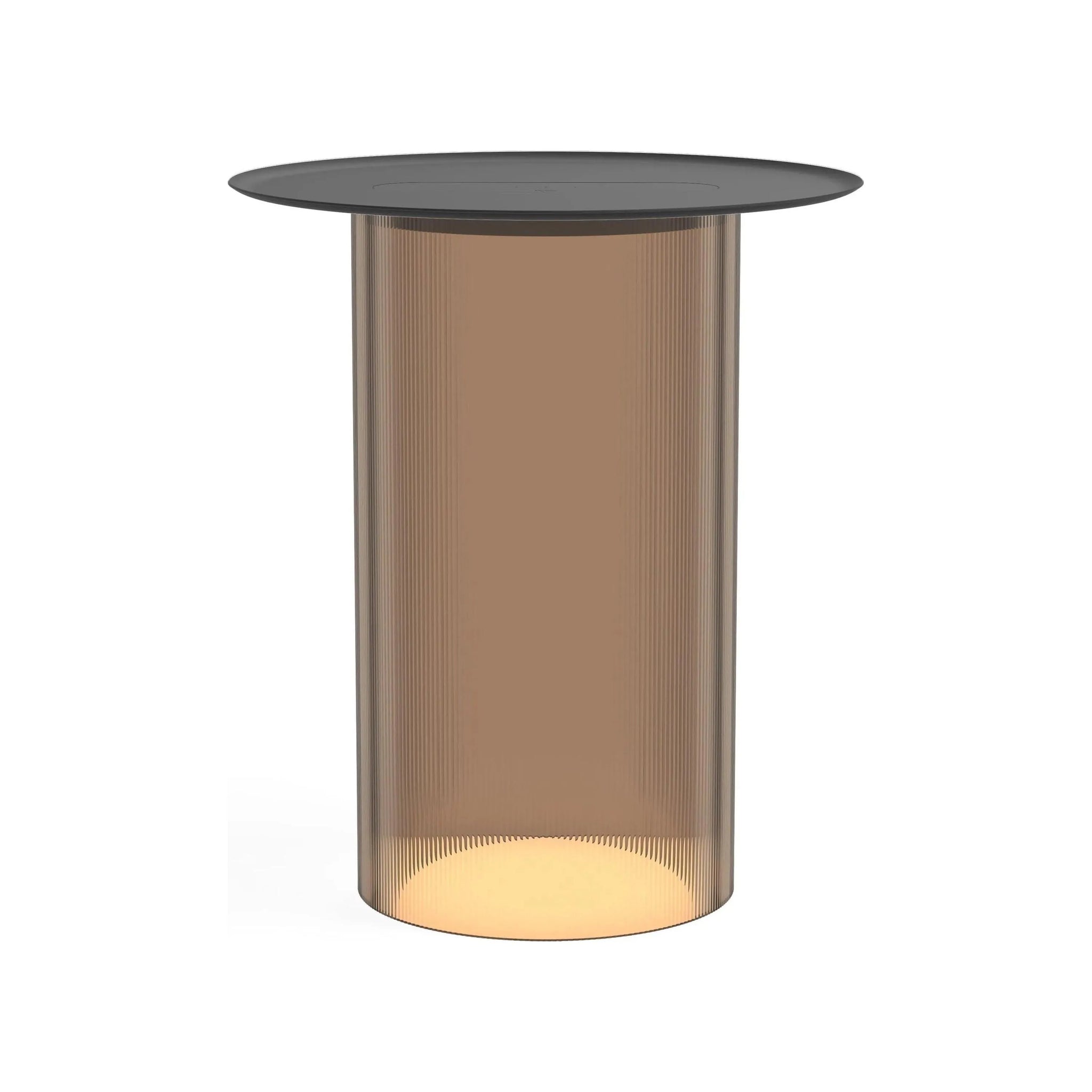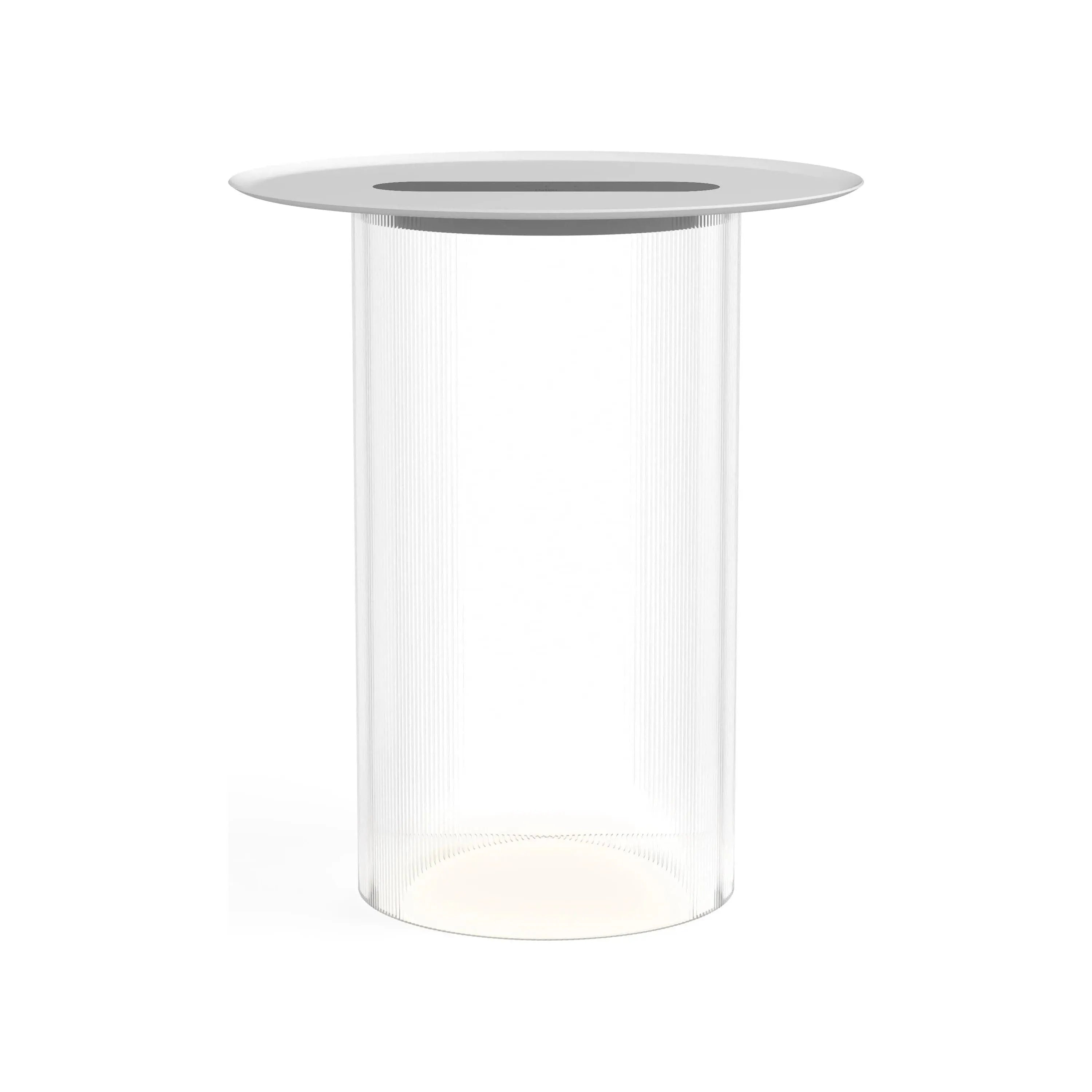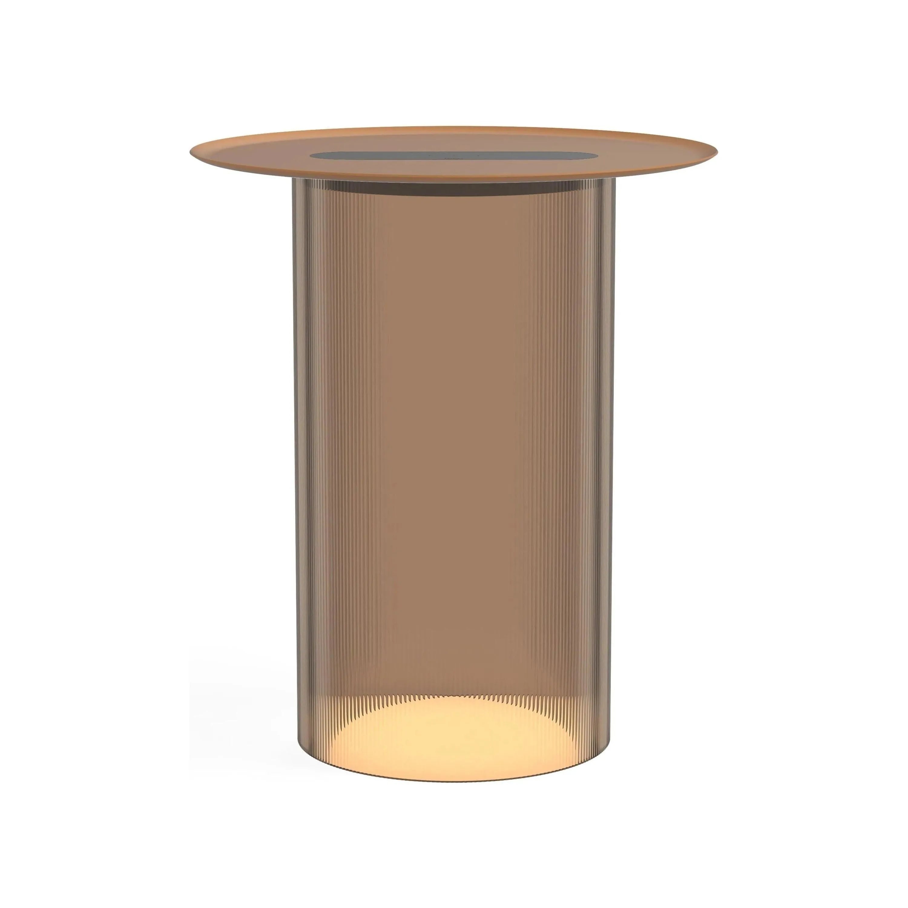 Carousel blurs the line between ambiance and utility combining a low setting wireless charging tray surface for your mobile devices with warm, glare-free illumination. It's low profile LED light module is discreetly concealed below its mating tray and suspended atop a transparent fluted acrylic cylinder diffuser that radiates mesmerizing light patterns onto the table surface below. Perfectly suited for desktop or bedside use, Carousel embodies a uniquely hybrid perspective on what a personal light can be. The base diffuser is offered in both clear and bronze tint and can be paired with a spun steel tray in matte white, terracotta, and black finishes.