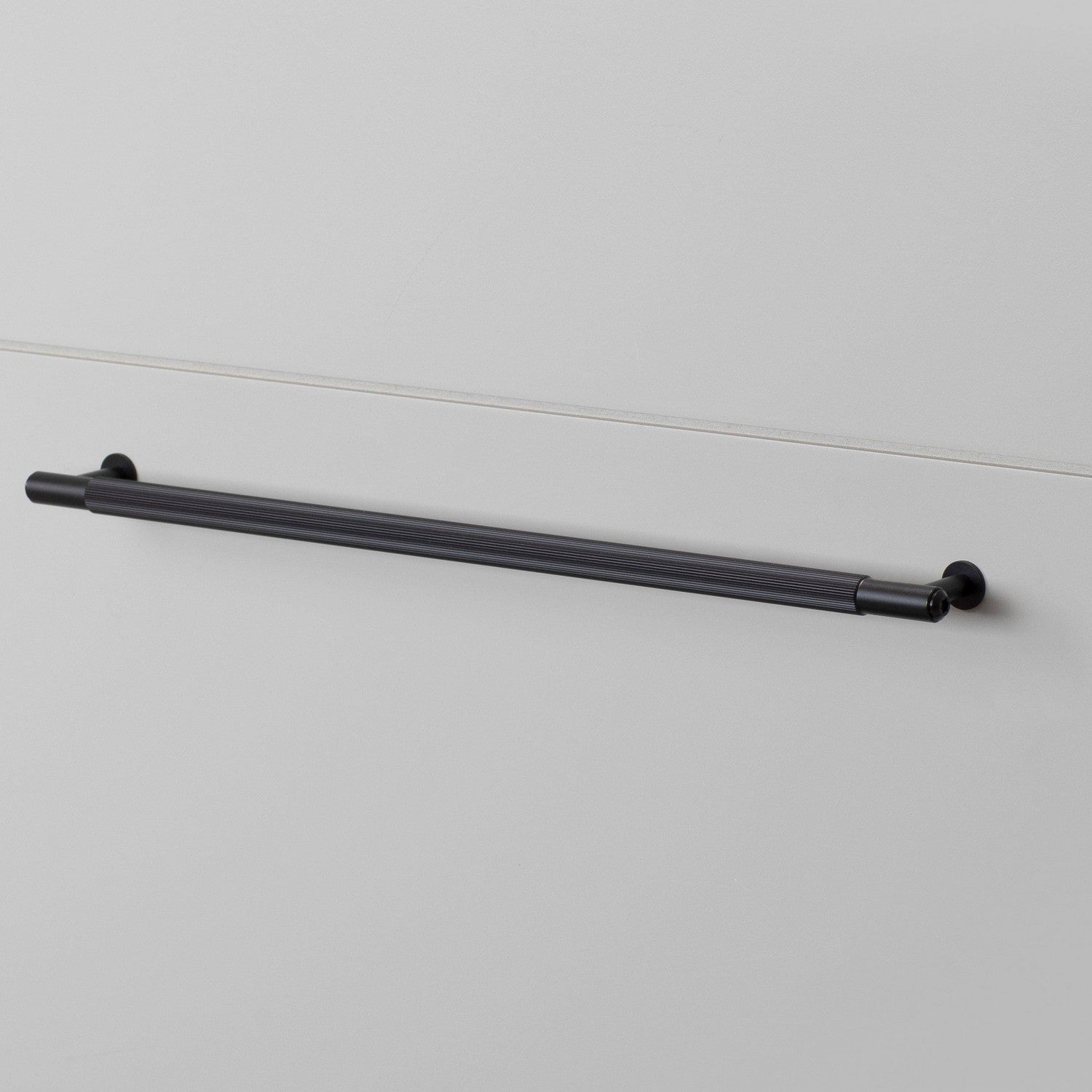A pull bar made from solid anodised black metal. This pull bar features our signature, diamond-cut, linear-knurl pattern and is refined by hand. They work great on cabinet doors, wardrobe drawers, cupboards, kitchen units and just about anything that can open.