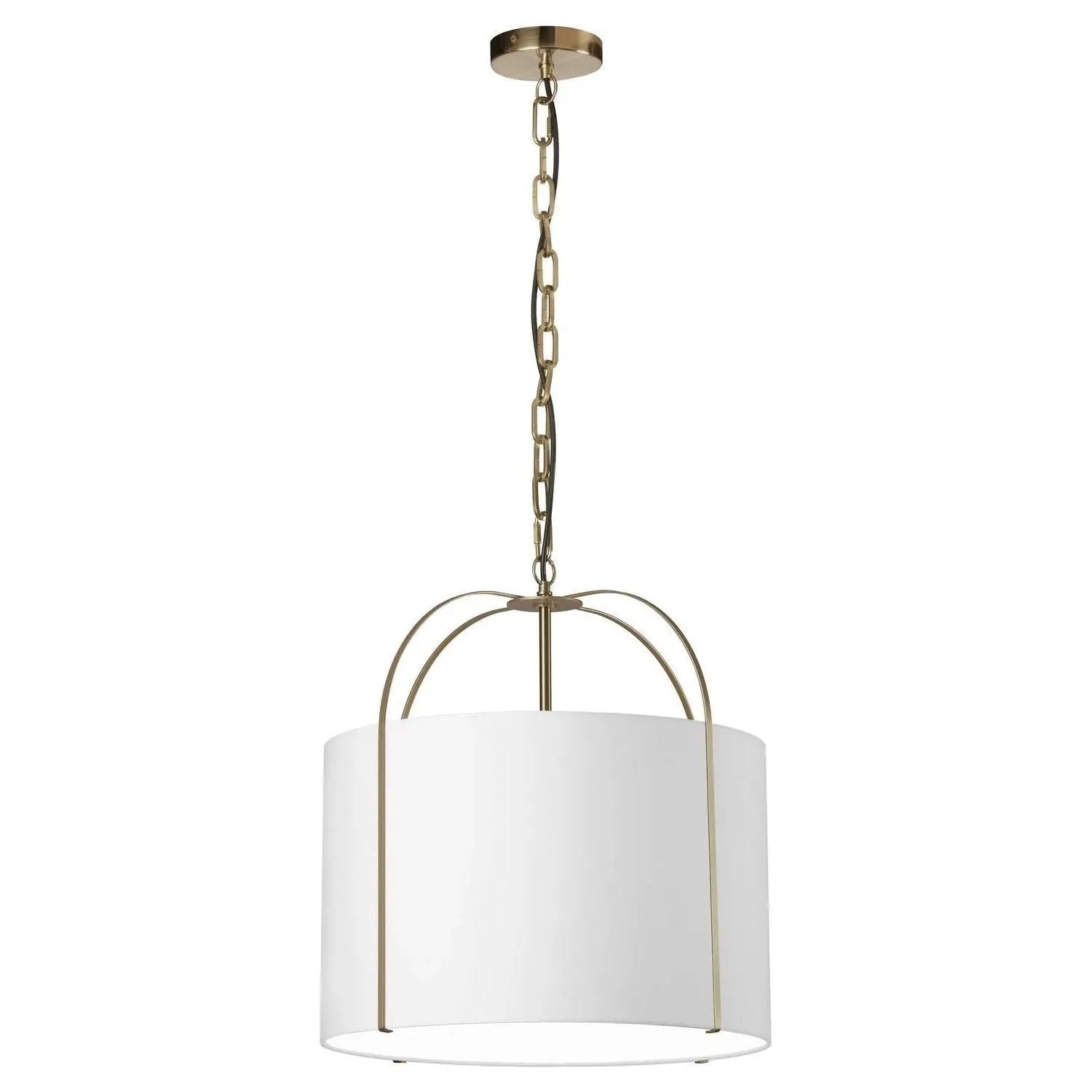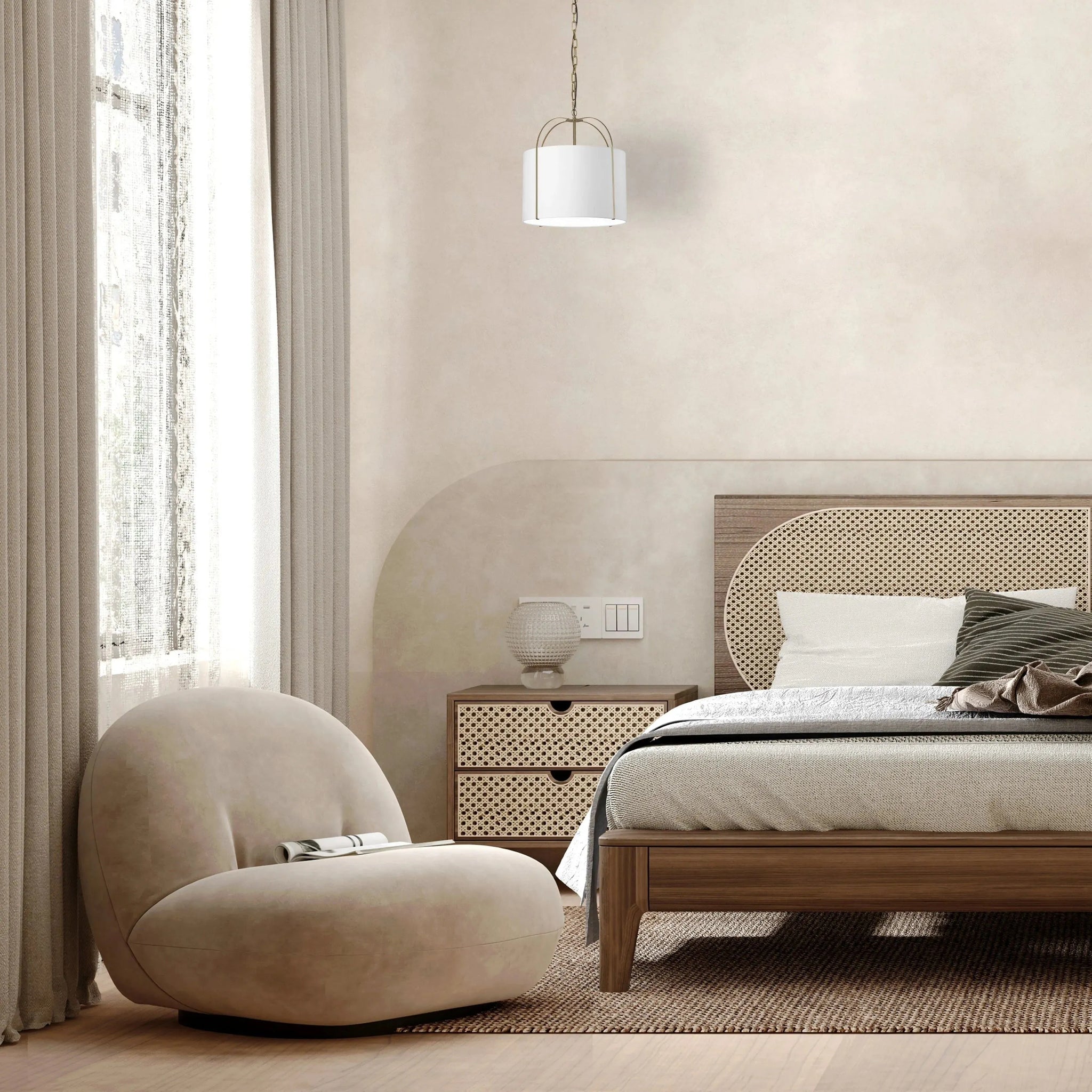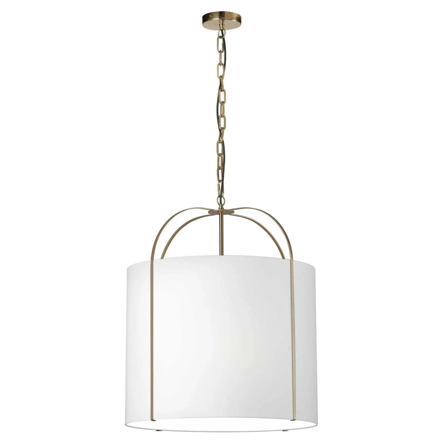 Quincy Pendant by Dainolite pairs a clean white drum shade with an architecturally inspired metal cage to deliver refined, contemporary lighting for elevated interiors. The composition balances soft, diffused illumination with sculptural form — ideal as designer lighting for entryways, dining, or hotel lobbies.