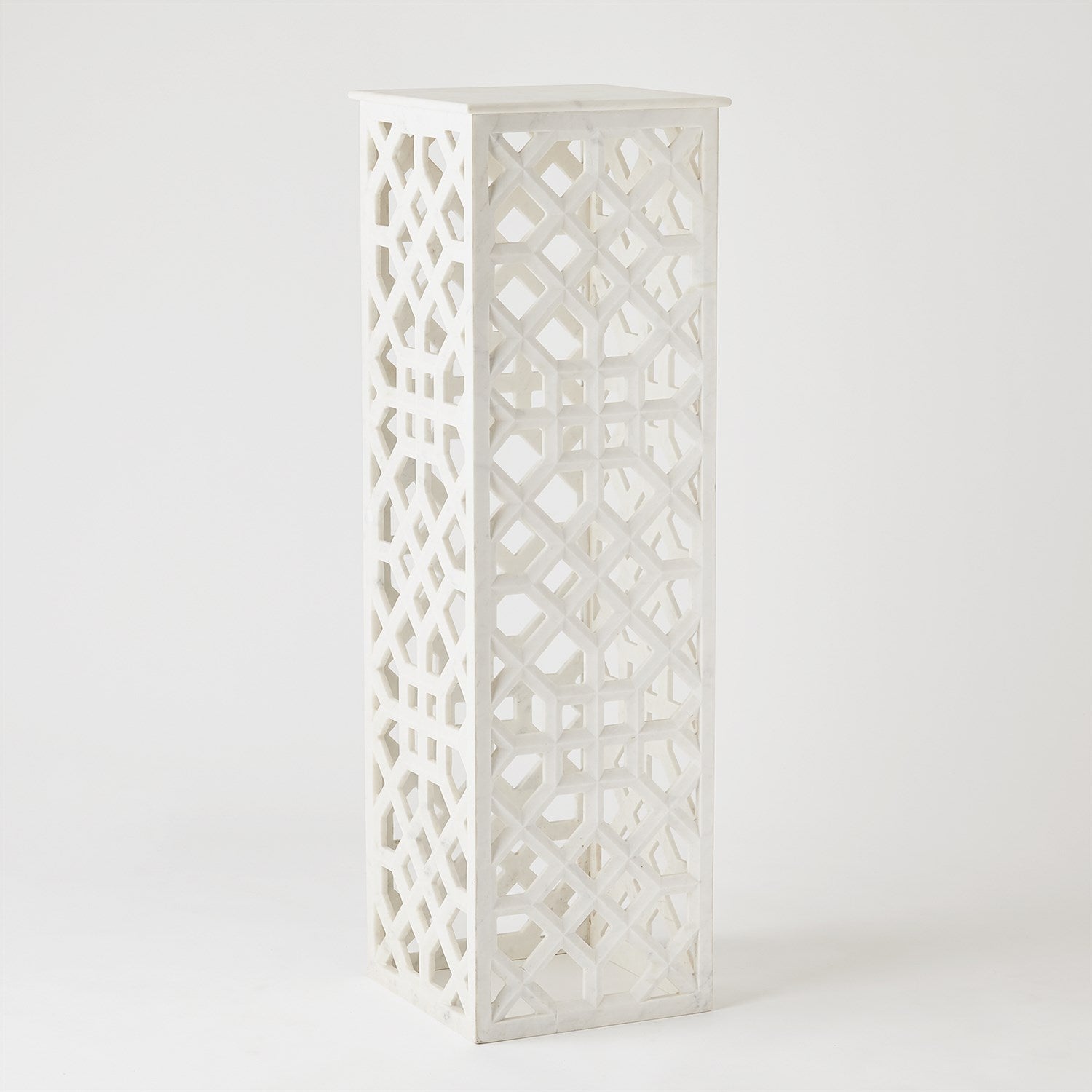 This pedestal is made from hand carved honed white marble from the deserts of India. The fret work pattern is based on traditional Moorish and Indian motifs. This substantial piece is an incredible value for the materials and hand work in it.