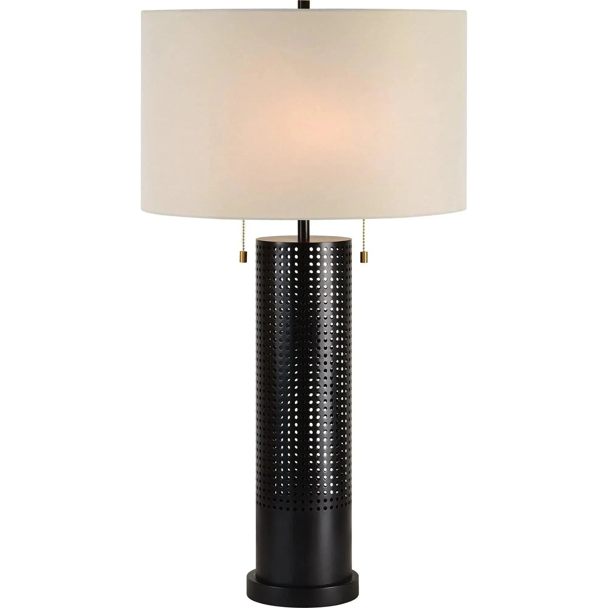 Perforated details along a iron base serve to enhance the glowing light this table lamp provides. The contrast of its black powder coating and off-white cotton shade brings a dramatic appeal to its resting place. It needs no additional accessory to catch the eye.