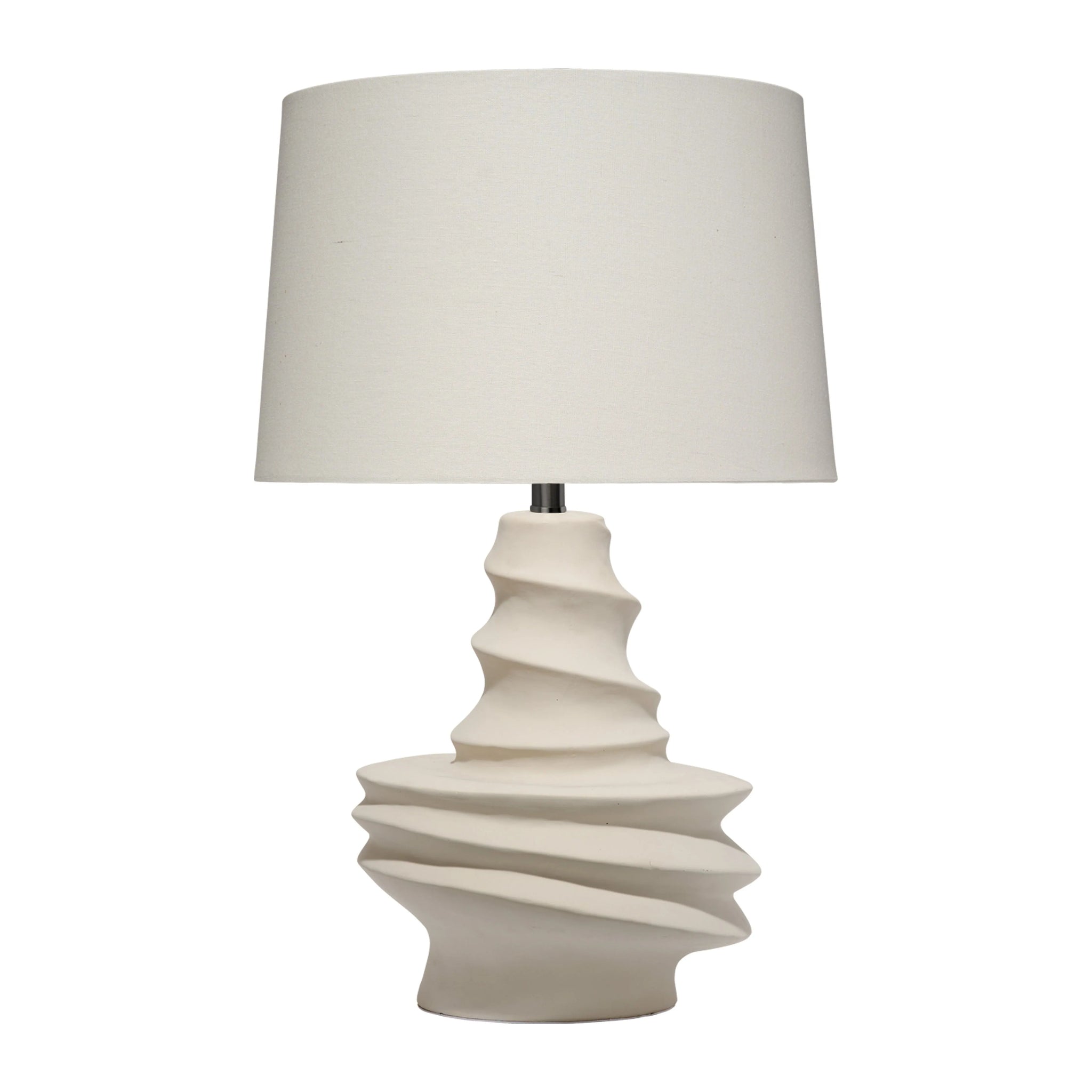 A decidedly literal representation of softly swirled sands, this table lamp harnesses the power and serenity of those scenic vistas. Each lamp is artisan-crafted from matte off-white ceramic. The other details are kept deliberately simple, featuring a white linen drum shade, dark silver hardware, and a coordinating finial completing the design. Center it on a side or accent table to create a focal point in any room.
