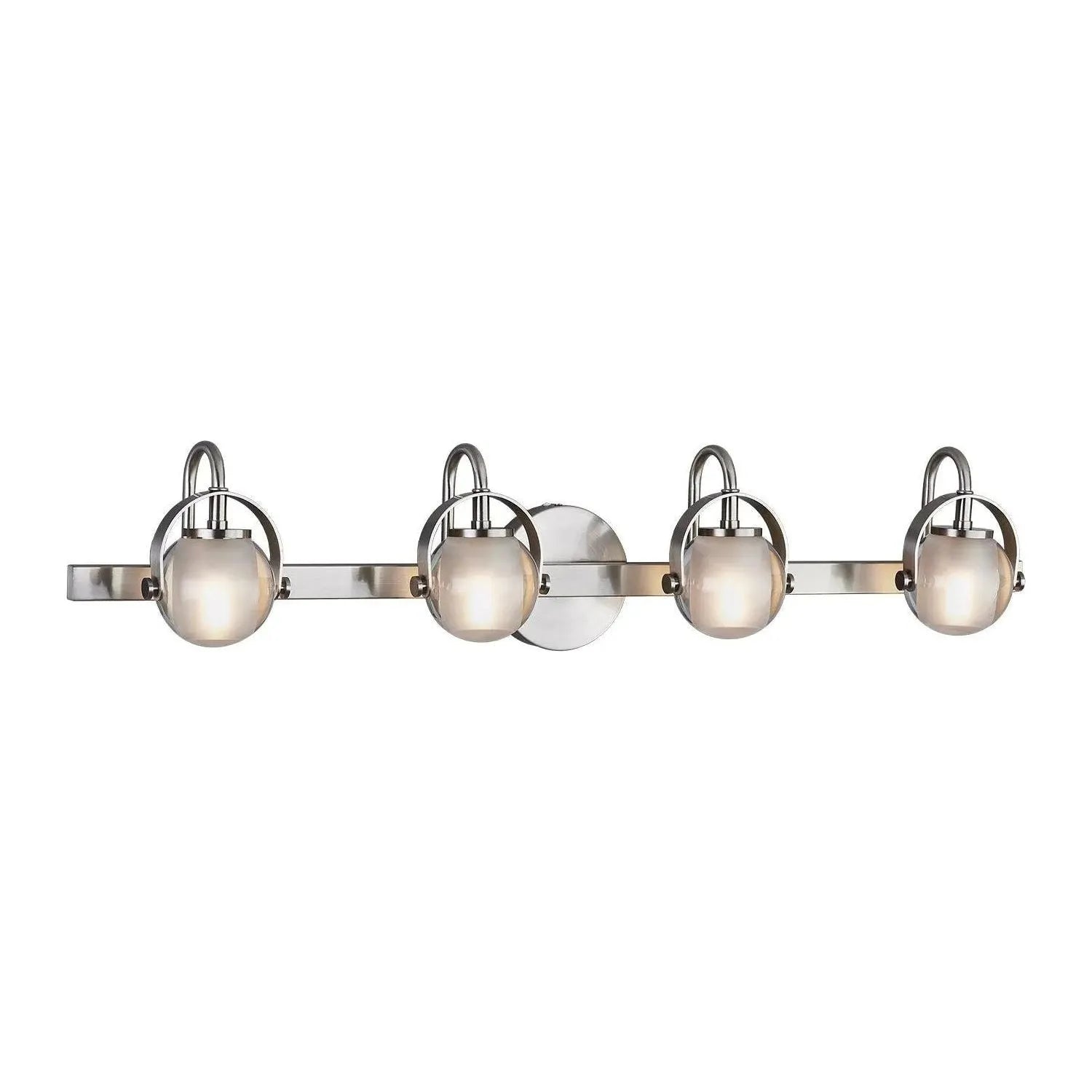 Conduit Bath Bar by Justice Designs reinterprets utility as refined designer lighting — a linear vanity bar that pairs engineering clarity with sculptural presence. Polished metal hoops cradle four frosted globe shades along a slim horizontal bar, creating even, glare‑softened illumination ideal for bathrooms and dressing areas.