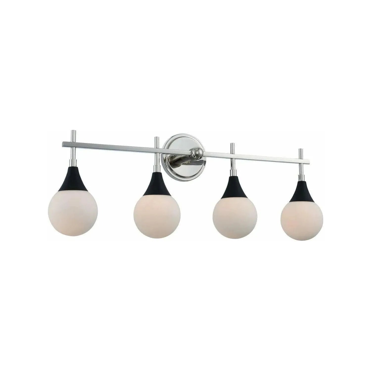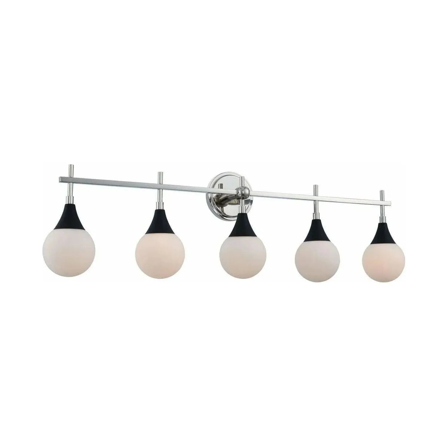 Mid-Century Modern inspired design featuring a trendy two-tone Matte Black and Polished Nickel finish with etched opal glass globes.