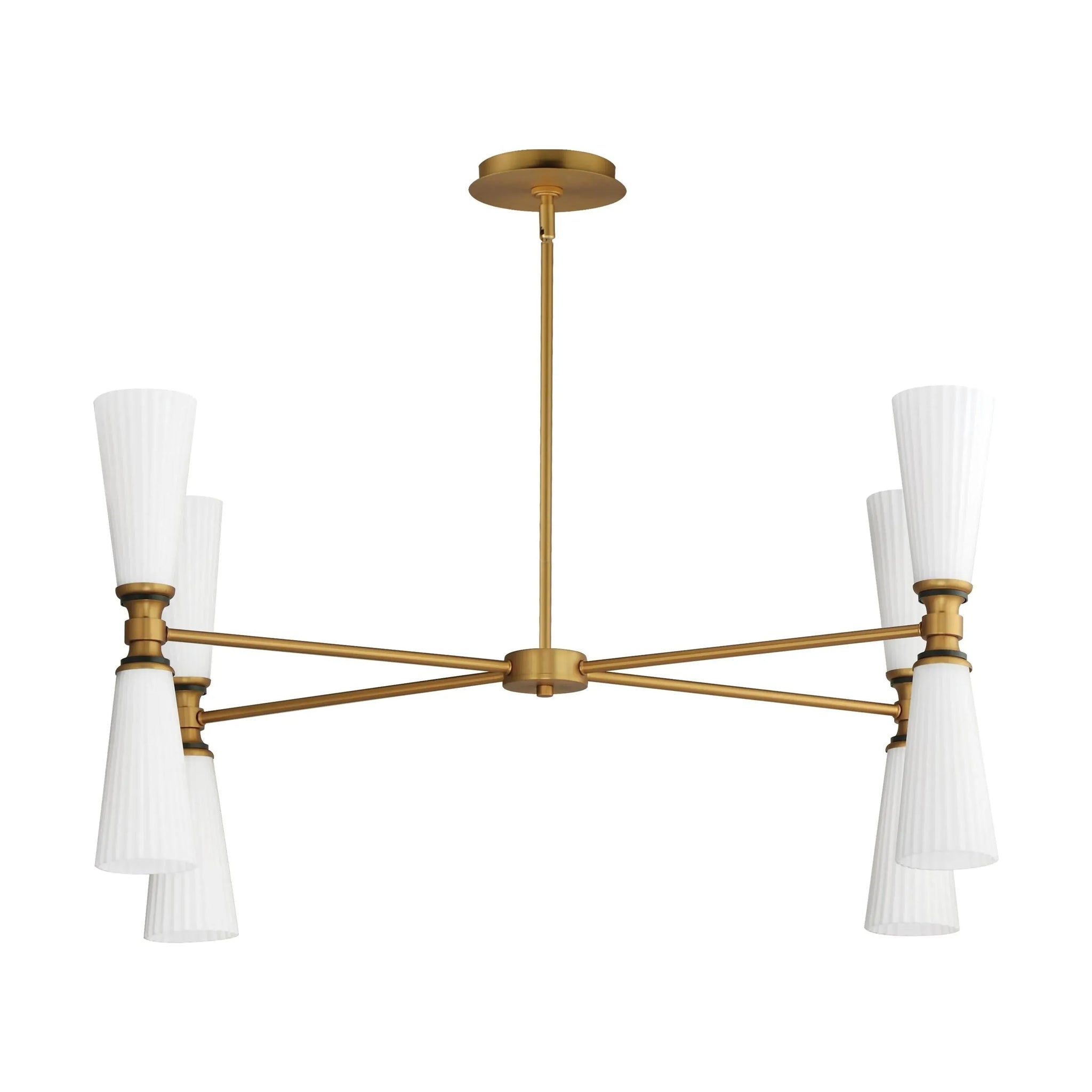 Fluted Satin White glass flares outward from an intricate and thin arm. The contrasting Natural Aged Brass and Matte Black finish adds character to the simple and stately fixtures that easily transition from modern and more traditional spaces.