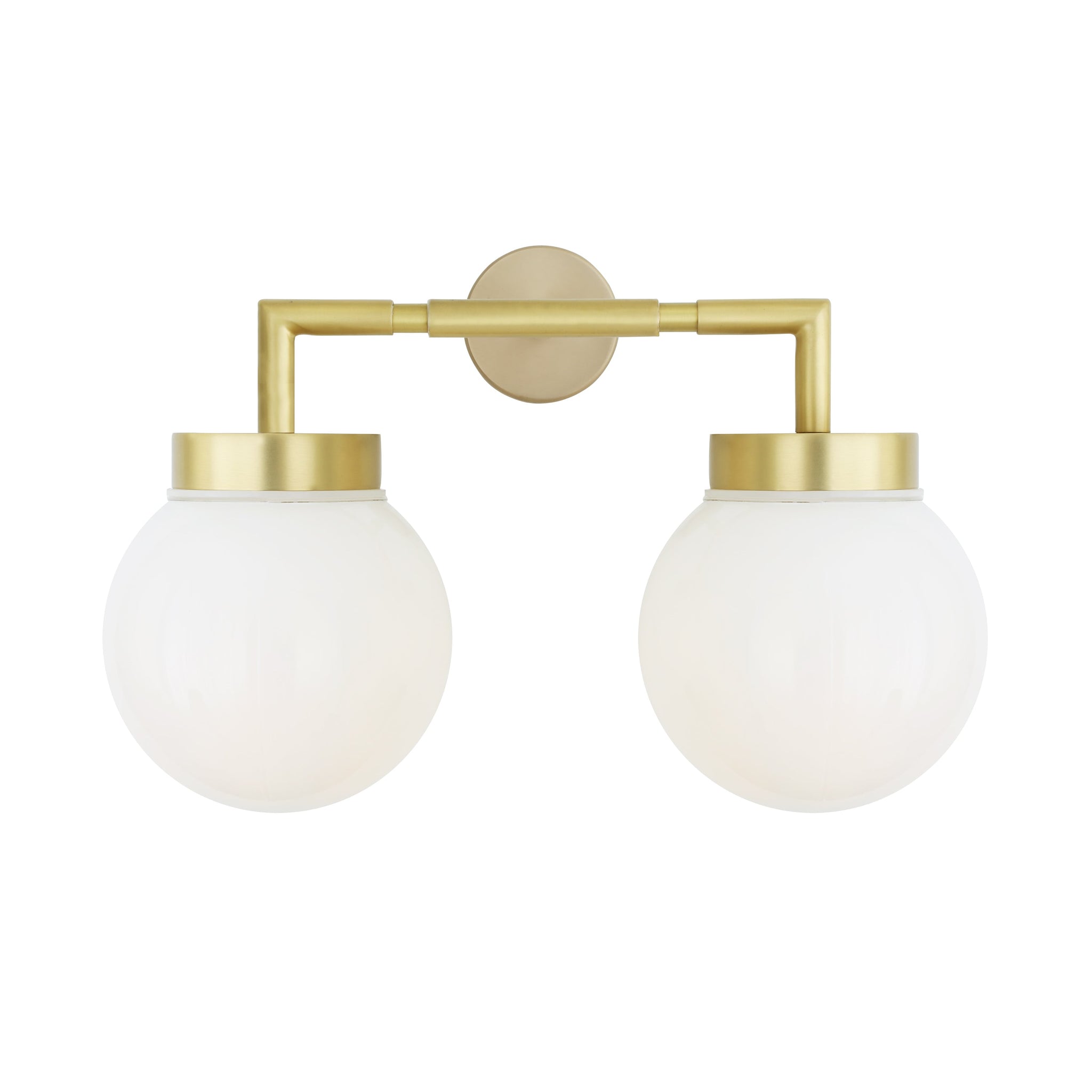 Jordan Double Wall Light from Mullan Lighting marries geometric clarity with refined materiality — a designer lighting piece that reads equally at scale in residential and commercial interiors. Two clear glass globes float from a streamlined brass arm, revealing warm filament illumination and precise metalwork that emphasises craft and proportion.