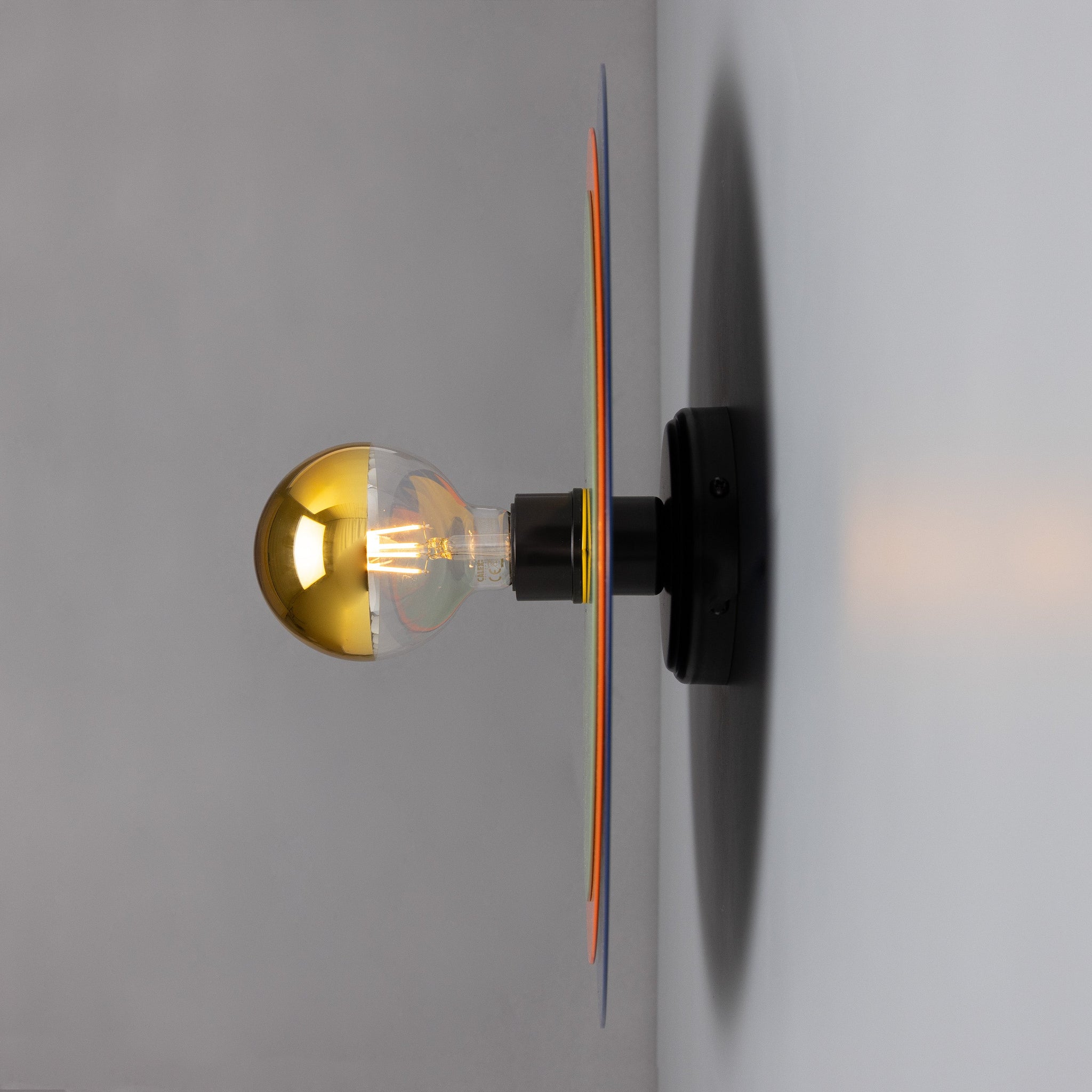 Neptune Wall Light presents a deliberate balance of form and function: a pared-back matte black wall plate, a prominent exposed globe with a half-gilded mirror finish, and a slim, layered disc that throws soft backlight and a hint of color into the plane. Designed by Mullan Lighting for considered interiors, it reads as contemporary sculpture and practical task lighting.