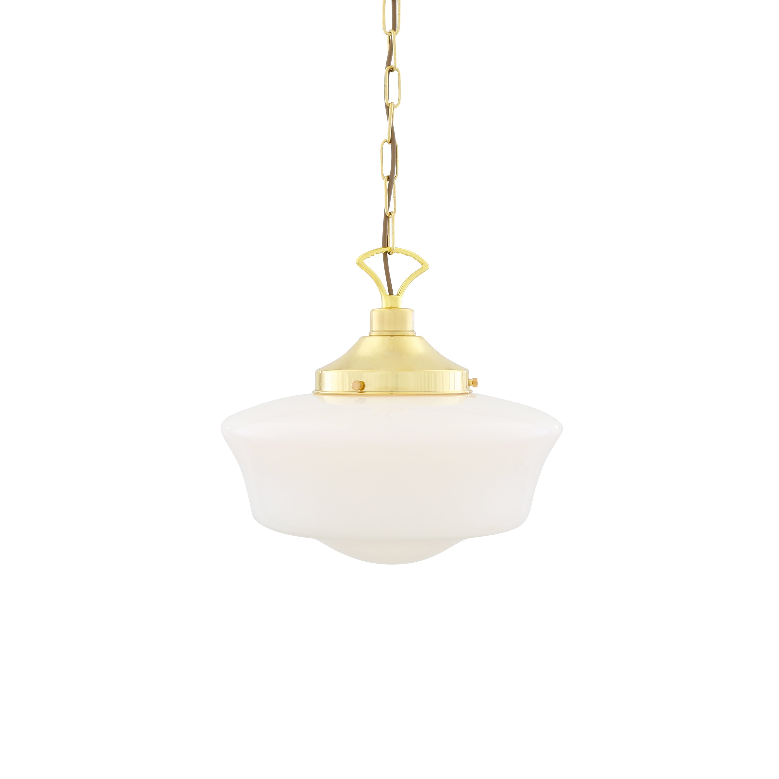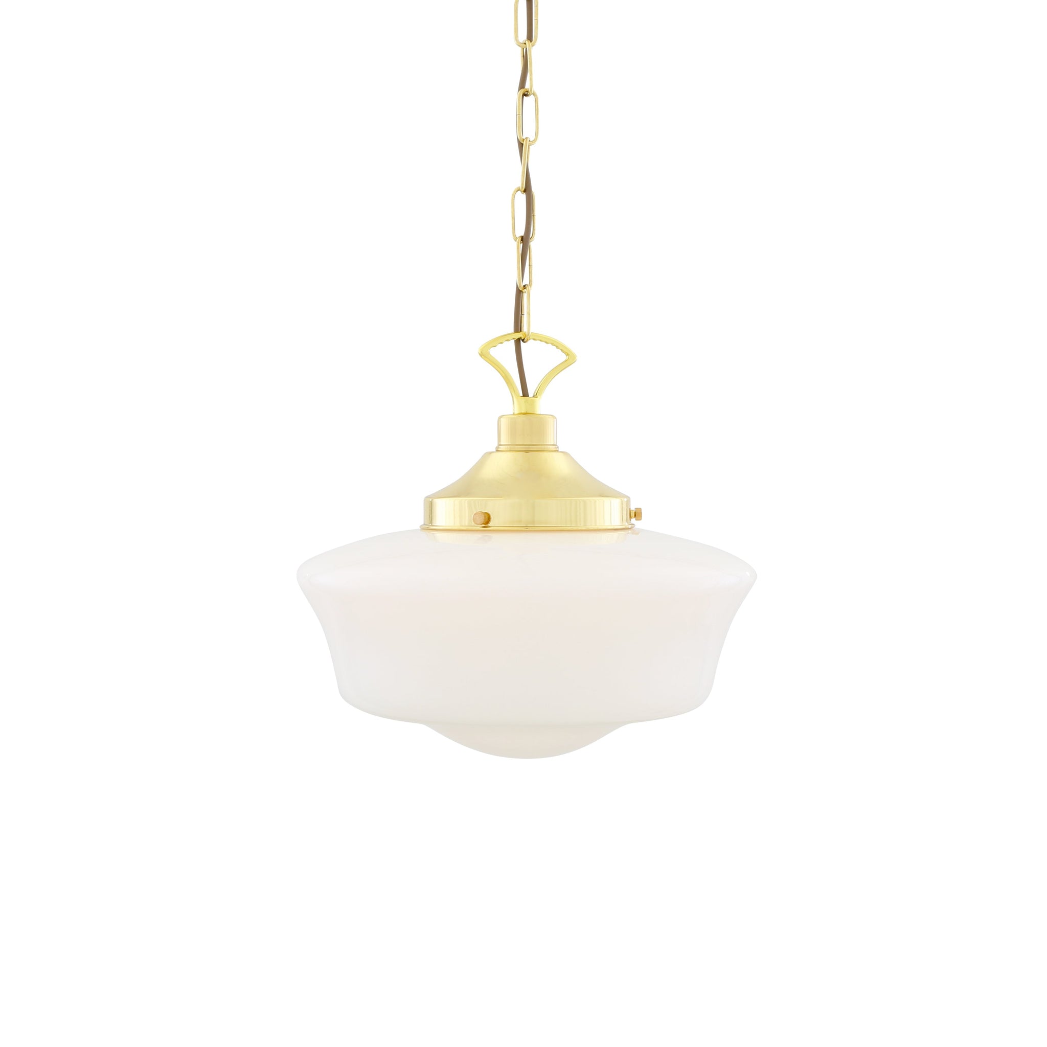 The opaline glass shade provides even, glare-free light while the aged-metal canopy and chain lend subtle industrial character and artisanal finish. Clean lines and carefully turned proportions make this pendant a measured choice for kitchens, corridors, and hospitality settings.