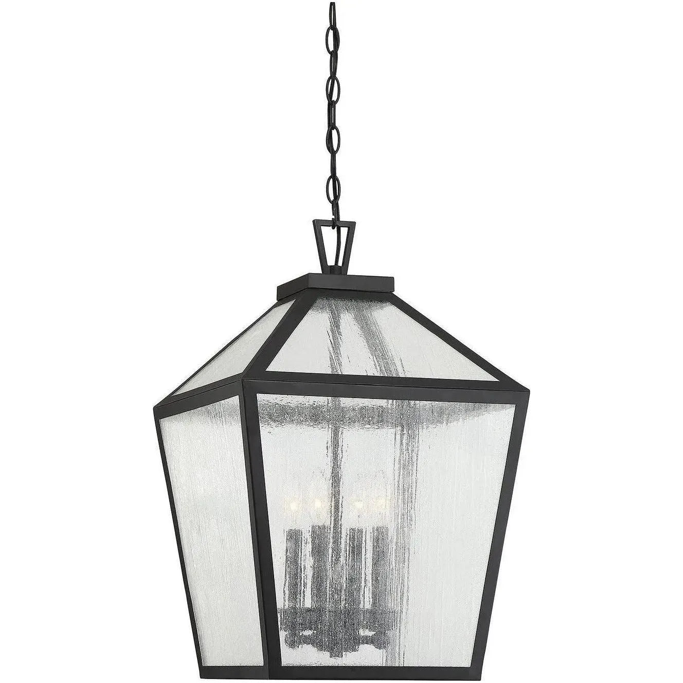 The traditional charm of vintage lanterns blends beautifully with streamlined, contemporary appeal in this Woodstock outdoor fixture. Everyone who enters your home will feel welcomed, and appreciate its classic style. High-quality matte black finish matches with every sort of architectural element and color palette. The greenhouse-like frame of the lantern hangs from an adjustable chain to accommodate varied heights. Clear seeded glass panes add wonderful textural interest and allow maximum illumination that is both safe and attractive. Four metal candle covers hold 60W bulbs. 15" wide by 30.5" high size is perfect to hang this lantern from an outdoor ceiling, such as a porch, entry, covered patio, sunroom, or pergola.