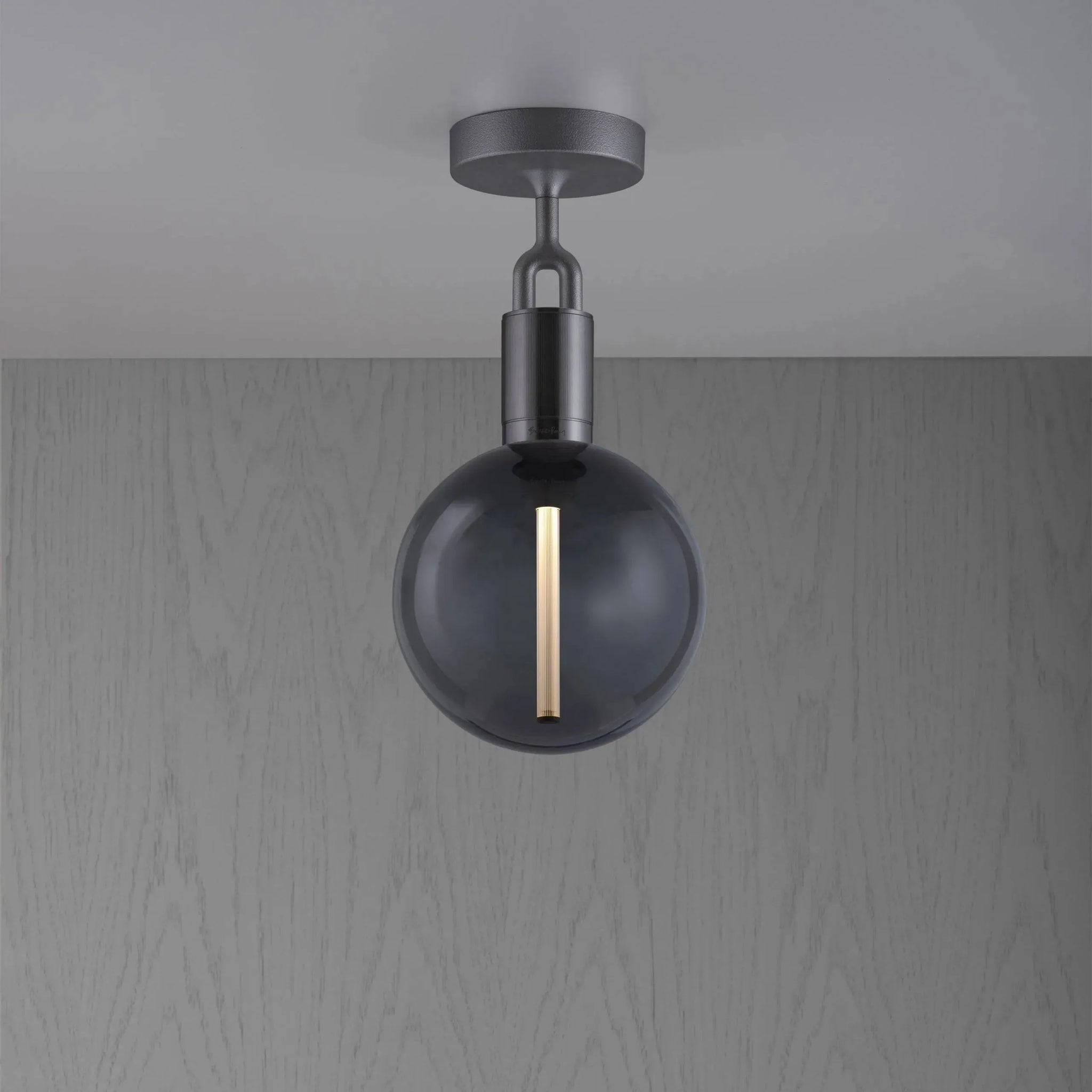 A ceiling light, combining machined and cast solid metal, all refined by hand. It features our cast forked detailing and signature diamond-cut linear knurling. The light comes complete with a handblown opal glass globe and Forked-specific dimmable Buster Bulb, casting a functional ambient light in this configuration.
