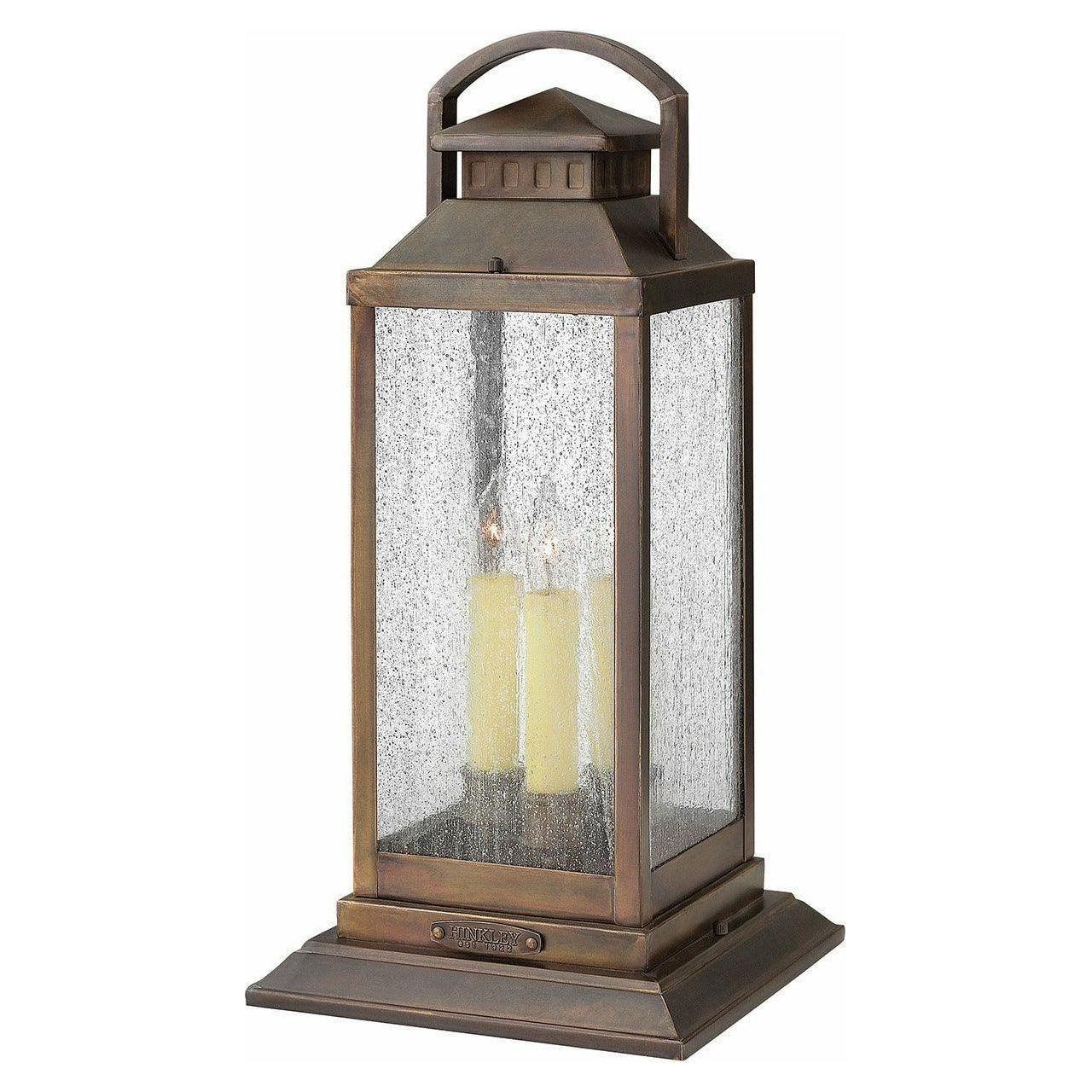 The tall rectangular body in a warm dark bronze finish frames seeded glass panels that softly diffuse the integrated 12V LED candelabra cluster, creating layered, glare-free illumination. A stepped pier base with Hinkley nameplate, pyramid top and arched carry handle convey craftsmanship and lasting outdoor performance.