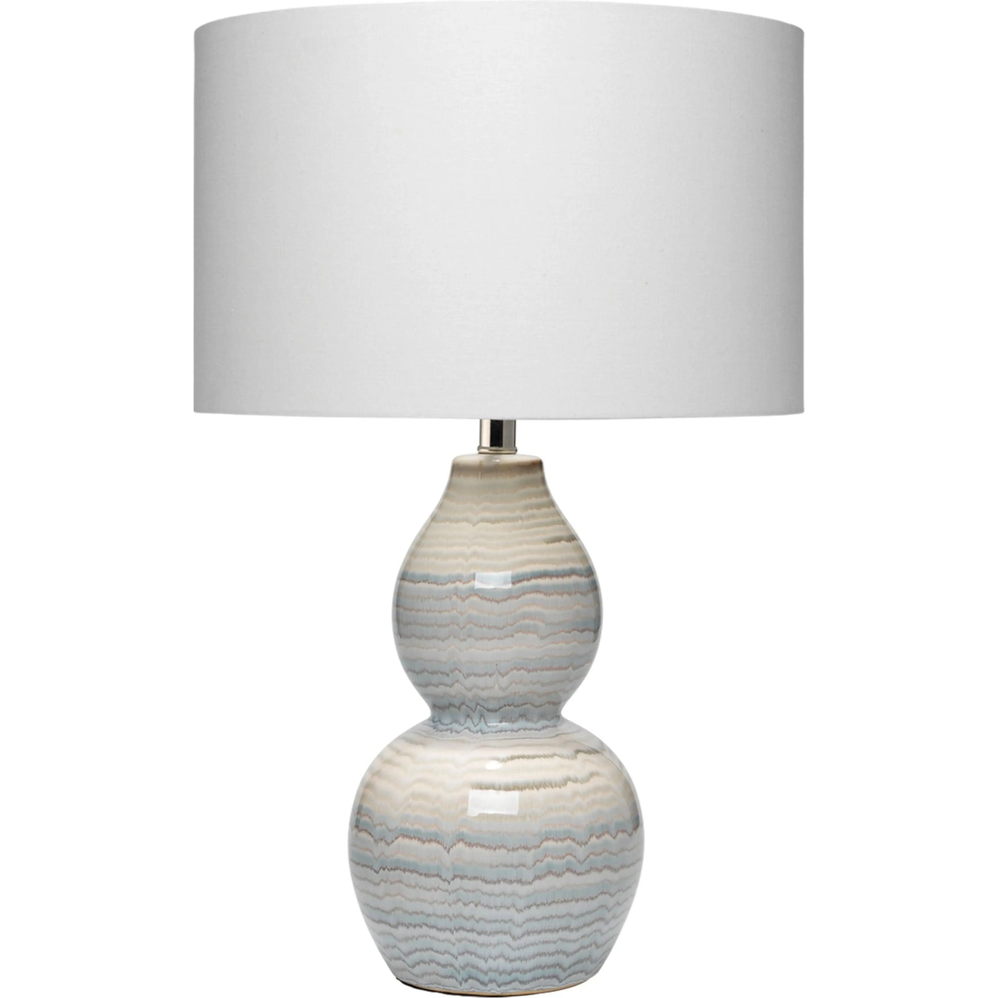 The classically shaped double gourd table lamp in a soft neutral waves of glazing adds glamour and dimension to contemporary interiors. While no two will look exactly the same, the slight variations make this lamp a statement piece in any bedroom, living space or home office.