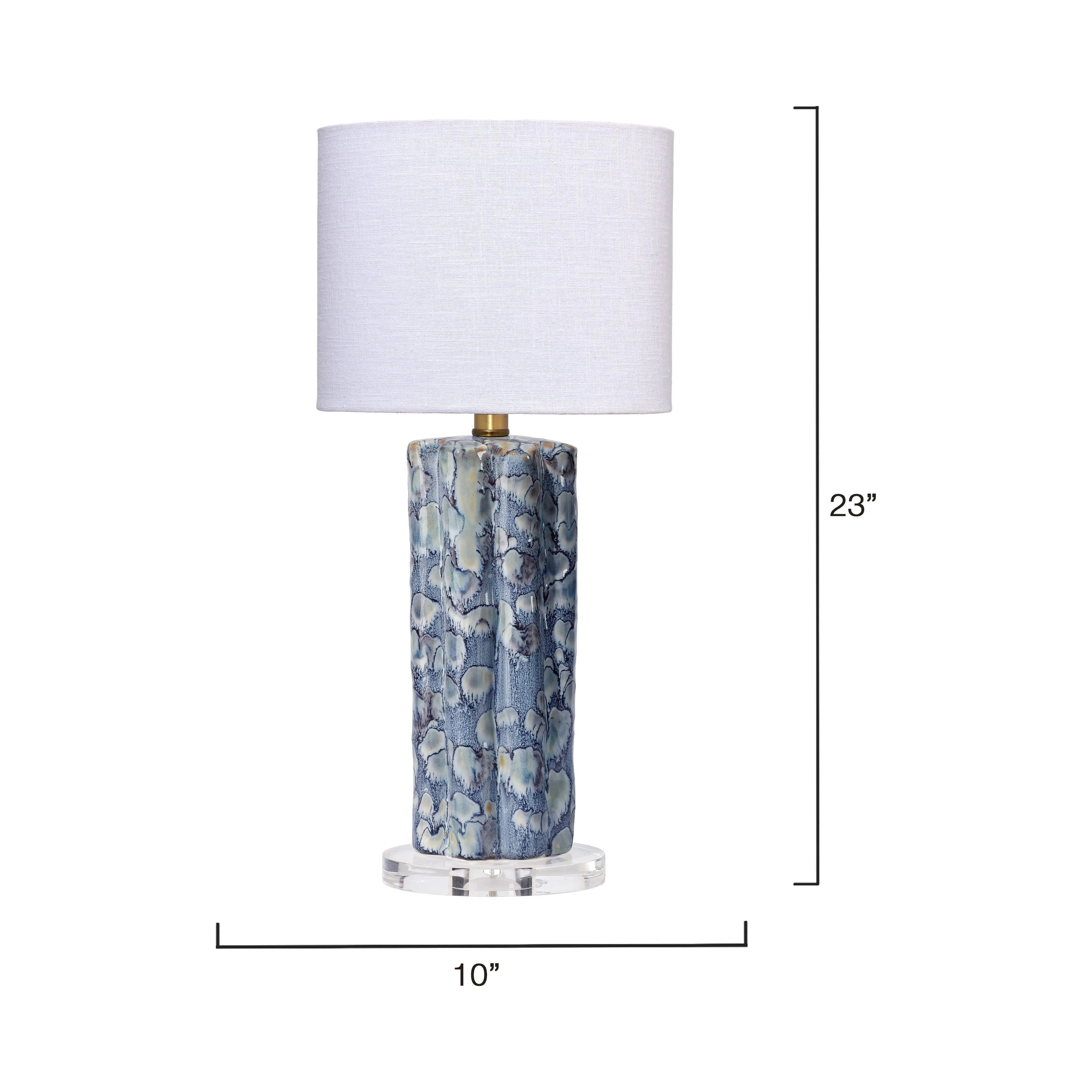 The scalloped body of this ceramic lamp is finished with reactive glazes that have been expertly fired to create vibrant patterns, masterfully updating the traditional blue and white color scheme. A thick slice of crystal-clear resin grounds the design, which is topped with an oval shade in white linen. We love this displayed as a pair on a mantle.