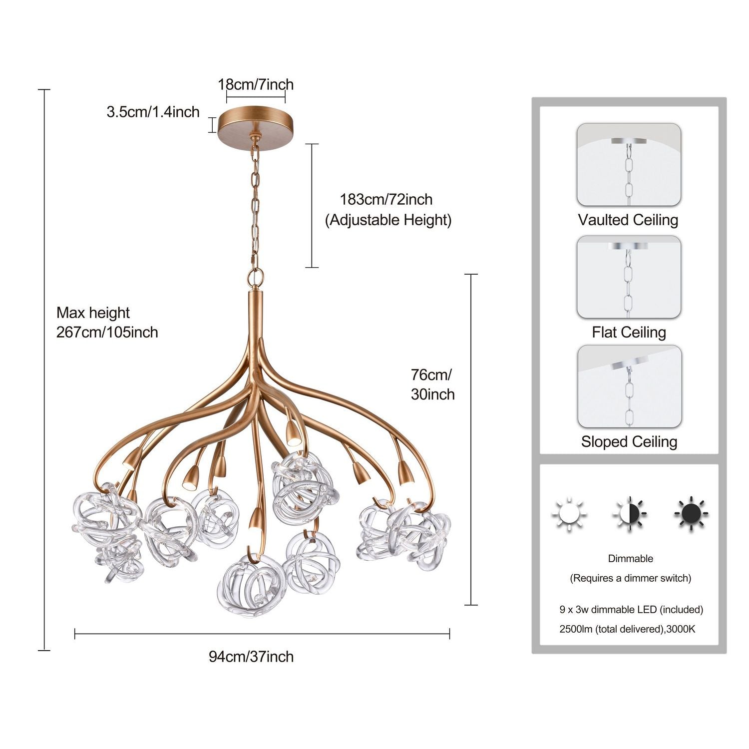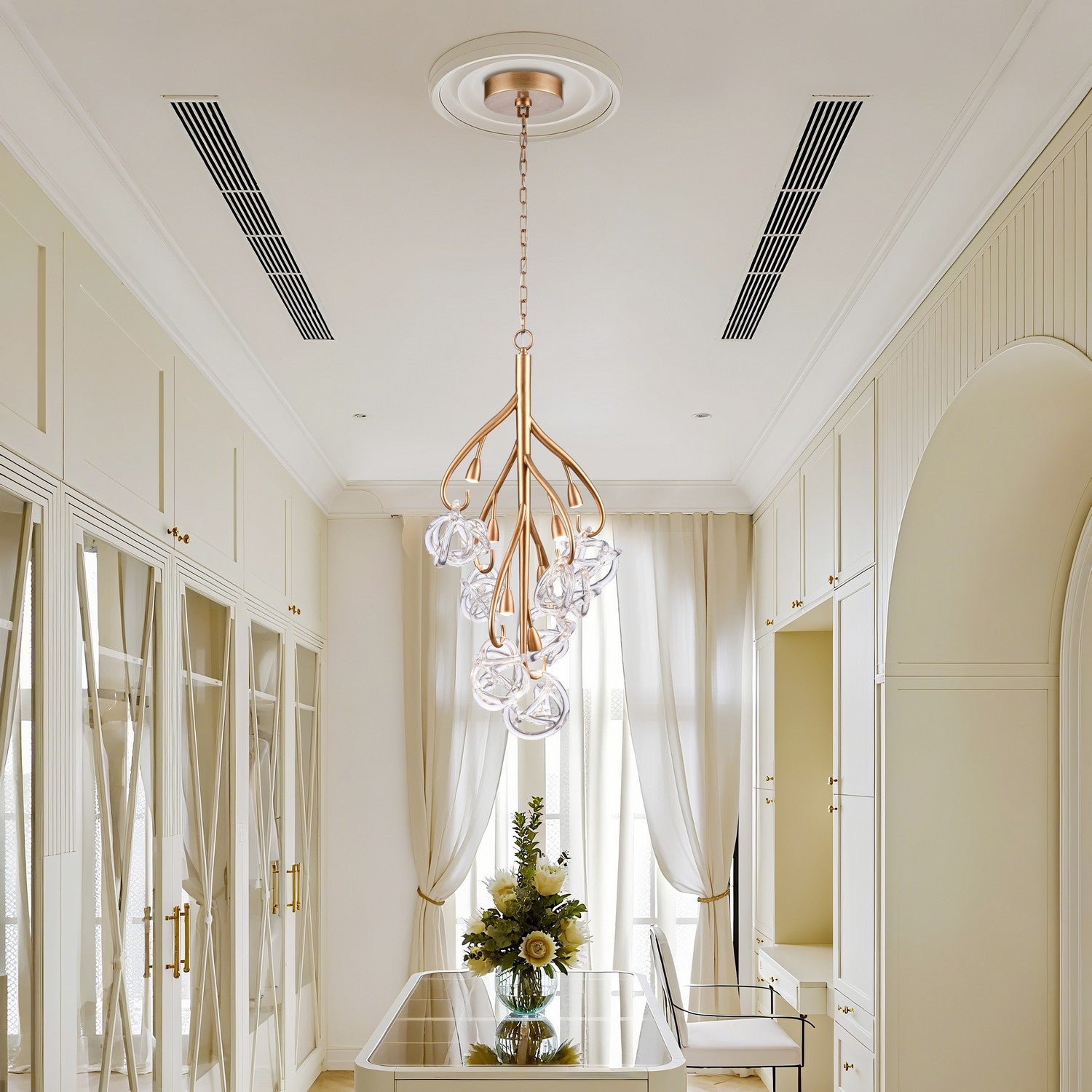 Awaken your space with the untamed beauty of the Freeform Collection,a sculptural masterpiece where nature and artistry collide. Inspired by organic movement, its branch-like arms reach out in graceful, unpredictable directions, each one cradling a hand-formed glass sculpture—twisted from molten clear glass into one-of-a-kind pieces that shimmer with individuality. No two are the same, making each fixture a personal expression of elegance and wonder. The warm Antique Gold finish grounds the piece in timeless sophistication, while the airy design adds visual lightness and flow. Ideal for modern organic spaces, high-design interiors, or artistic entryways, the Freeform Collection delivers luxury artisan lighting that captures nature's essence and turns it into something unforgettable.