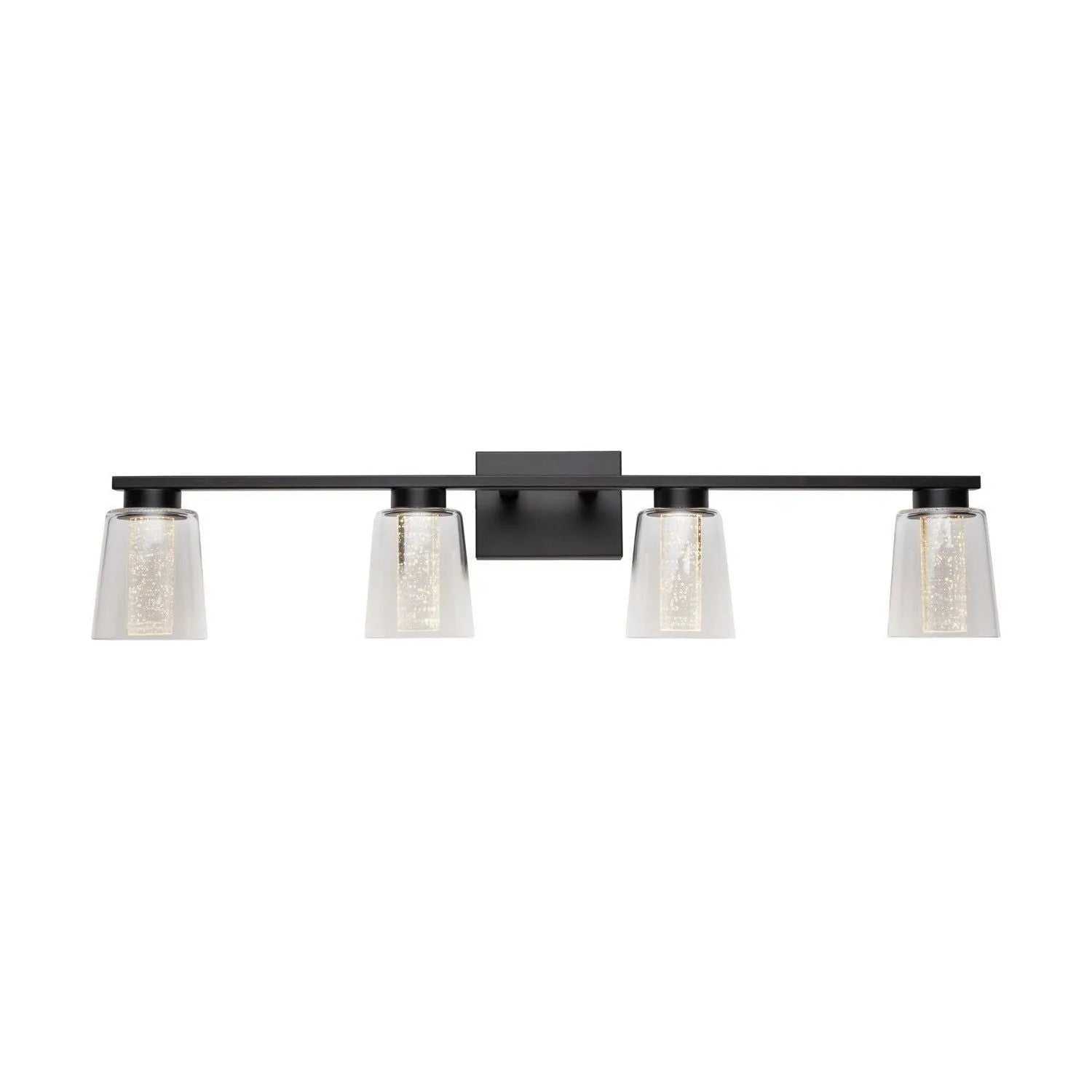 Dalton LED Bathroom Vanity by Artcraft Lighting translates refined minimalism into a practical, project-ready fixture. A slim matte-black bar and square backplate provide a clean architectural profile while three clear conical glass shades reveal a textured, bubble-style LED diffuser for even, glare-controlled illumination.