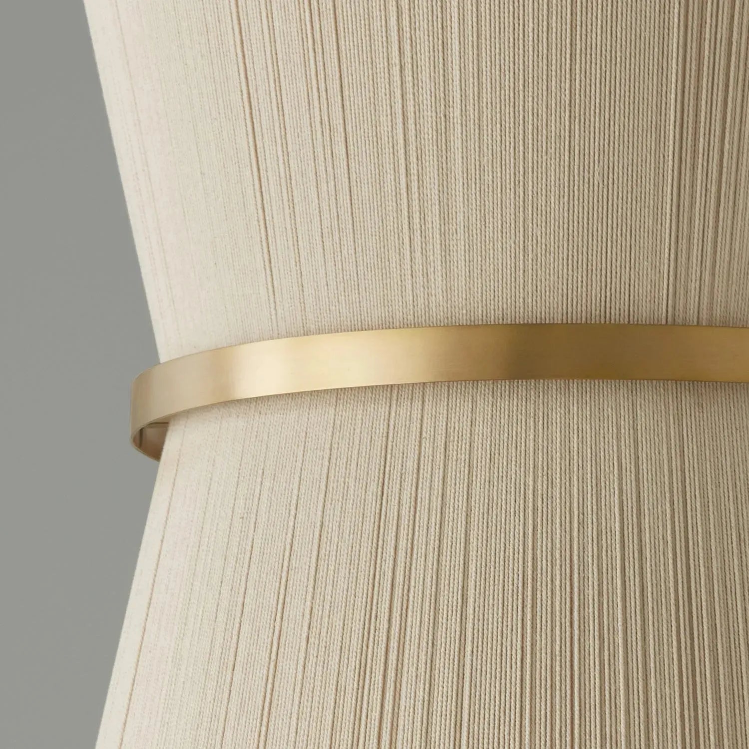 The piece centers around an artisan loomed hourglass silhouette made of black rope, accented by a honey-toned patinaed brass band for eye-catching elegance that catches the light from every angle.