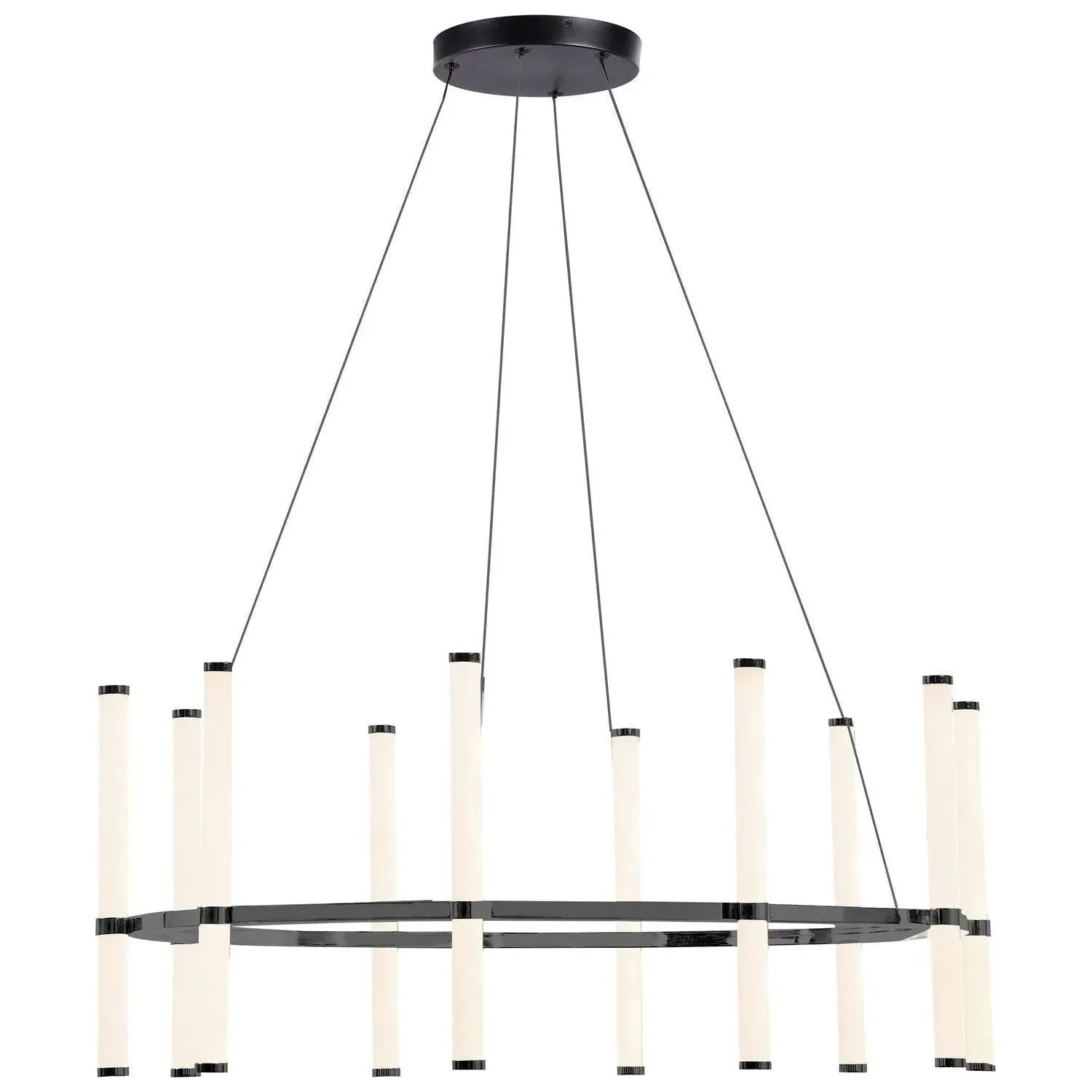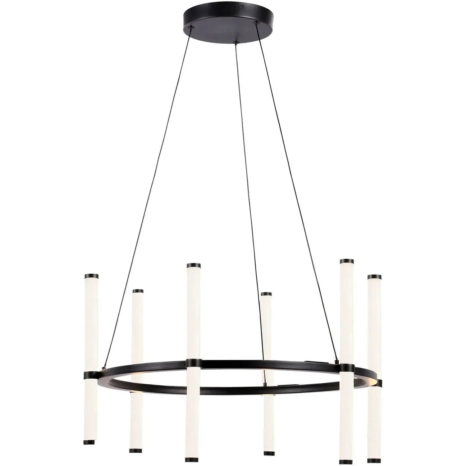 Corvette LED Chandelier by Dainolite refines modern designer lighting into a disciplined, architectural form — a slim aged-brass ring suspended on fine cables with elongated white acrylic tubes that read like contemporary candlesticks. It’s a considered centerpiece that balances warm, ambient illumination with sculptural restraint for elevated interiors.