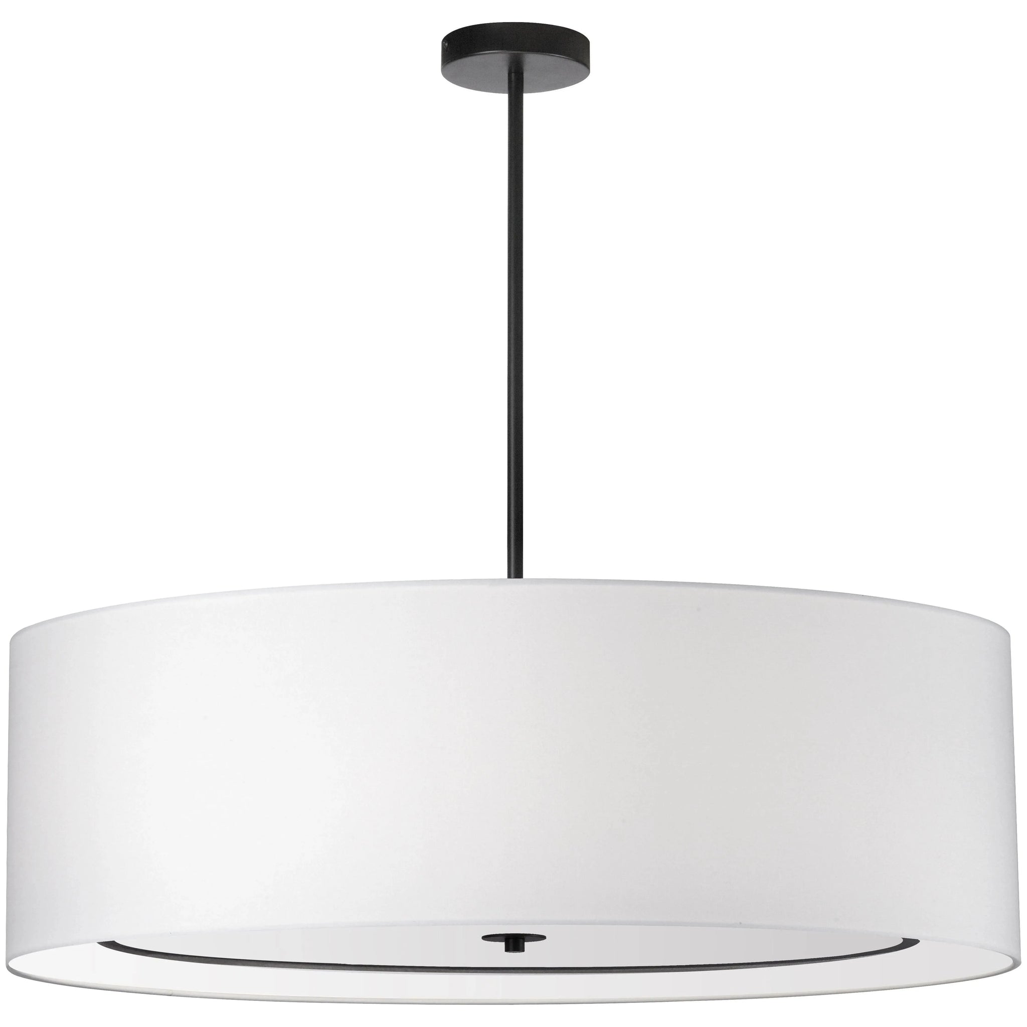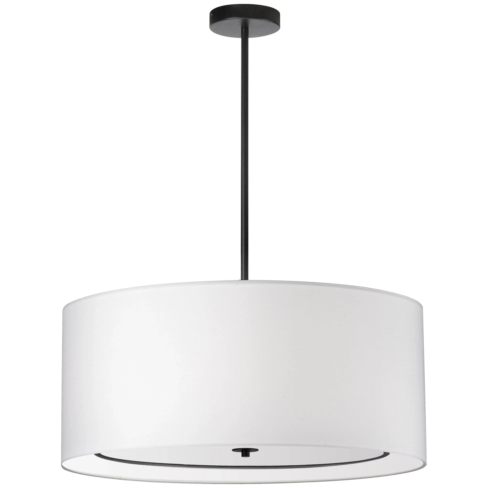 Porscha Pendant by Dainolite is a refined drum pendant that balances sculptural form with quiet function—designed to bring soft, even illumination to curated interiors. The clean white fabric shade and matte black stem create a modern contrast that reads luxurious yet restrained.