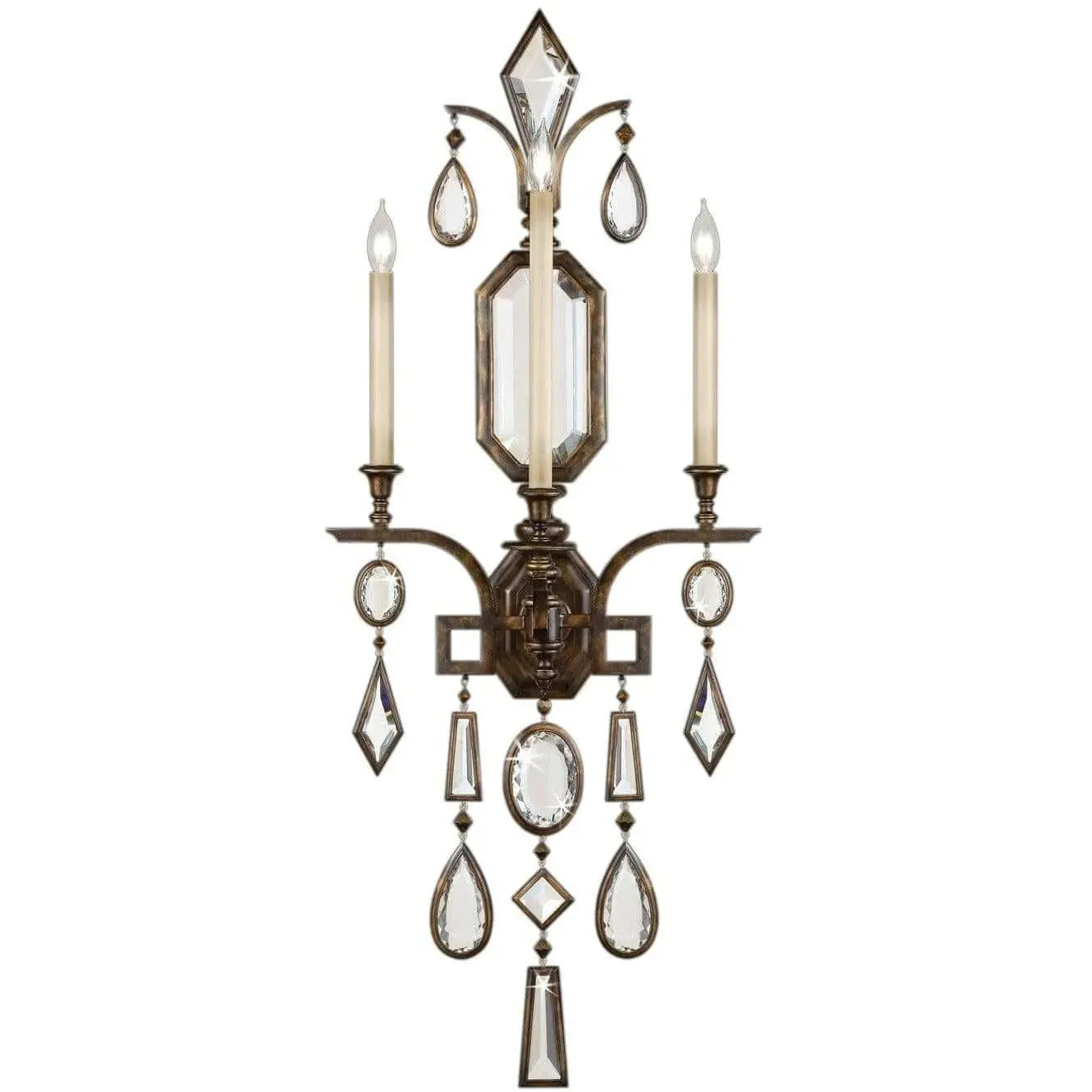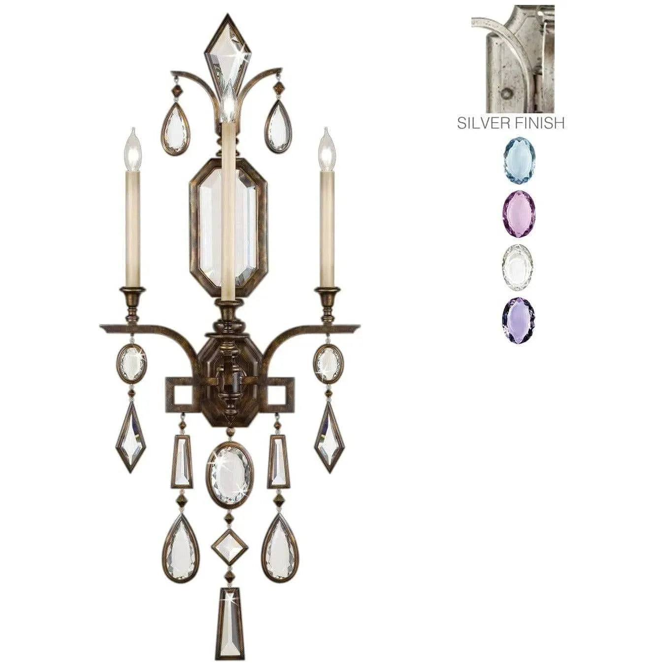 Sconce in venerable bronze patina with multi-colored crystal gems of smoky quartz, brown, amber, emerald and peridot colors.