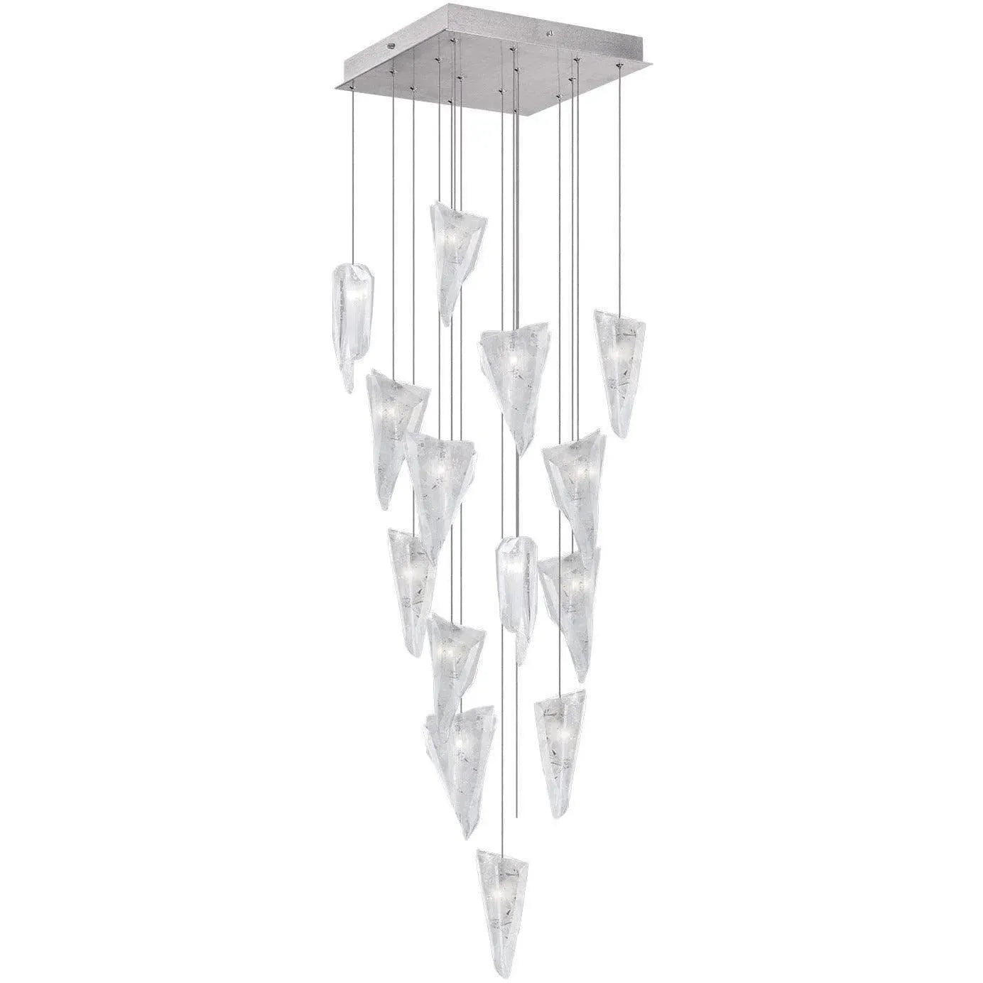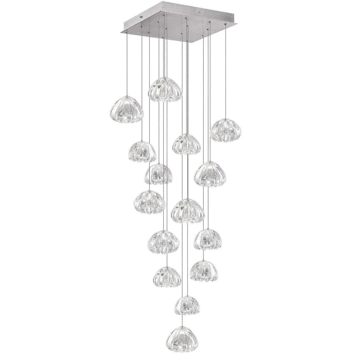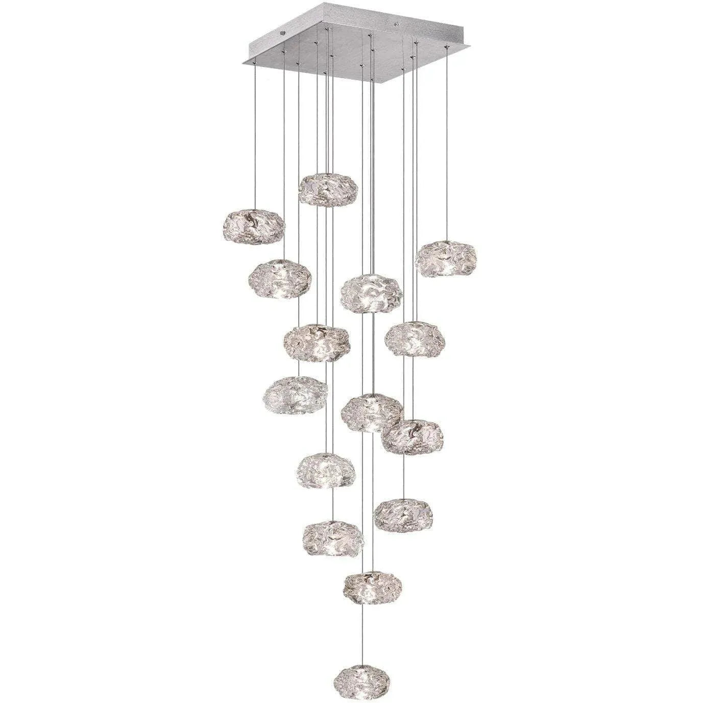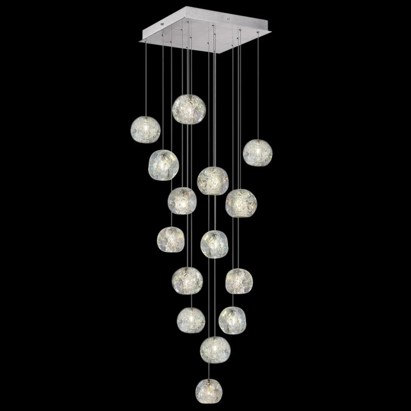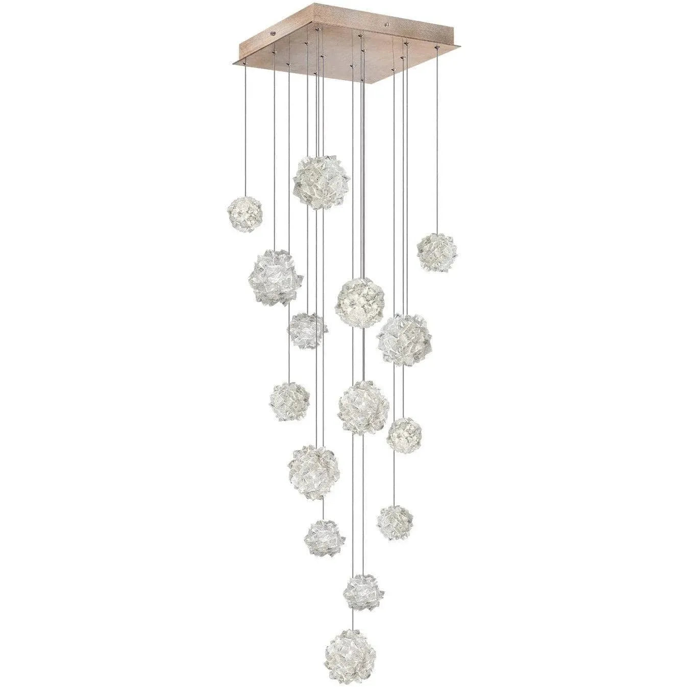 Natural Inspirations 19-Inch 15-Light Pendant by Fine Art Handcrafted Lighting reinterprets organic form into a refined, architectural fixture. Fifteen clear cluster glass orbs—each composed of hand-arranged random glass shards—cascade from a low-profile rectangular canopy on slender adjustable cables, producing a sculptural column of light that reads as both art and illumination.