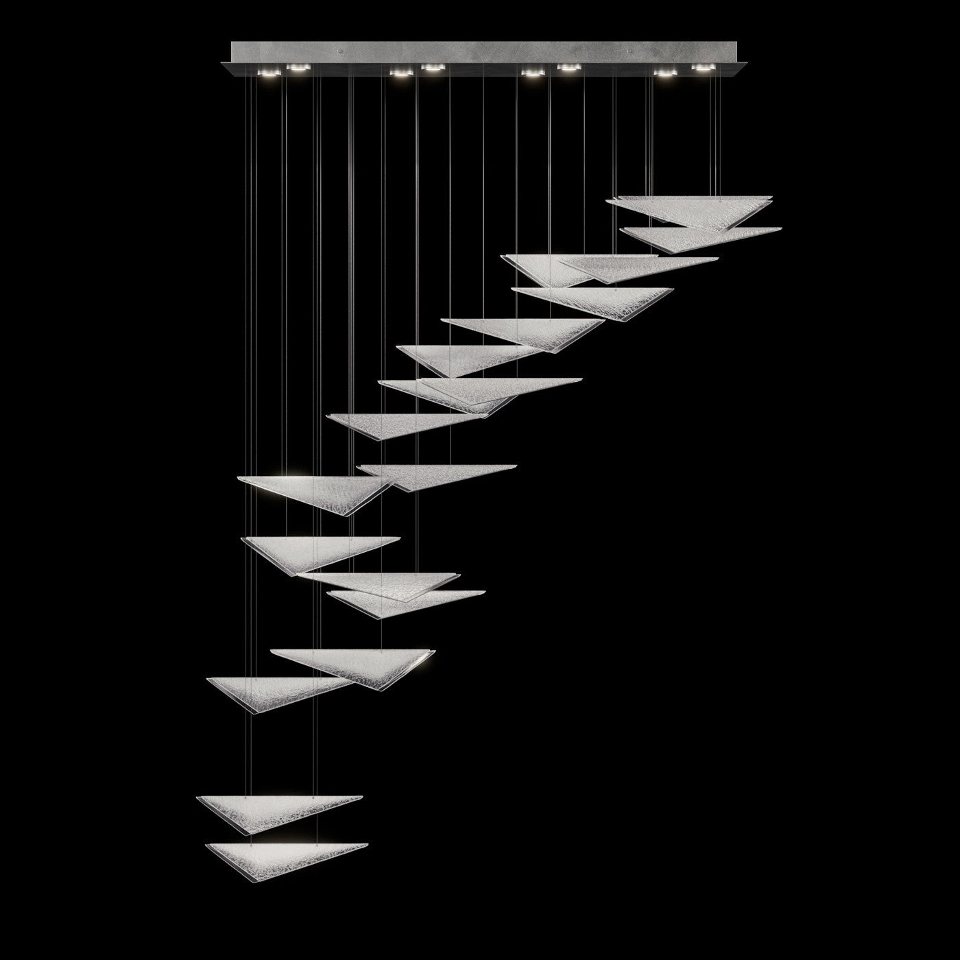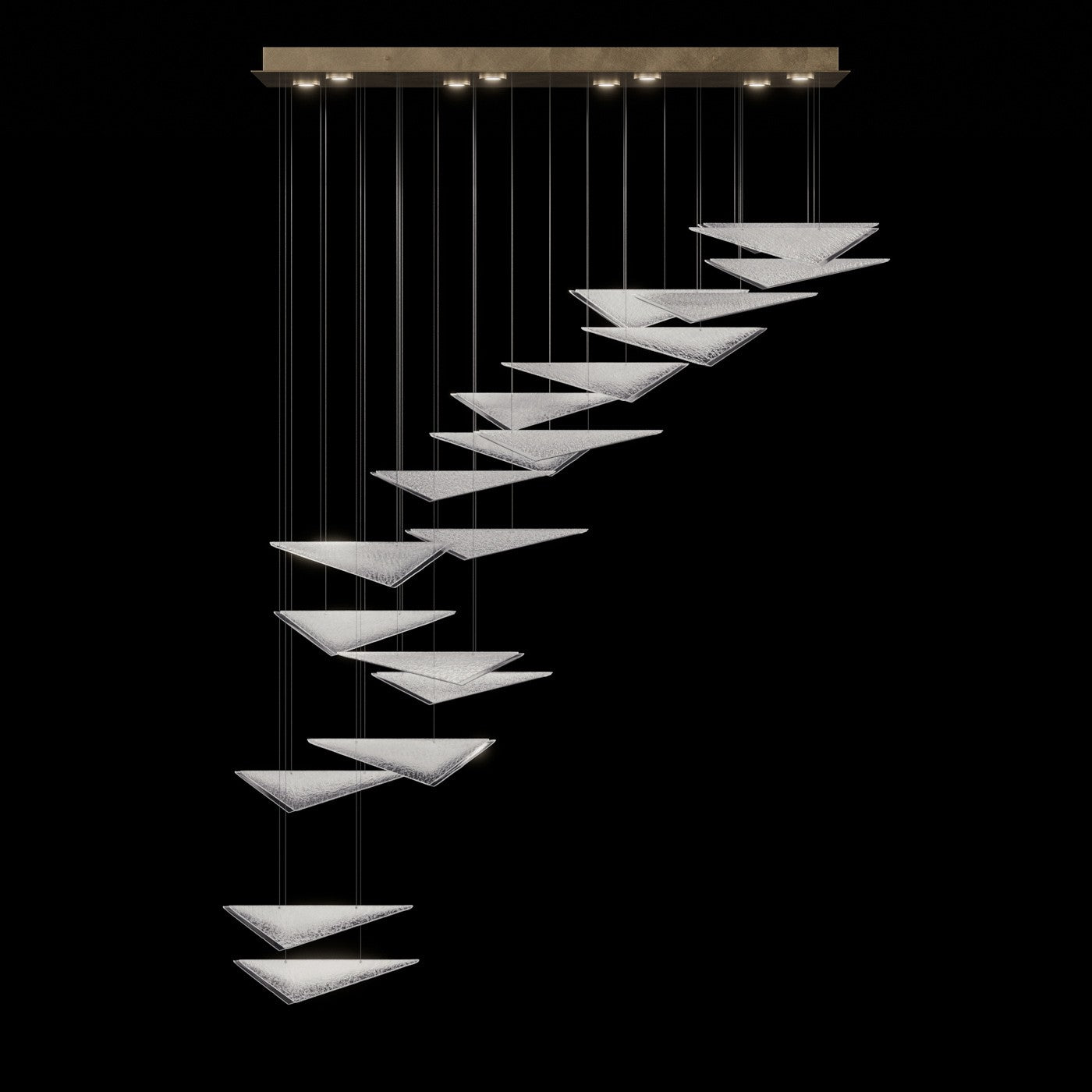Our Volo Collection captures the quiet momentum of flight through cascading geometric forms and customizable, suspended compositions. Handcrafted studio glass—available in clear, smoke, or amber with hammered or linear textures—evokes the interplay of wind, light, and elevation with striking elegance."