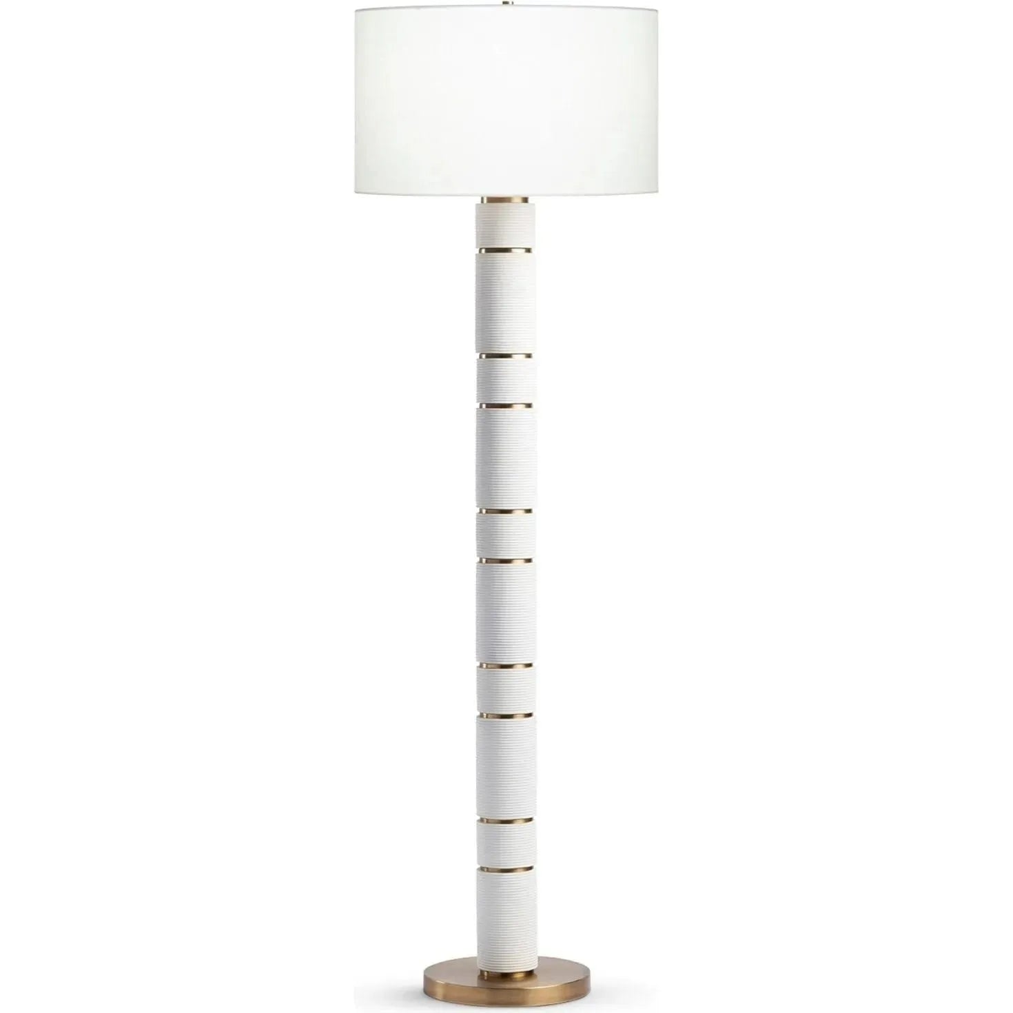 Perfect for adding interest to unused corners, this stylish floor lamp adds essential illumination and ambience to any room in your home. Crafted from poly-resin, the Eton Floor Lamp features a classic silhouette with a round base and a fine ribbed body in an off-white and antique brass finish.