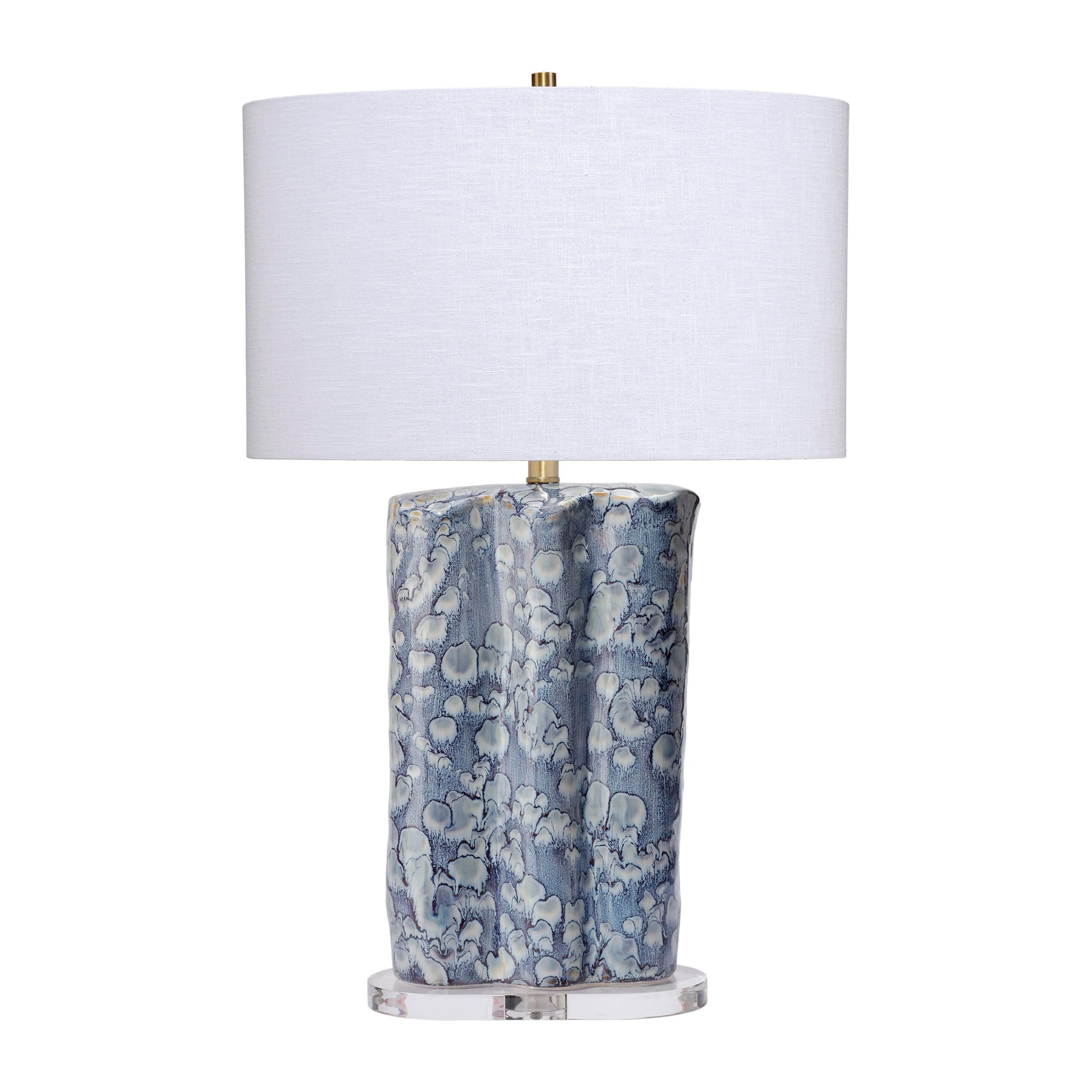 The scalloped body of this ceramic lamp is finished with reactive glazes that have been expertly fired to create vibrant patterns, masterfully updating the traditional blue and white color scheme. A thick slice of crystal-clear resin grounds the design, which is topped with an oval shade in white linen. We love this displayed as a pair on a mantle.