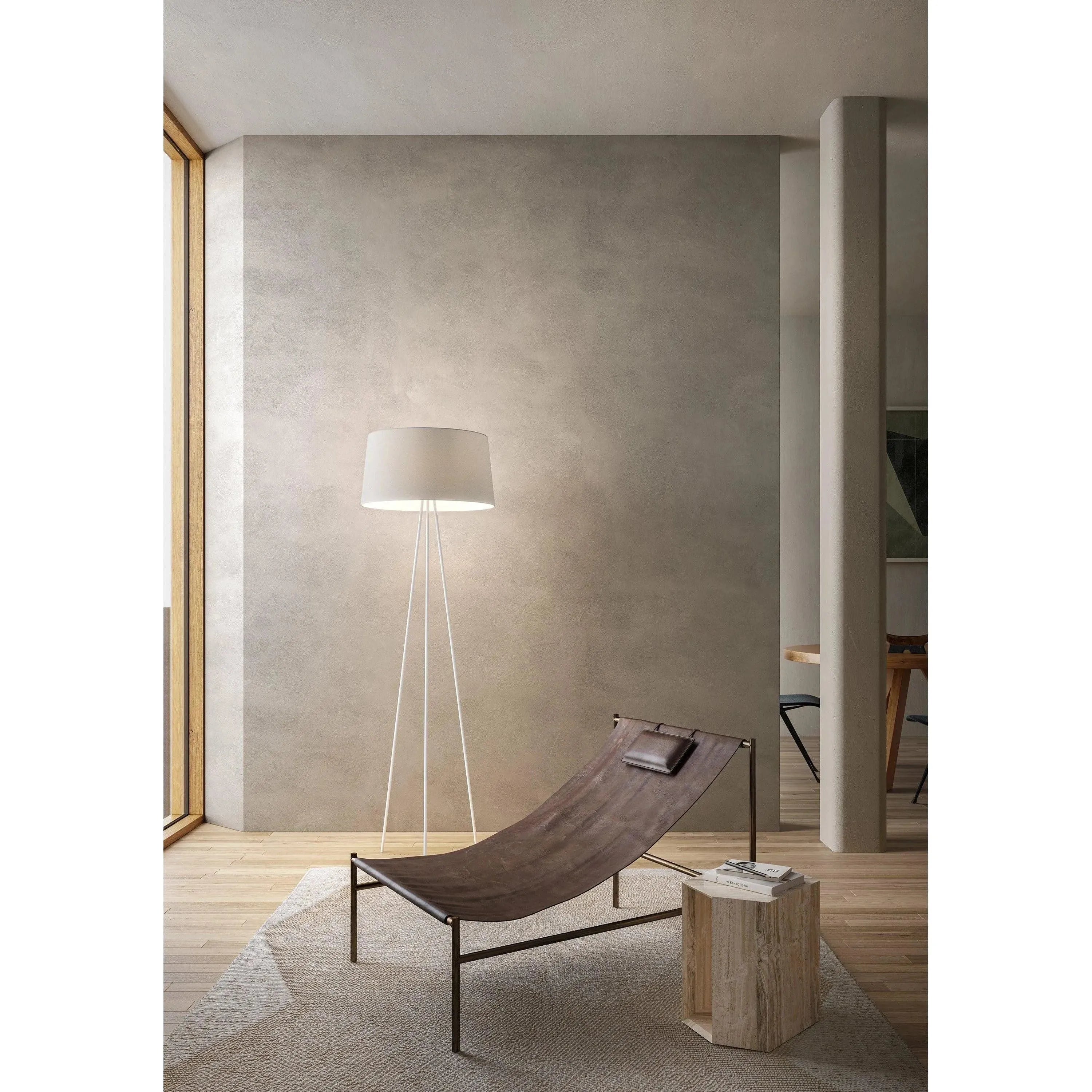 The modular elements of the most classic of lamps become basic and exclusive. Three simple lines for the support and straightforward volume for the fabric lampshade. An ethereal, refined and timeless object.
