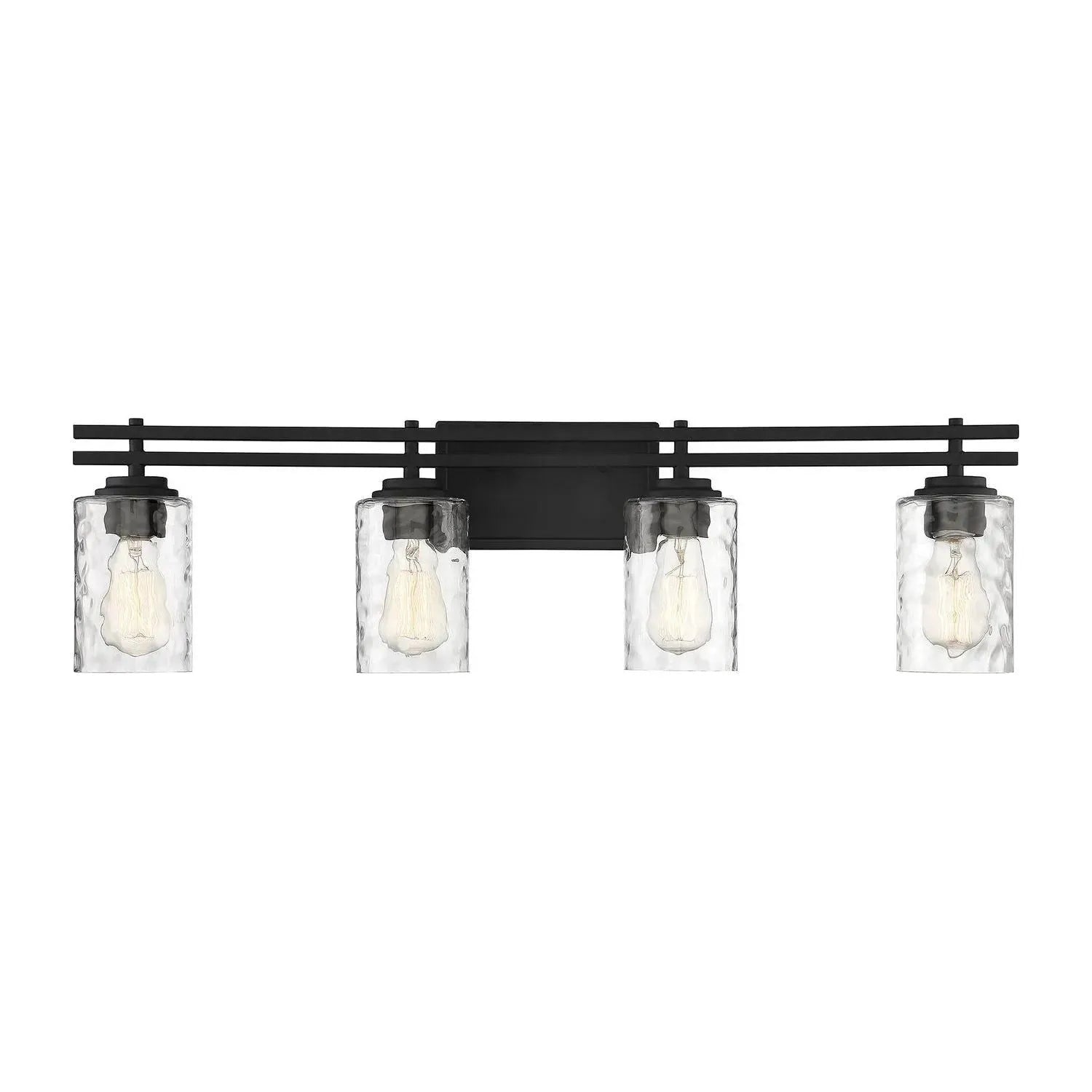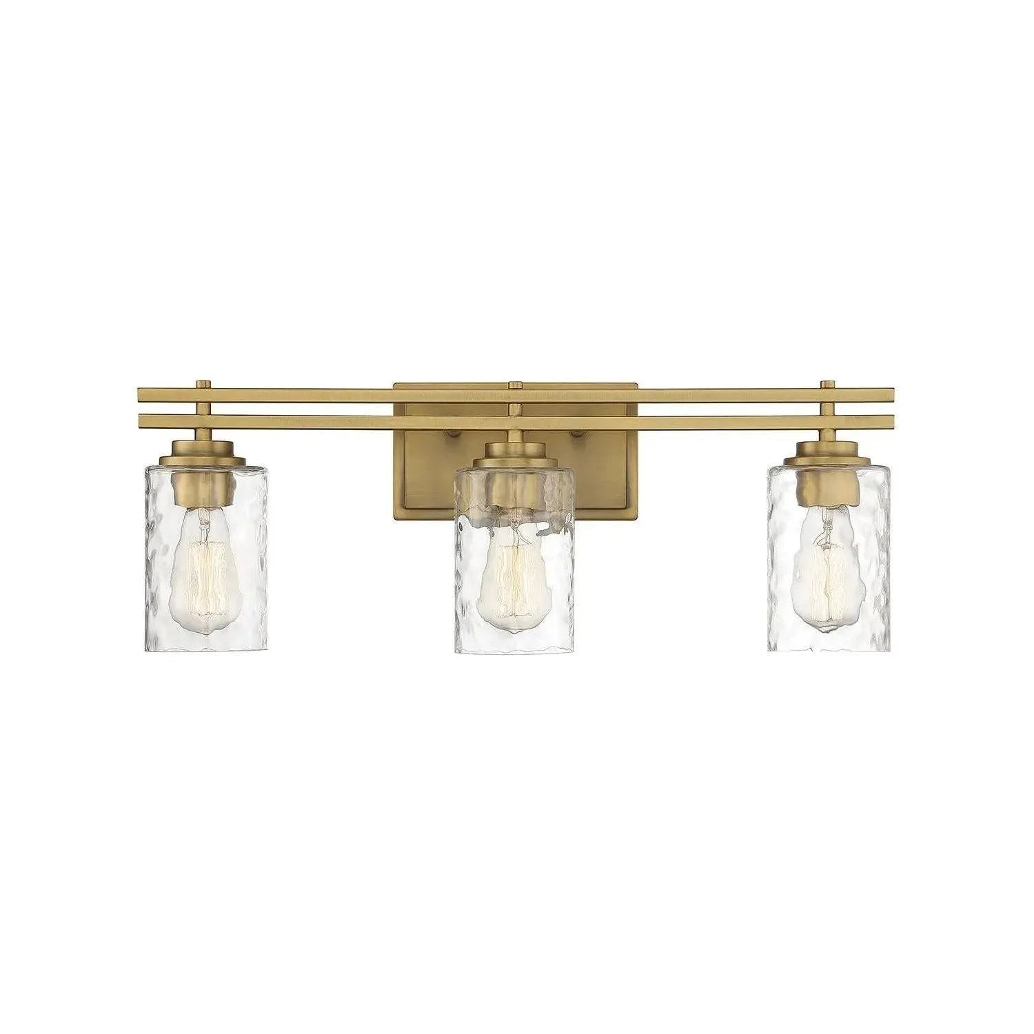 Clean, modern composition meets artisanal detail — the Baxter Bath Bar by Savoy House, available through Montreal Lighting & Hardware. Designed for refined bathrooms and powder rooms, this two-light fixture pairs warm brass metalwork with clear hammered glass shades to deliver focused, sculptural illumination that reads as luxury décor without fuss.