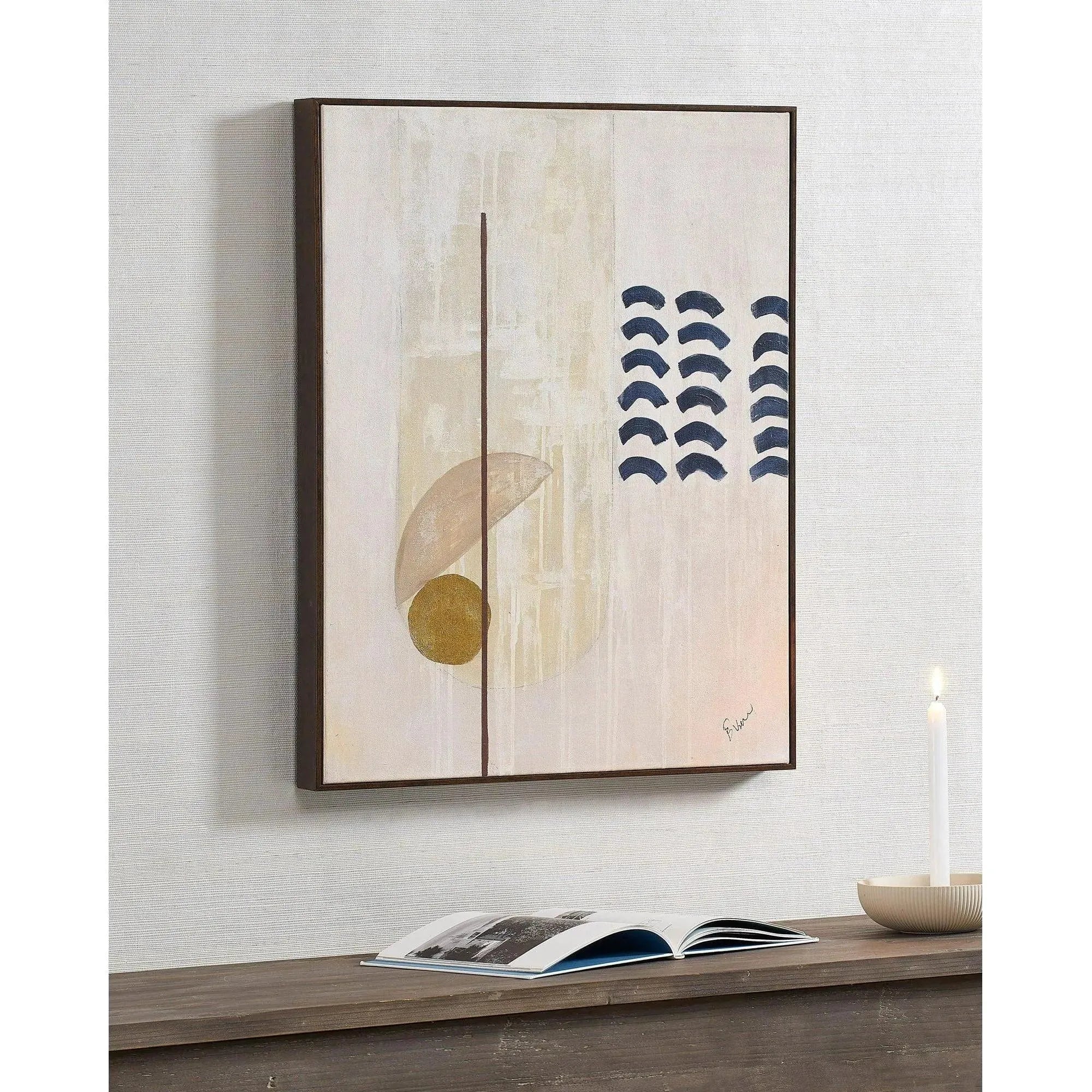 The mid-century modern interior is injected with character when this work of art enters the space. Gold foil embellishment and hand-painted textured painting make for a perfect pair of striking and serene designs. The dark brown flush frame has a warmth that balances out the abstract details of navy blue and gold set on the canvas.