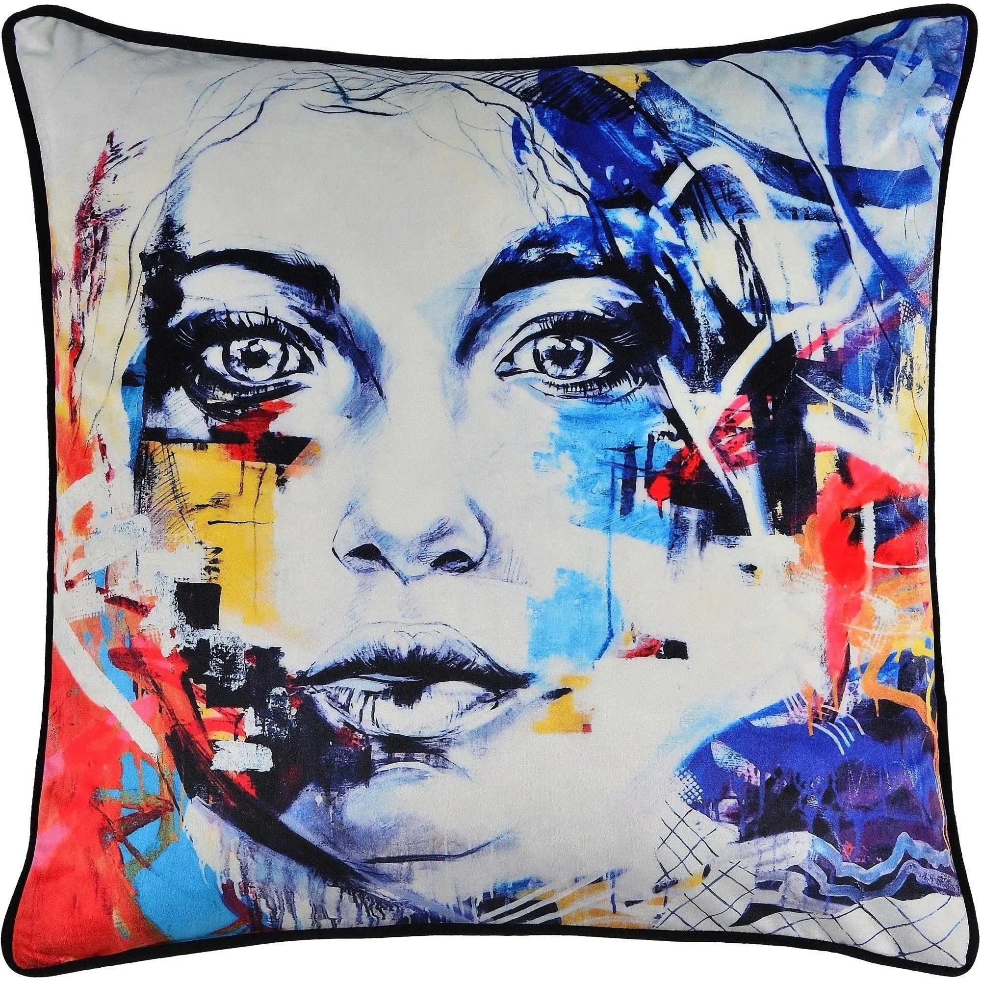 This captivating throw pillow design is a bold and exciting choice. While the portrait serves as the focal point on its velvet exterior, the intricate corners enhance its presence. Placed within the creative interior, it stands out in style.