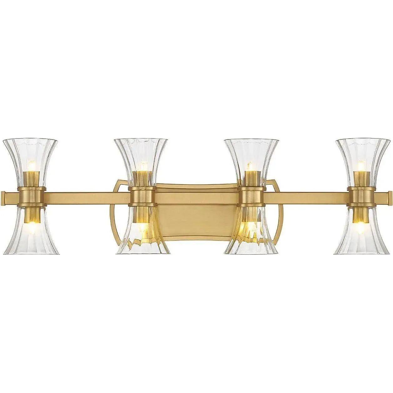 This Savoy House Bennington 4-light bath vanity light features pleasantly curving shapes that combine to create an intriguing lighting look. Fluted clear glass shades and thoughtful detailing on the structure, finished in warm brass, gives the impression of motion. Bennington is 8.75" in height, 16" in width and extends 6" from the wall. G9 bulbs are included.