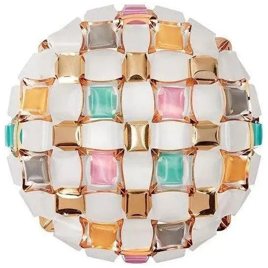Mida is a ceiling/wall lamp with our exclusive magnetic system, inspired by the world of haute couture jewels. A pavè of precious gems encrust an almost invisible setting, and polished cabochon are geometrically scattered across a floral corolla with silky, iridescent stones. Available in five color combinations, from the flashy Multicolor, to the more versatile White/Platinum and White/Gold. Mida is fully handcrafted of white Opalflex® and printed Lentiflex®, whose silky morphing effect alternates with the brushed metallized “gems”. Mida makes any room extra-luxurious.